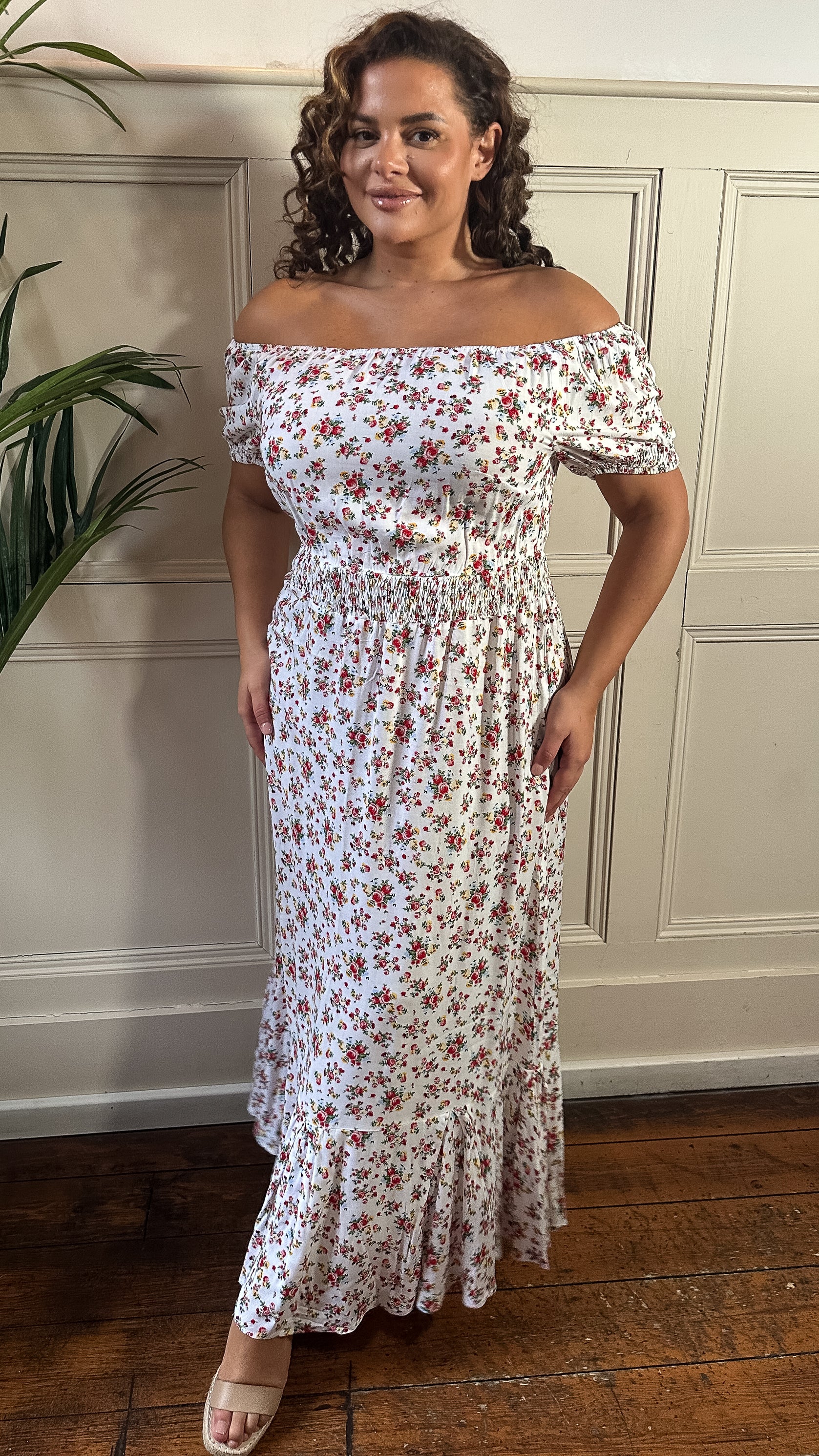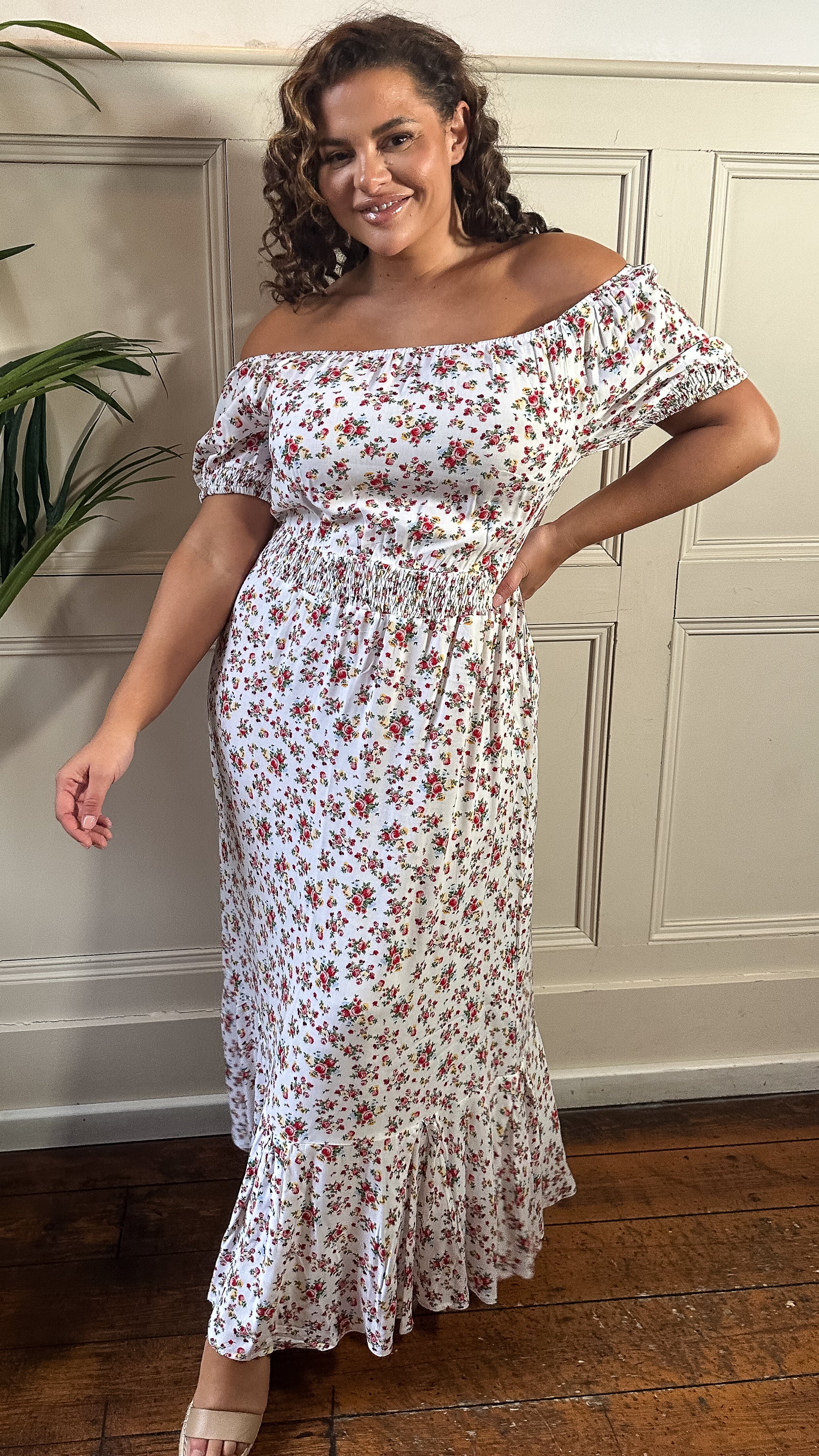 CurveWow Bardot Maxi Dress White Ditsy Floral