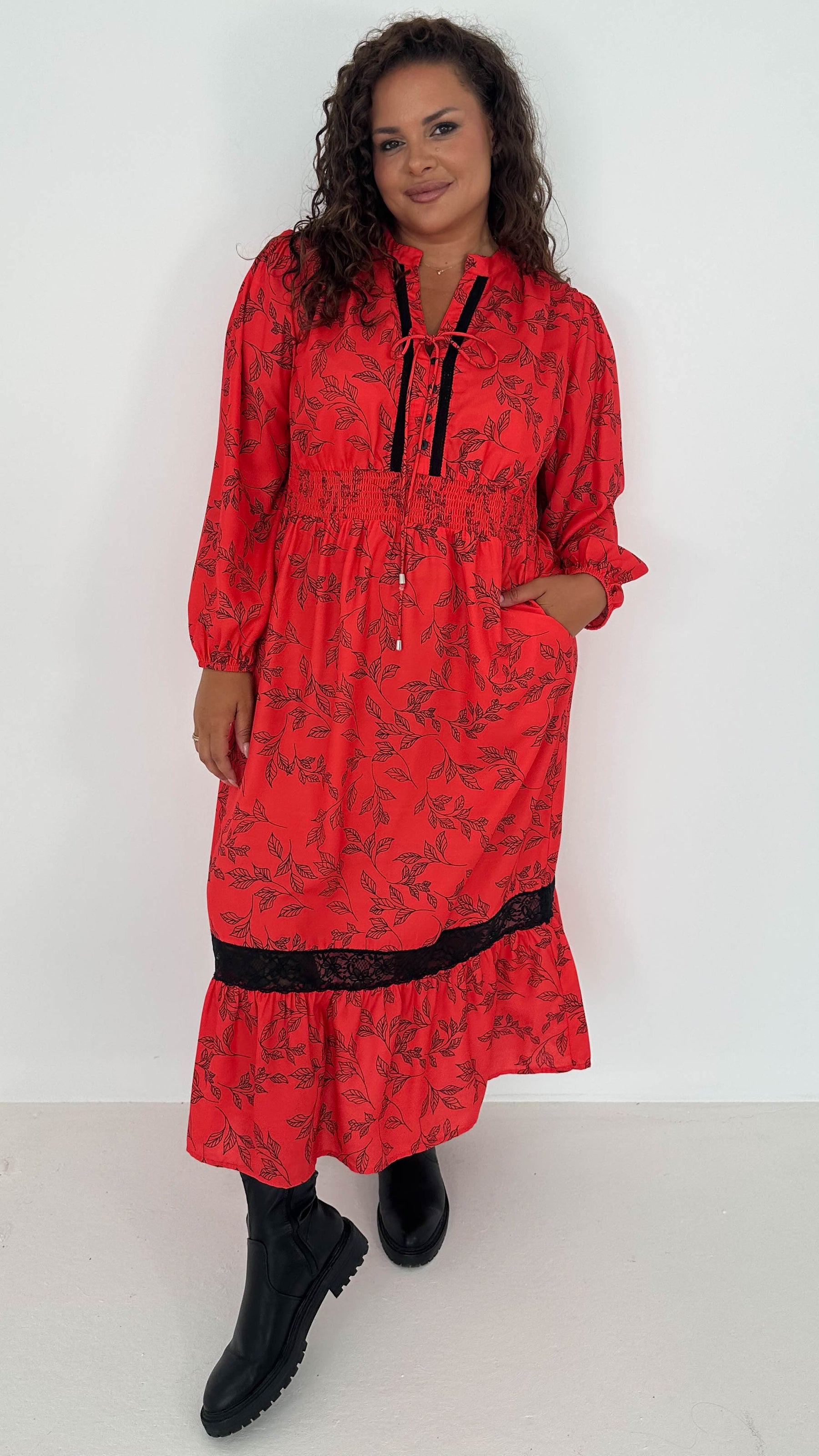CurveWow Lace Insert Printed Midi Dress Red Leaf