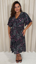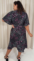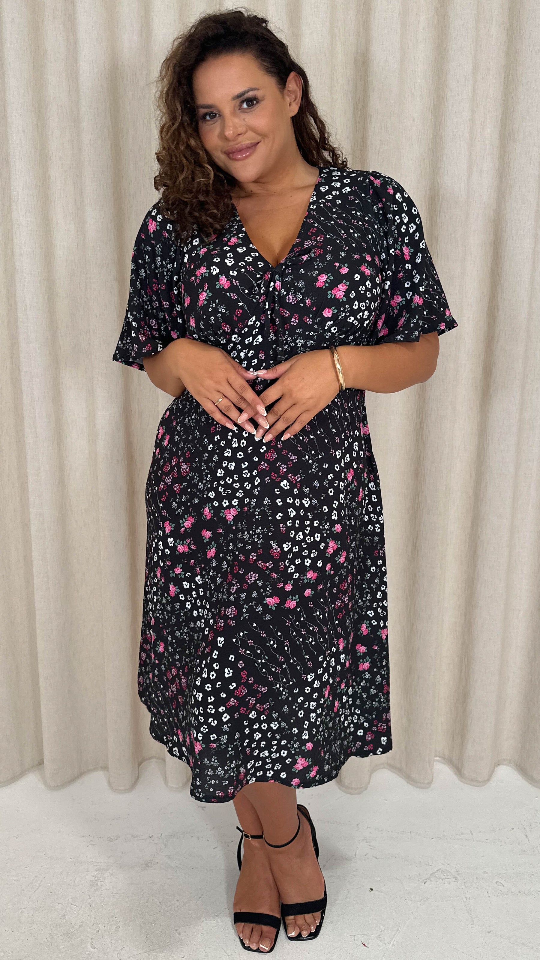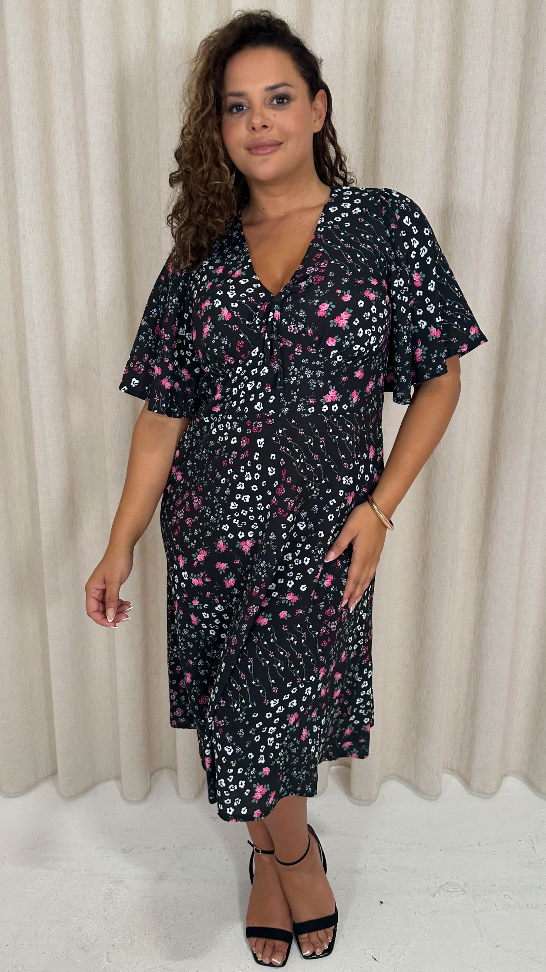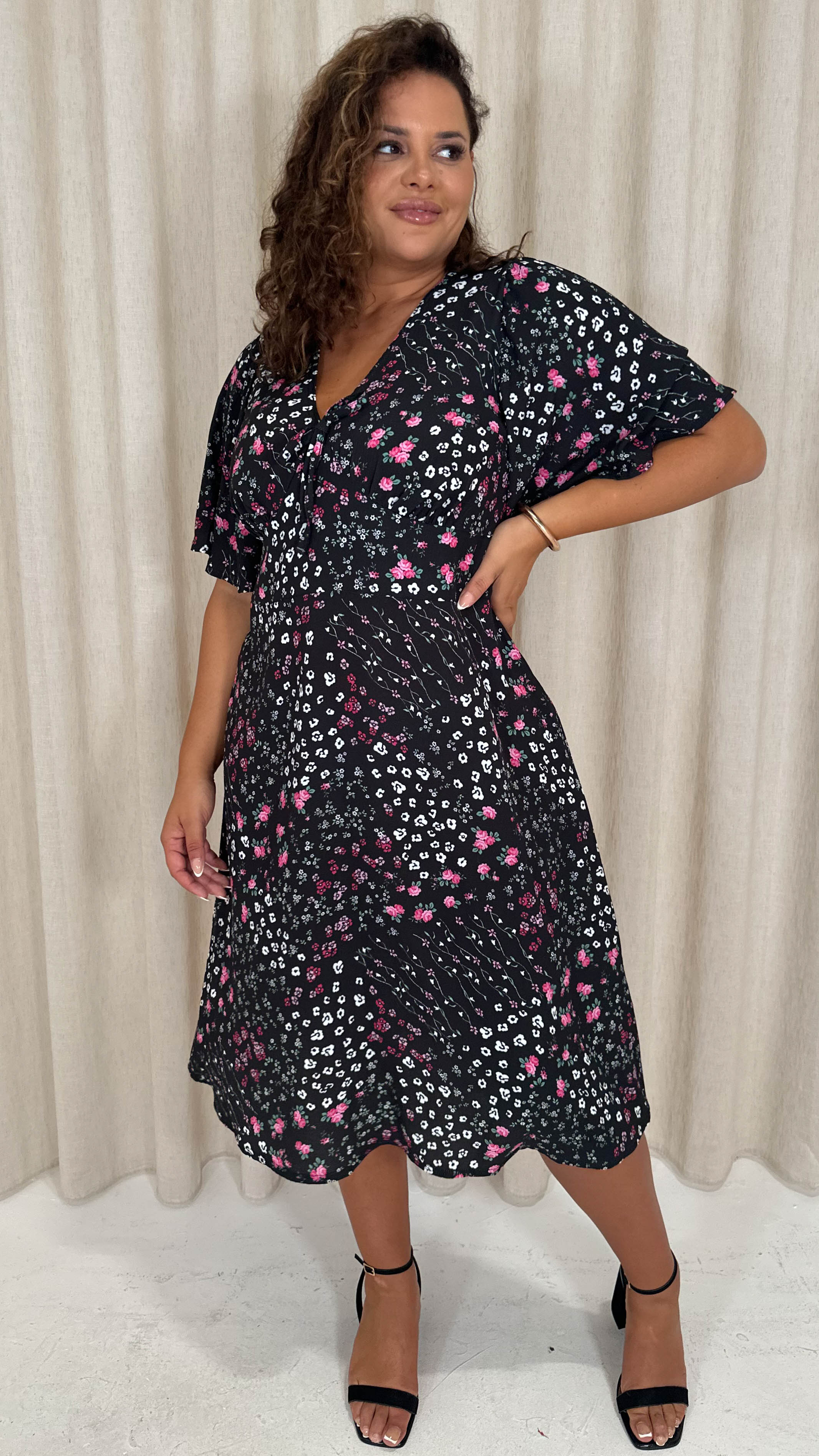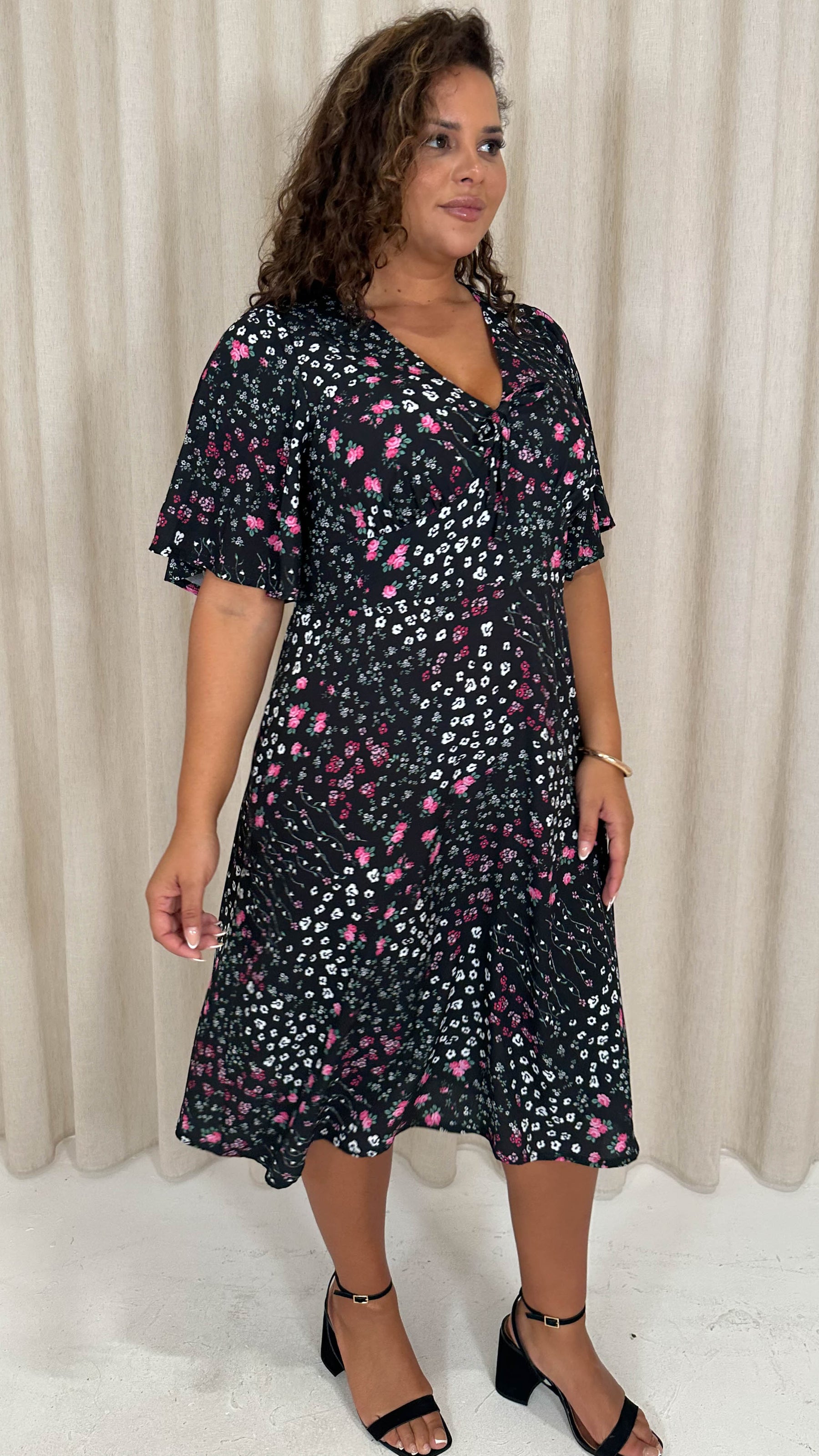 CurveWow Angel Sleeve Flounce Tie Front Midi Dress Black Ditsy