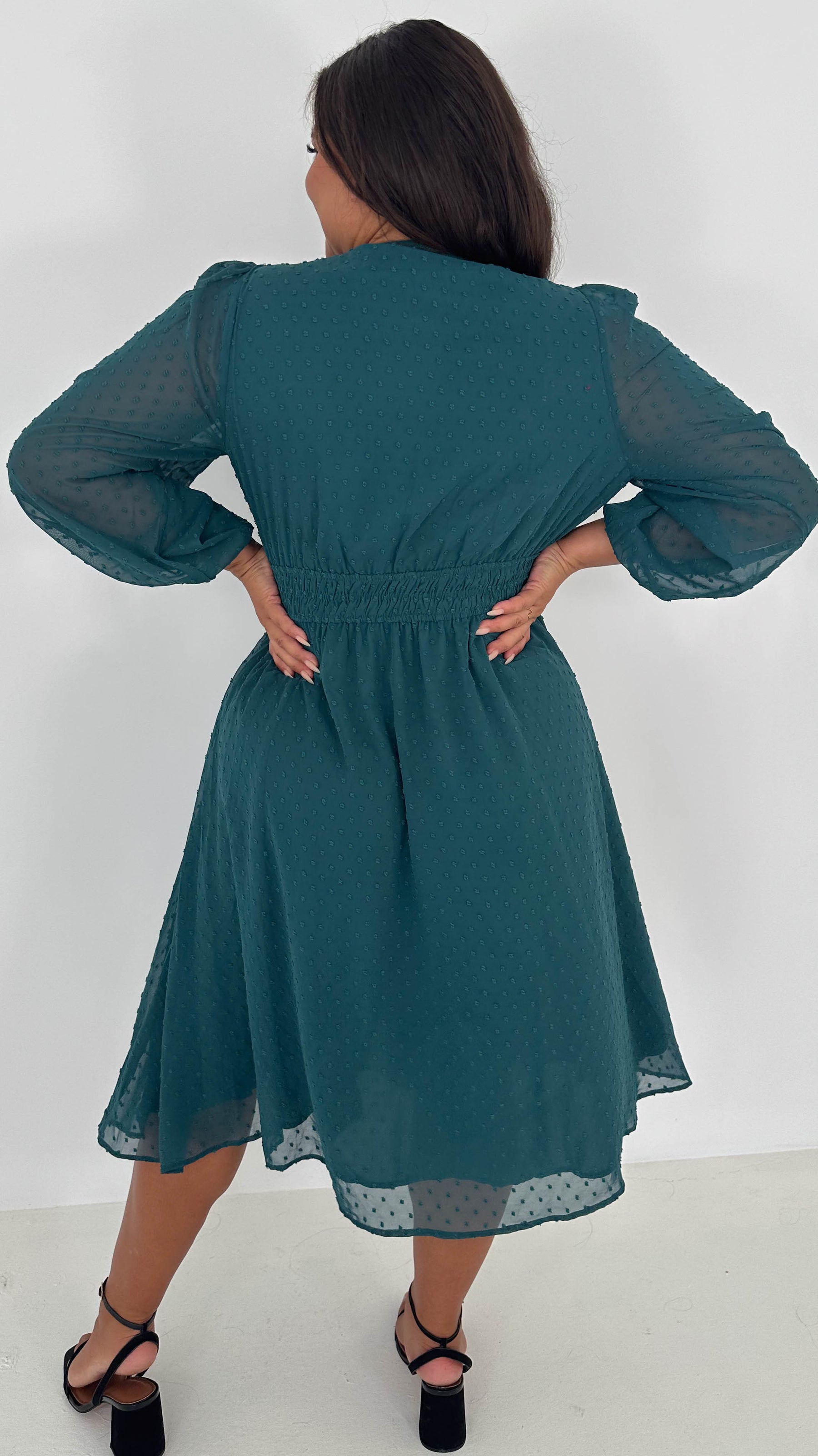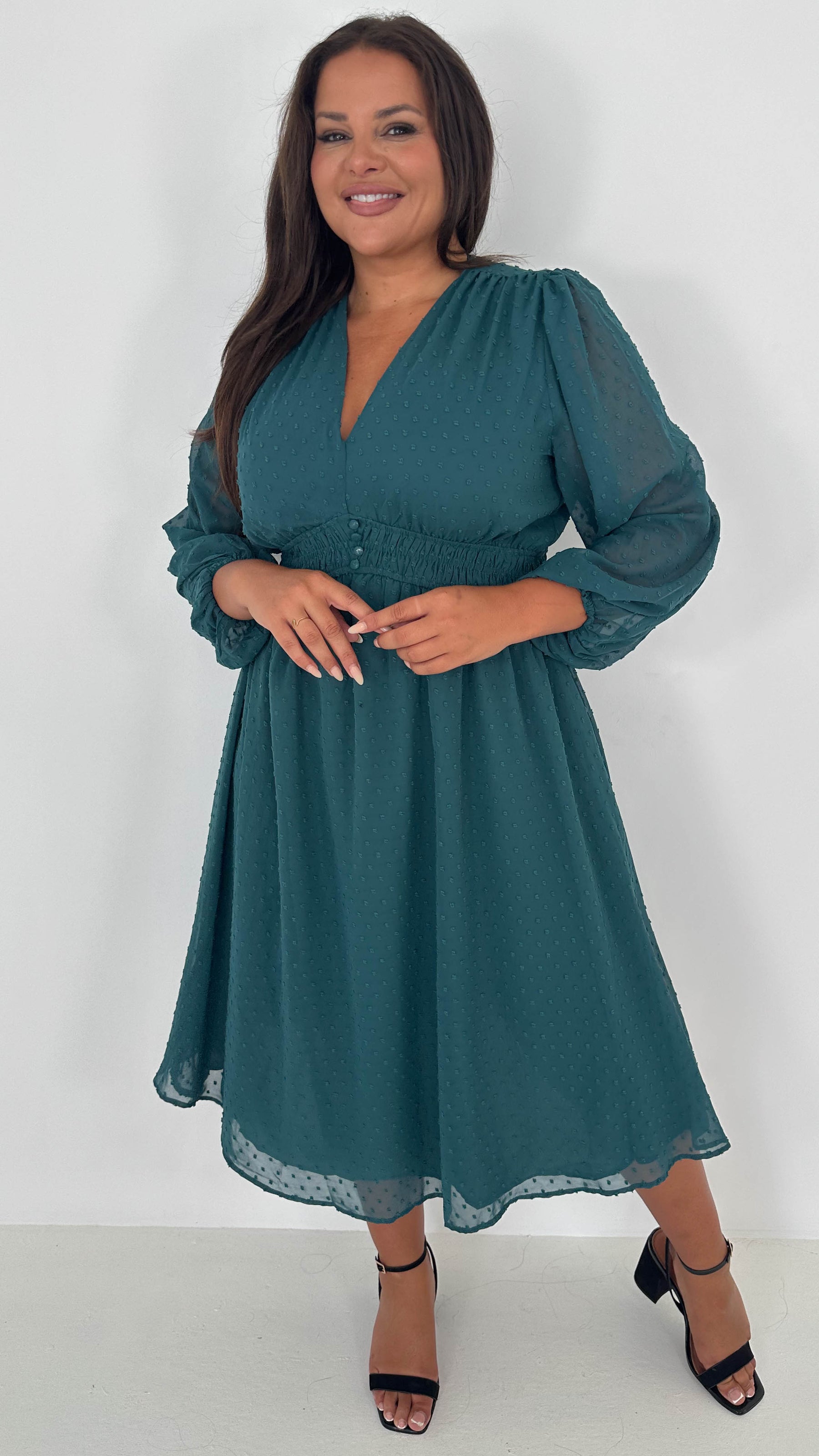 CurveWow Dobby Shirred Bodice Midi Dress Forest Green