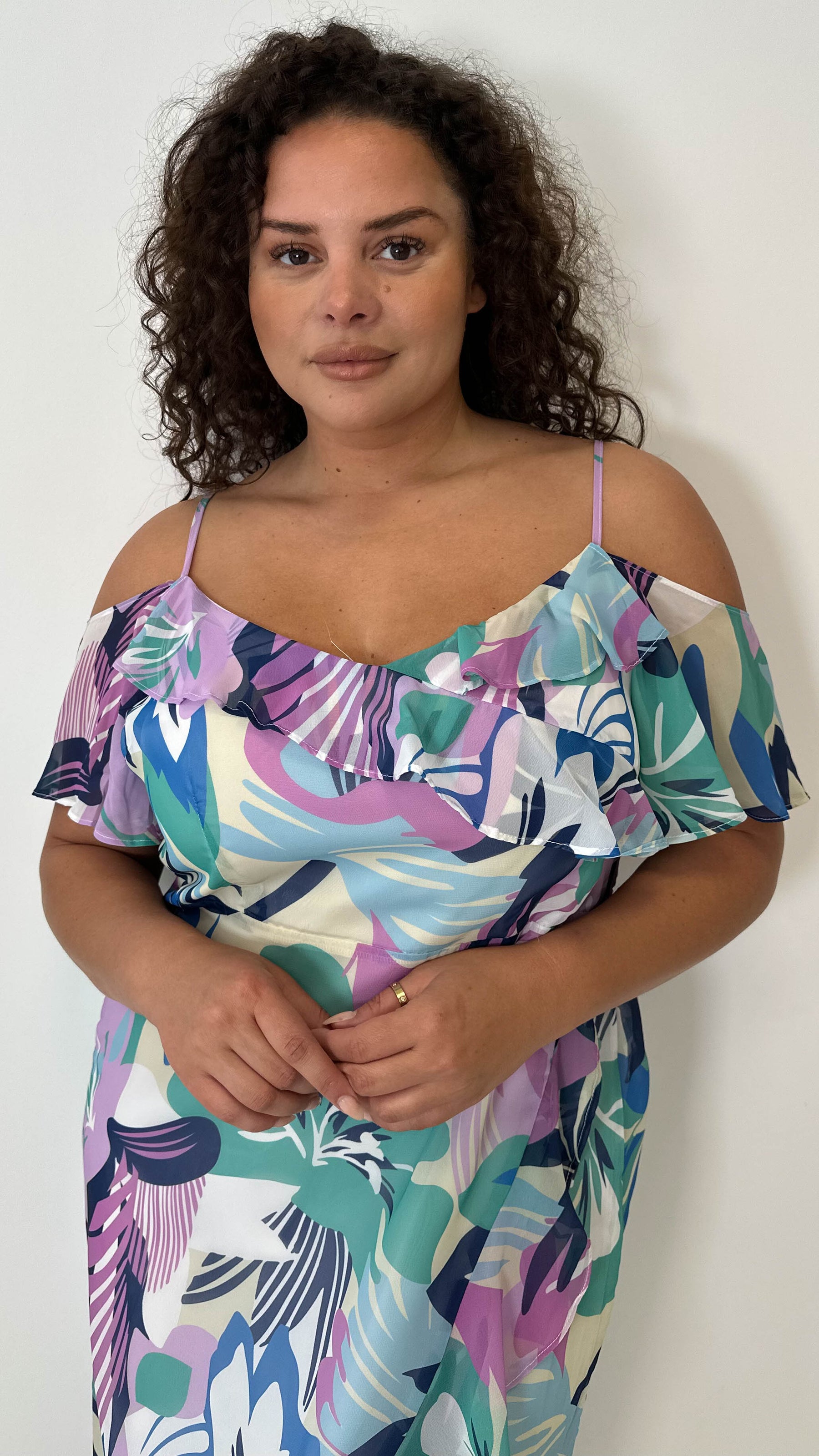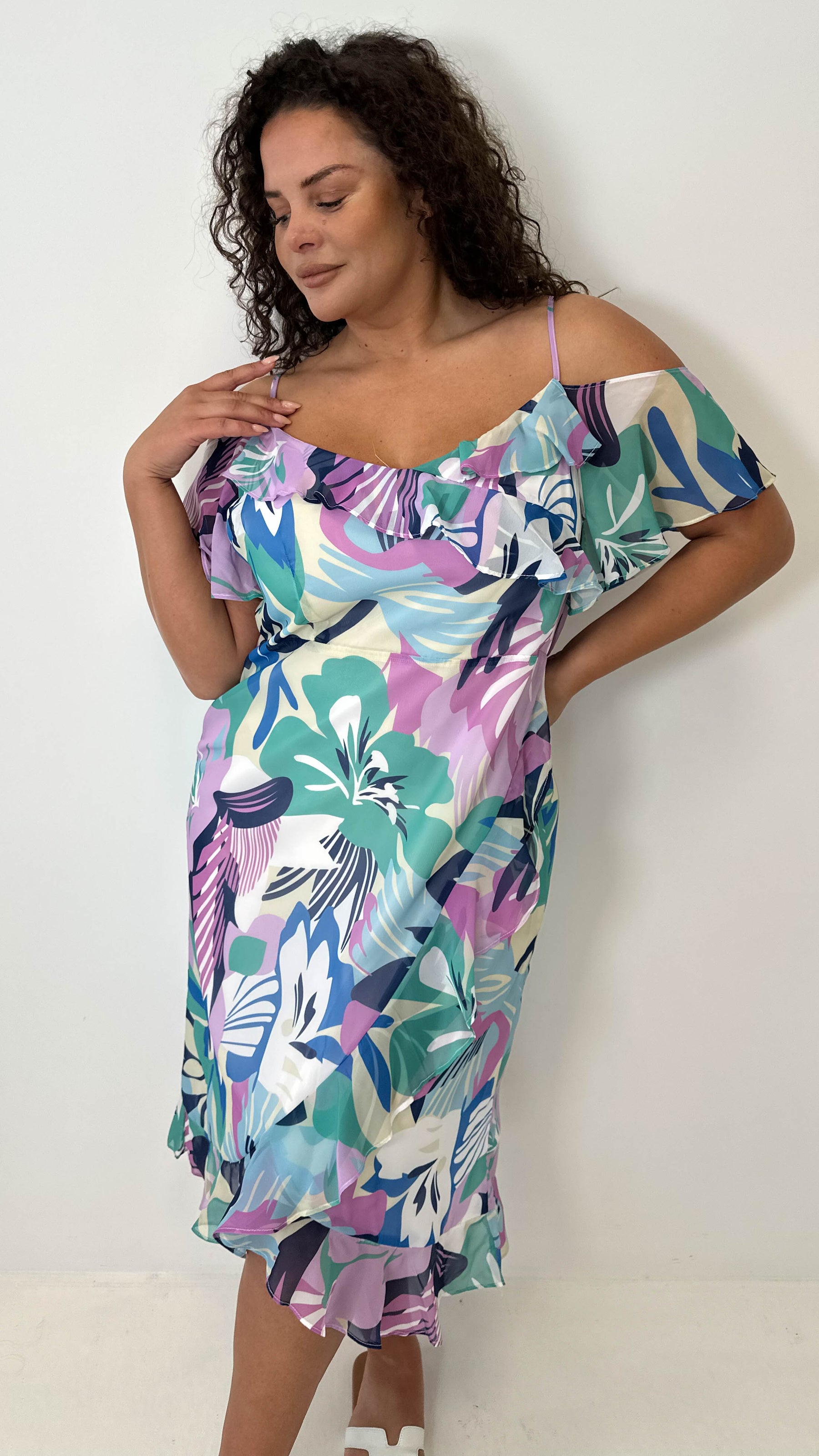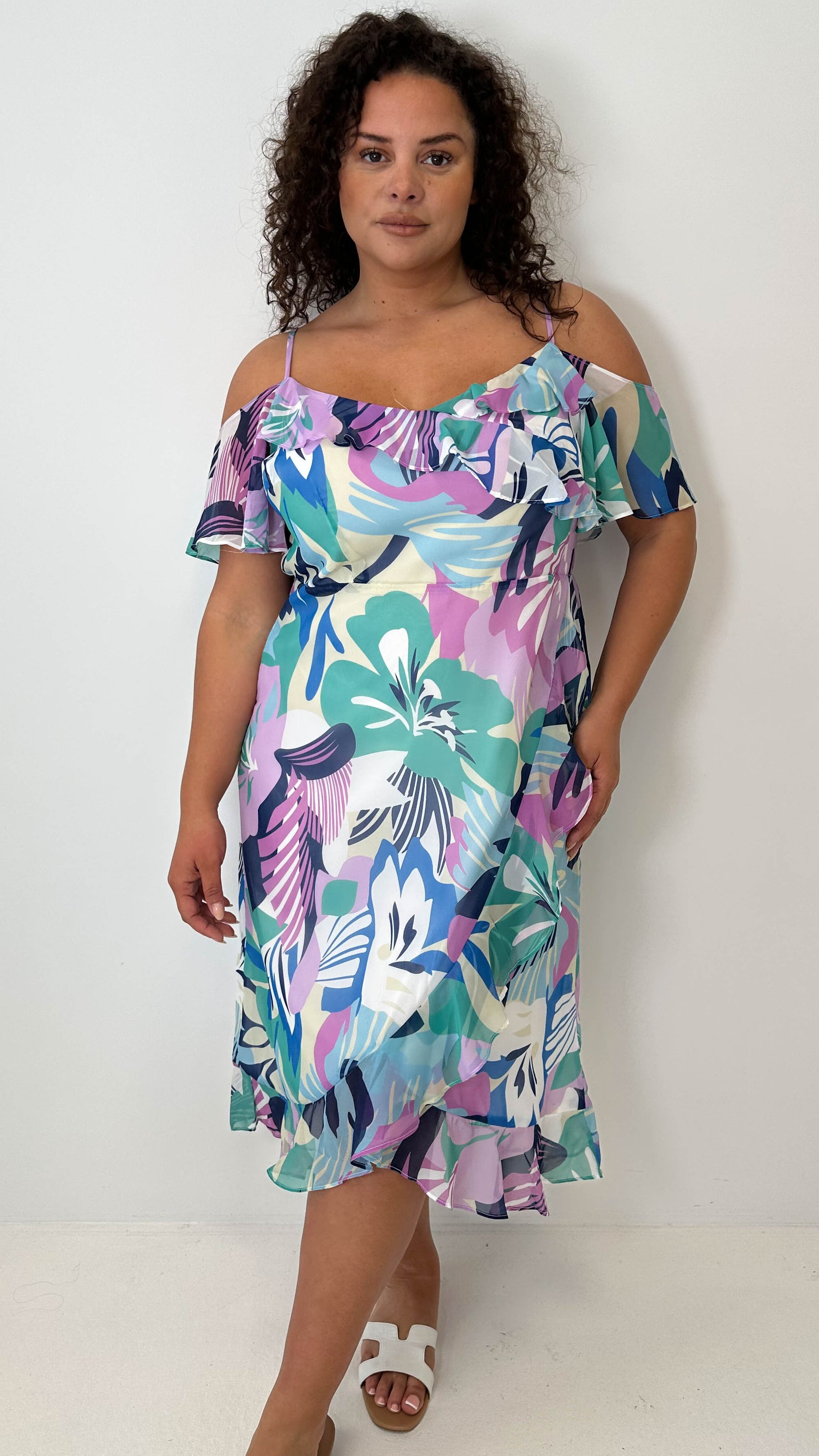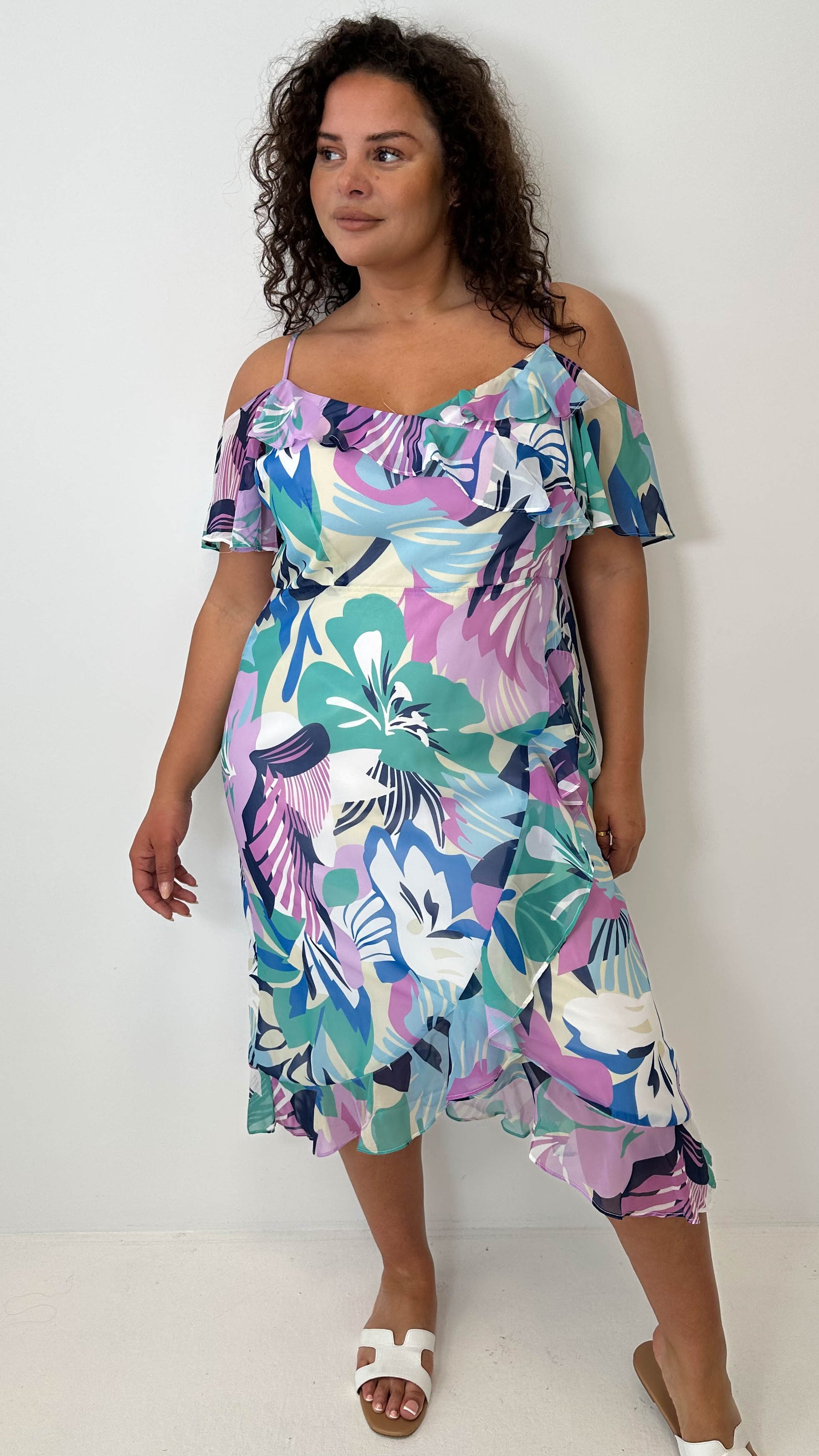 CurveWow Floral Frill Cold Shoulder Dress Multi Floral