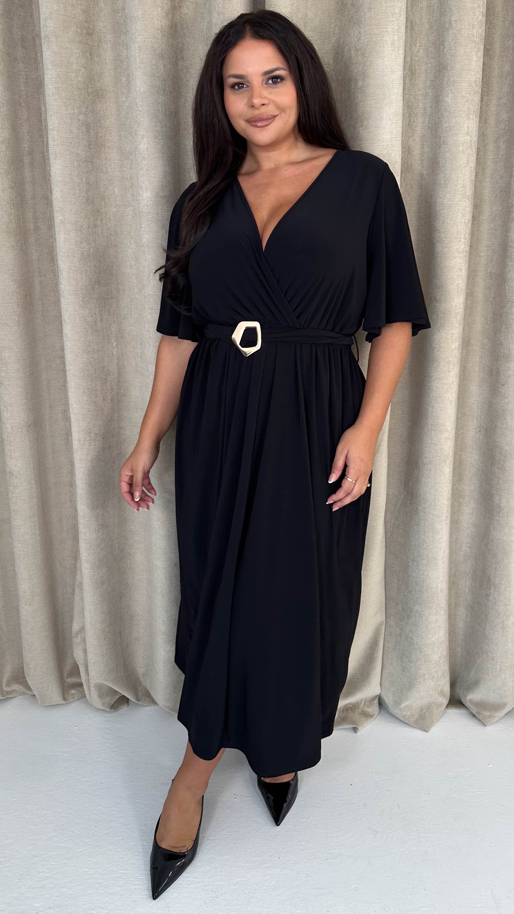 CurveWow Irregular Buckle Split Front Wrap Dress Black