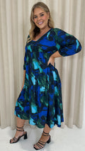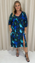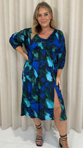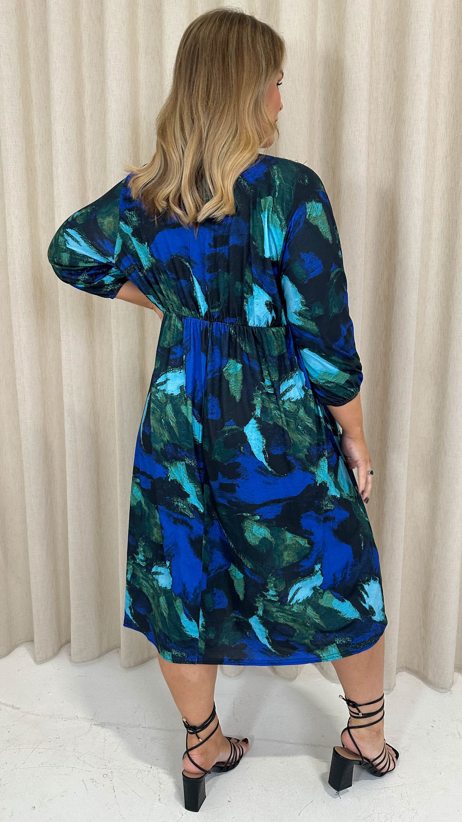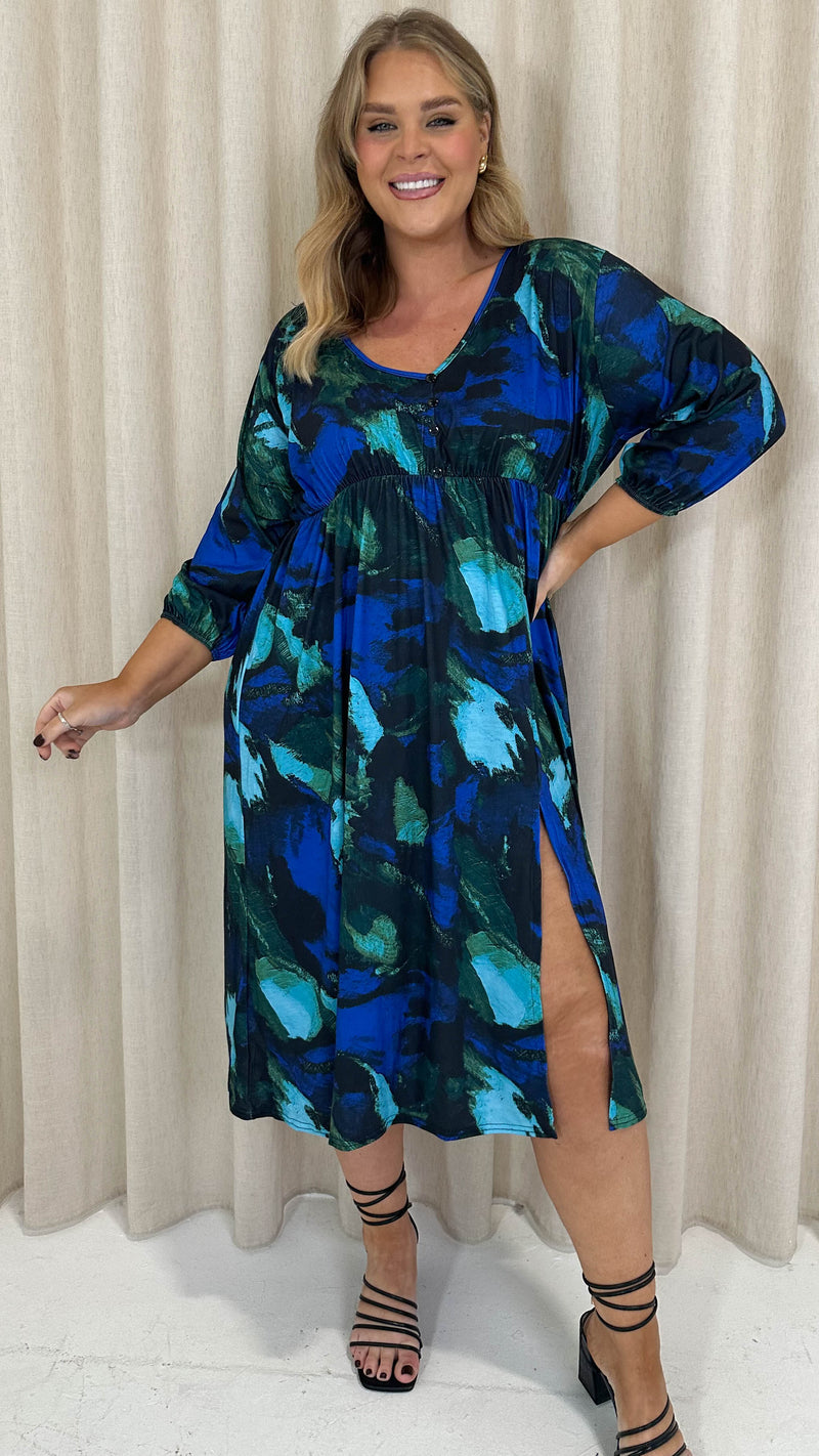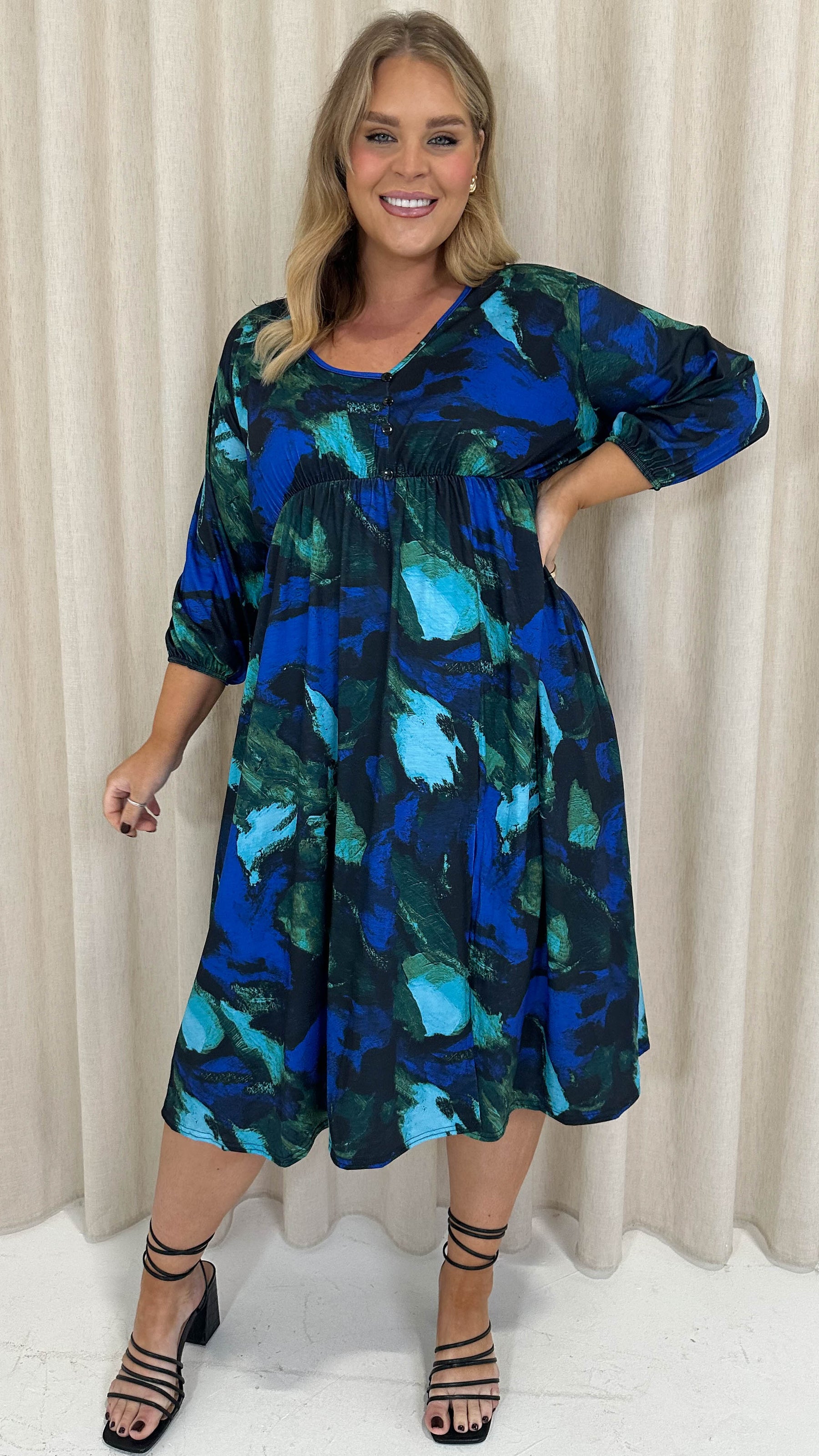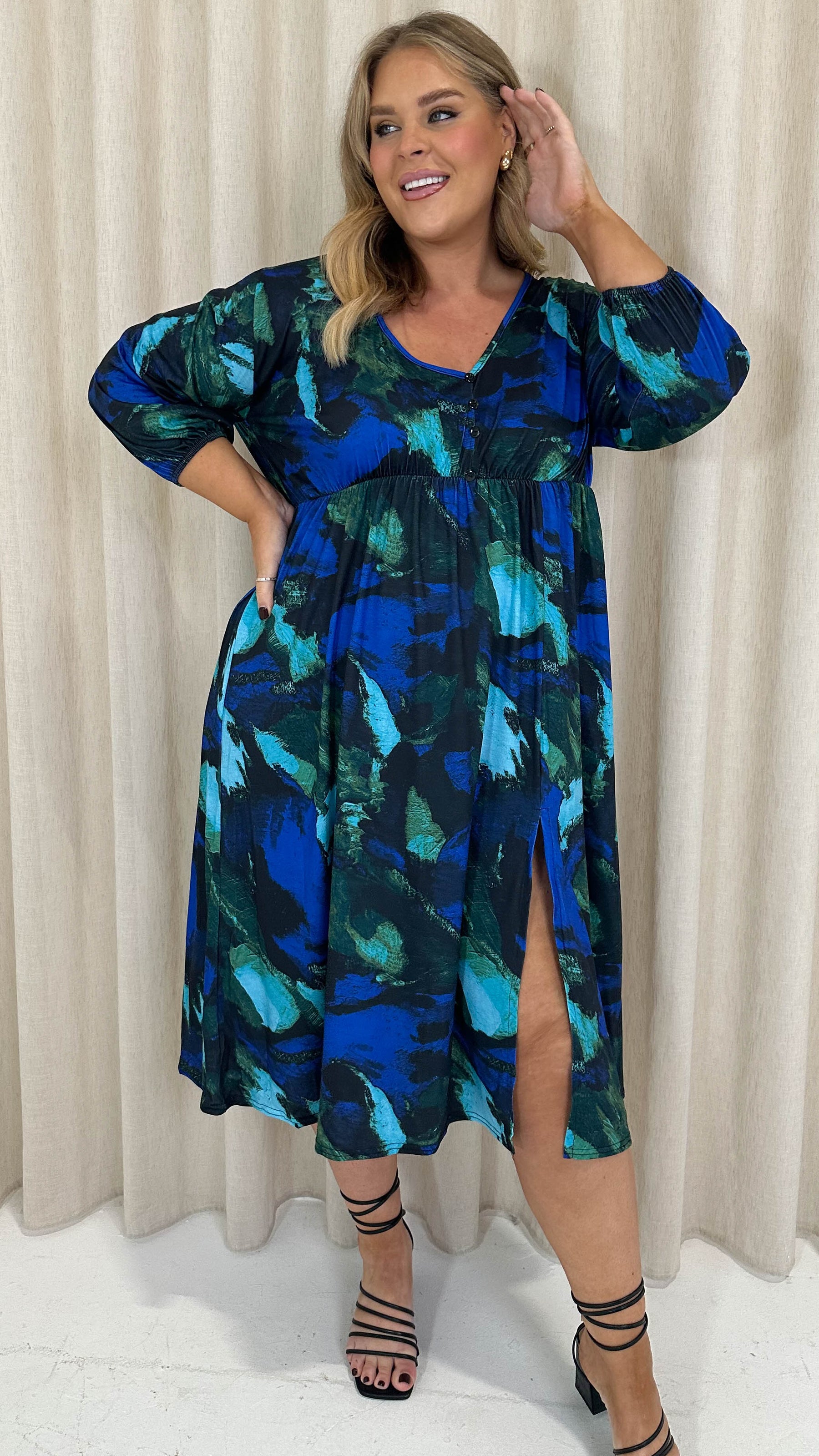 CurveWow Button Front Midi Dress Blue Brush Stroke