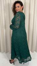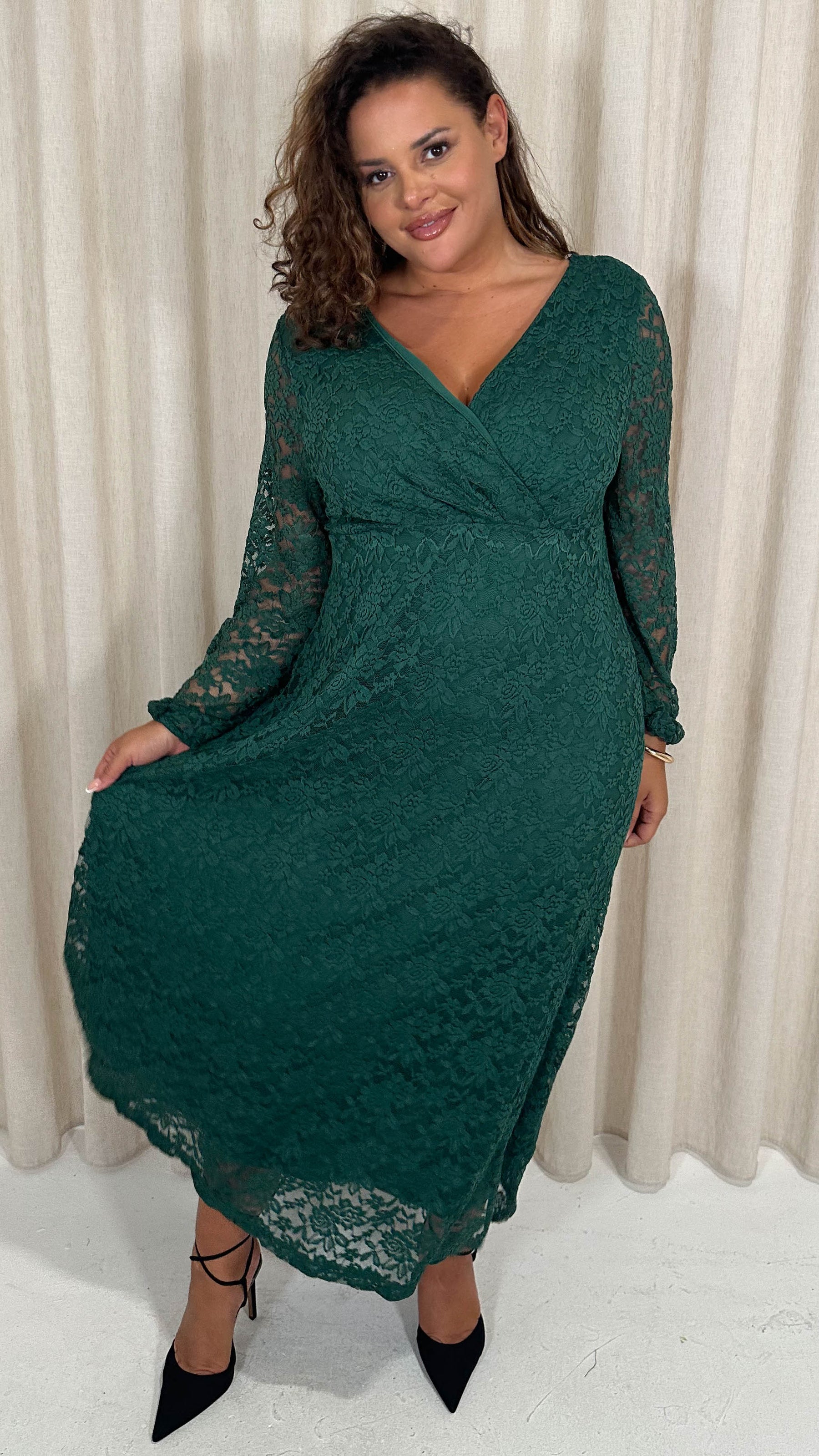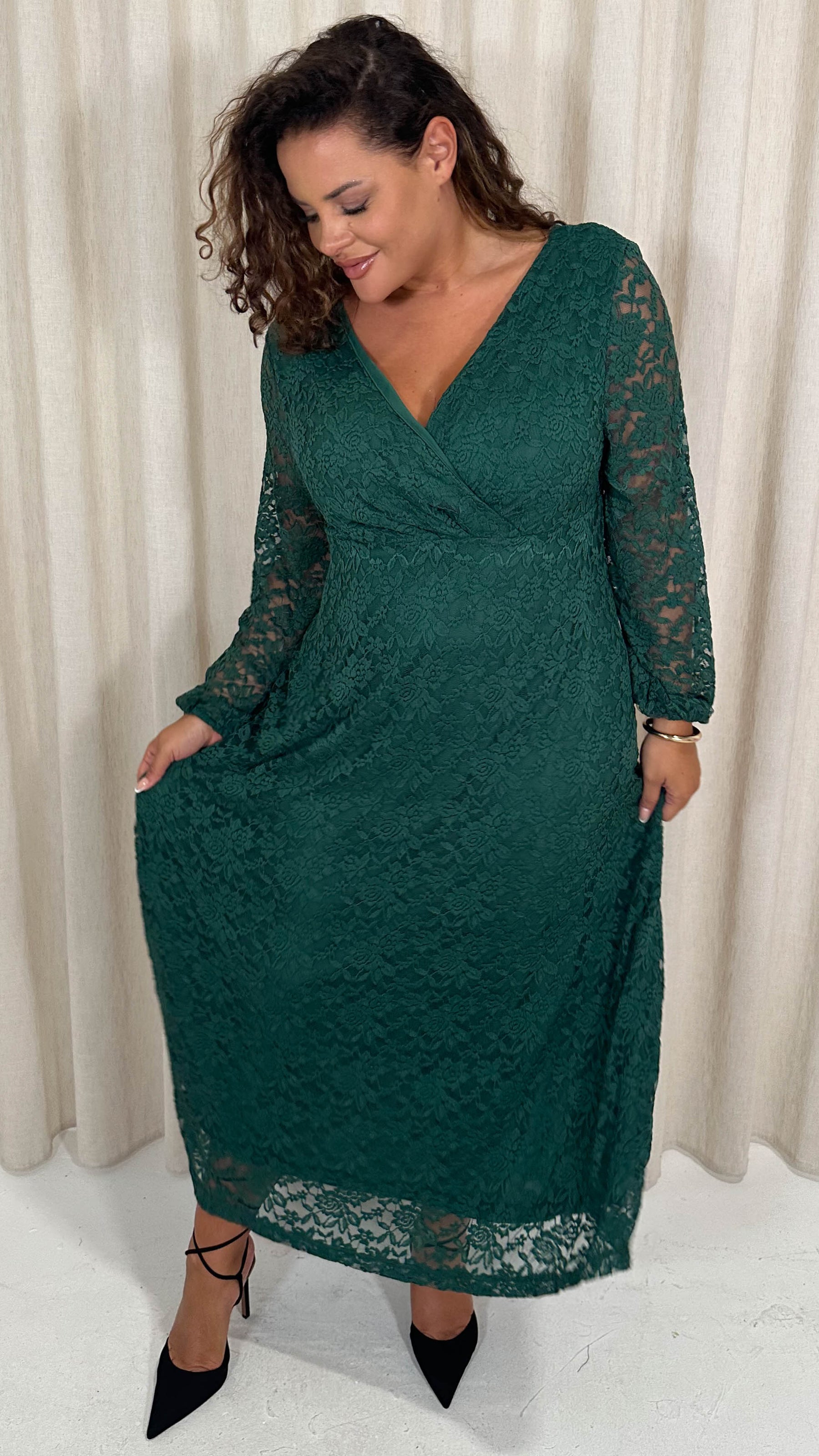 CurveWow Lace Plunge Maxi Dress Forest Green