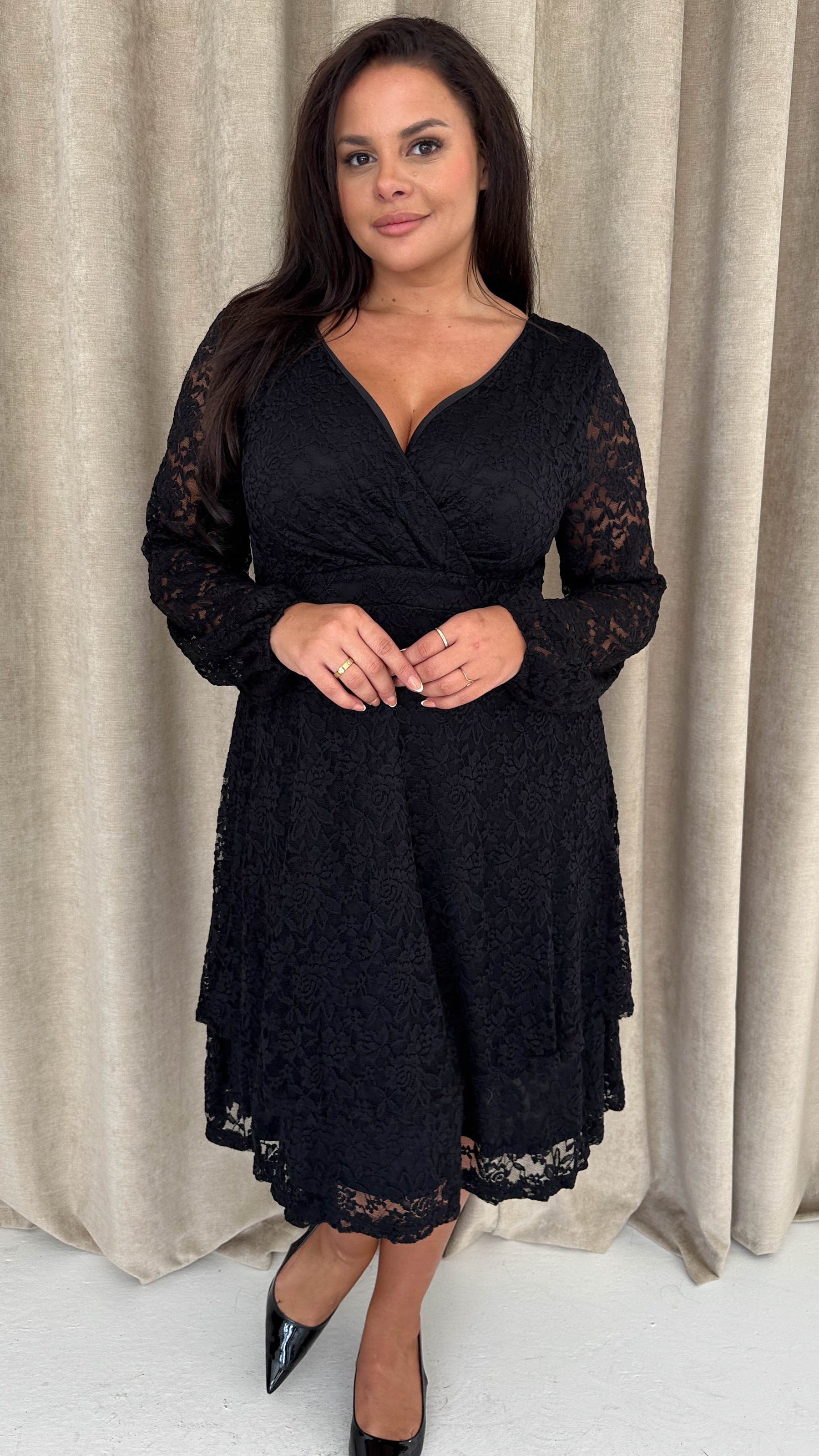 CurveWow Lace Plunge Ruffle Skater Dress Black