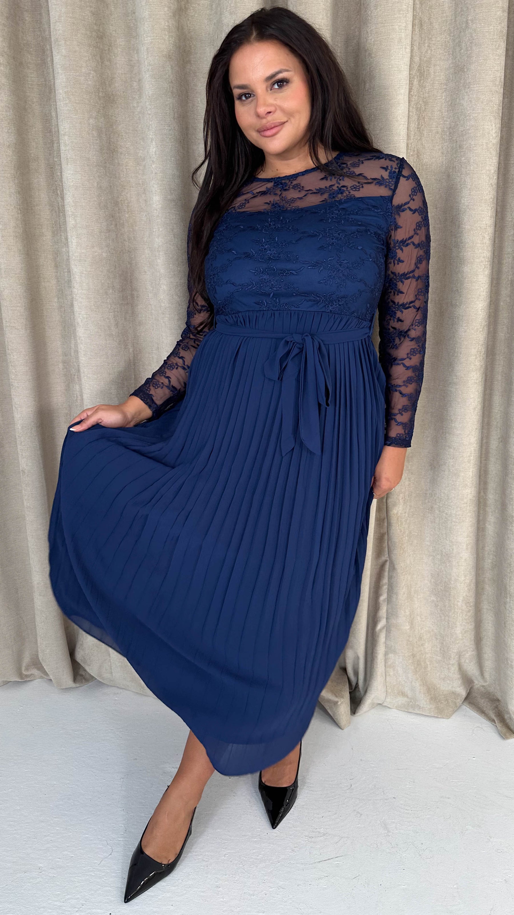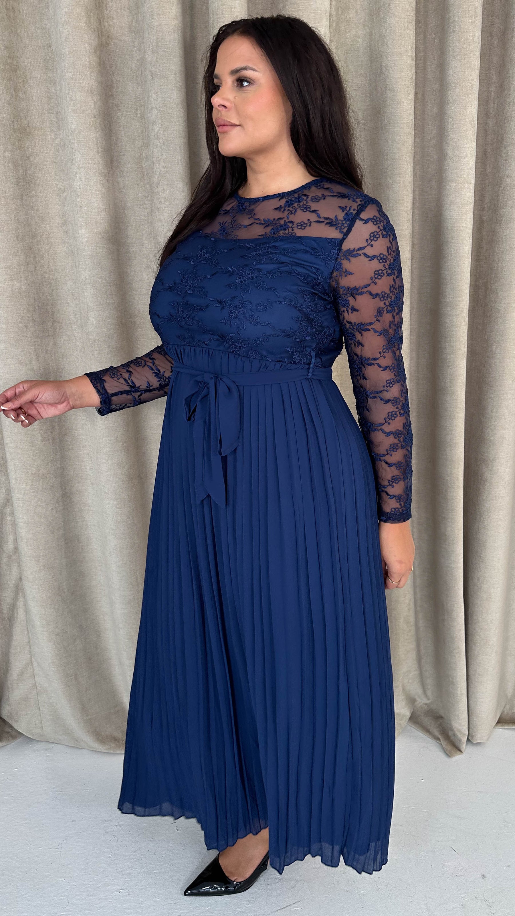 CurveWow Lace Top Pleated Maxi Dress Navy