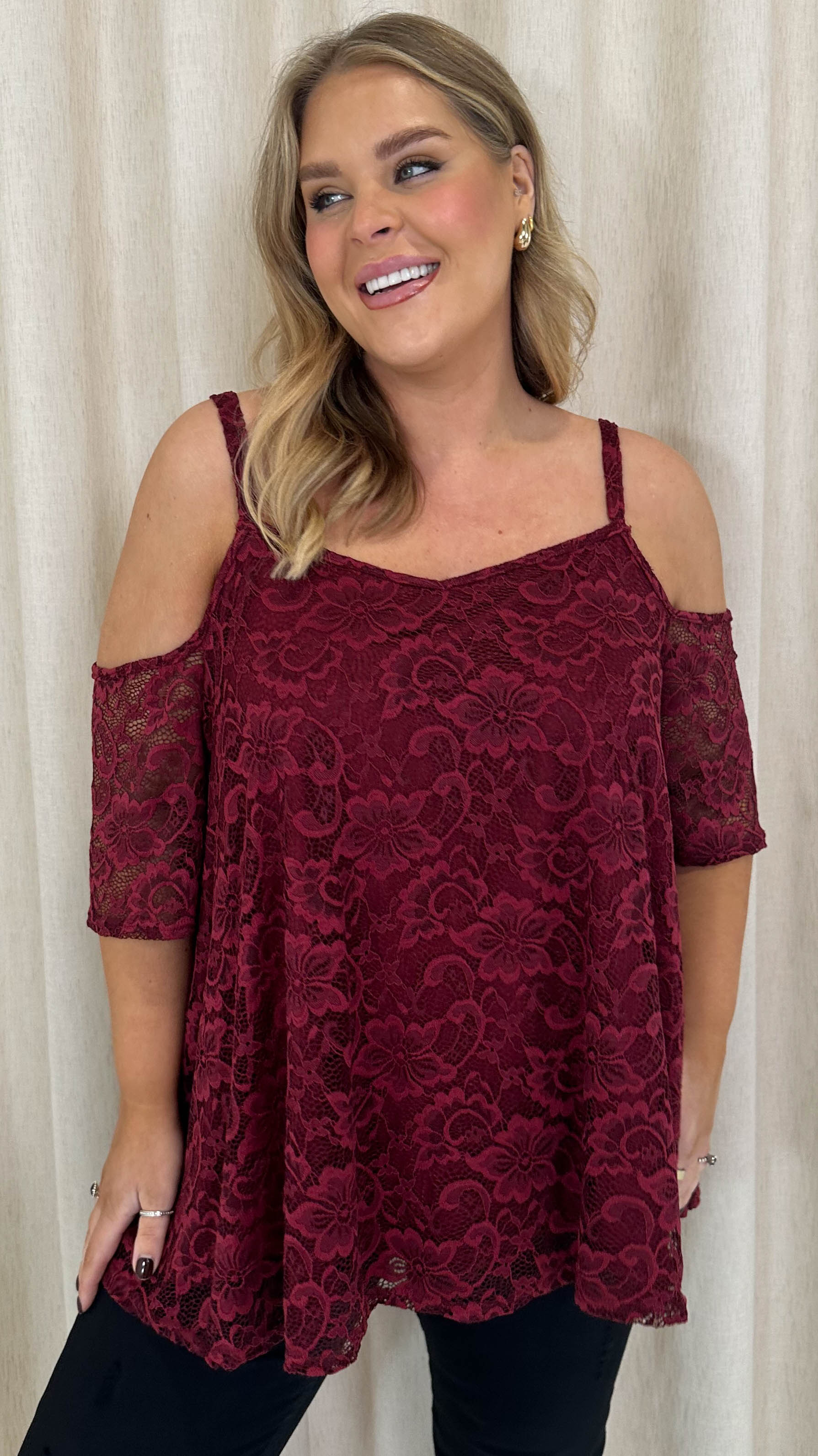 CurveWow Lacy Strappy Cold Shoulder Top Wine