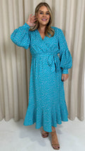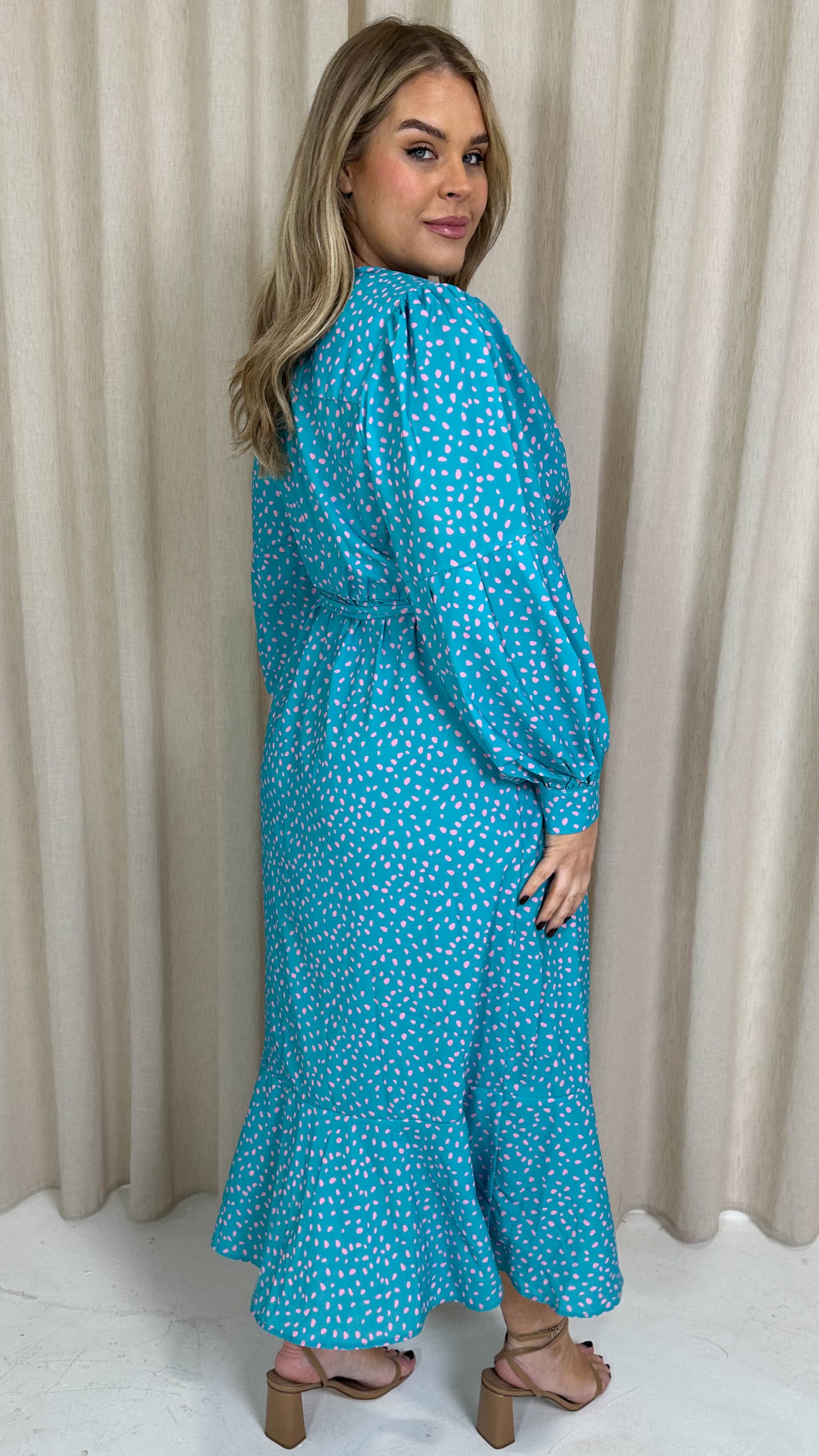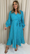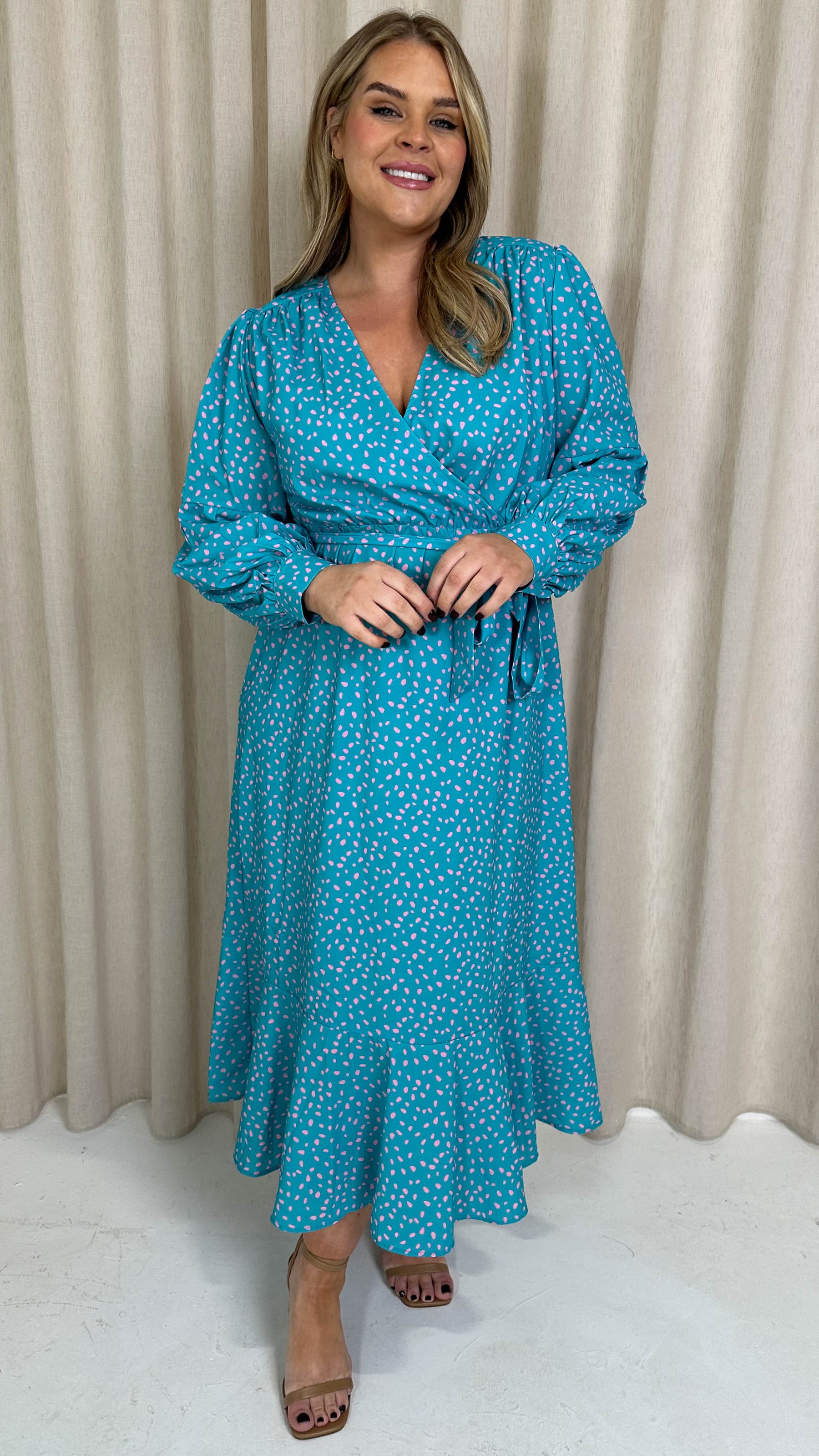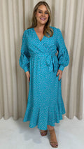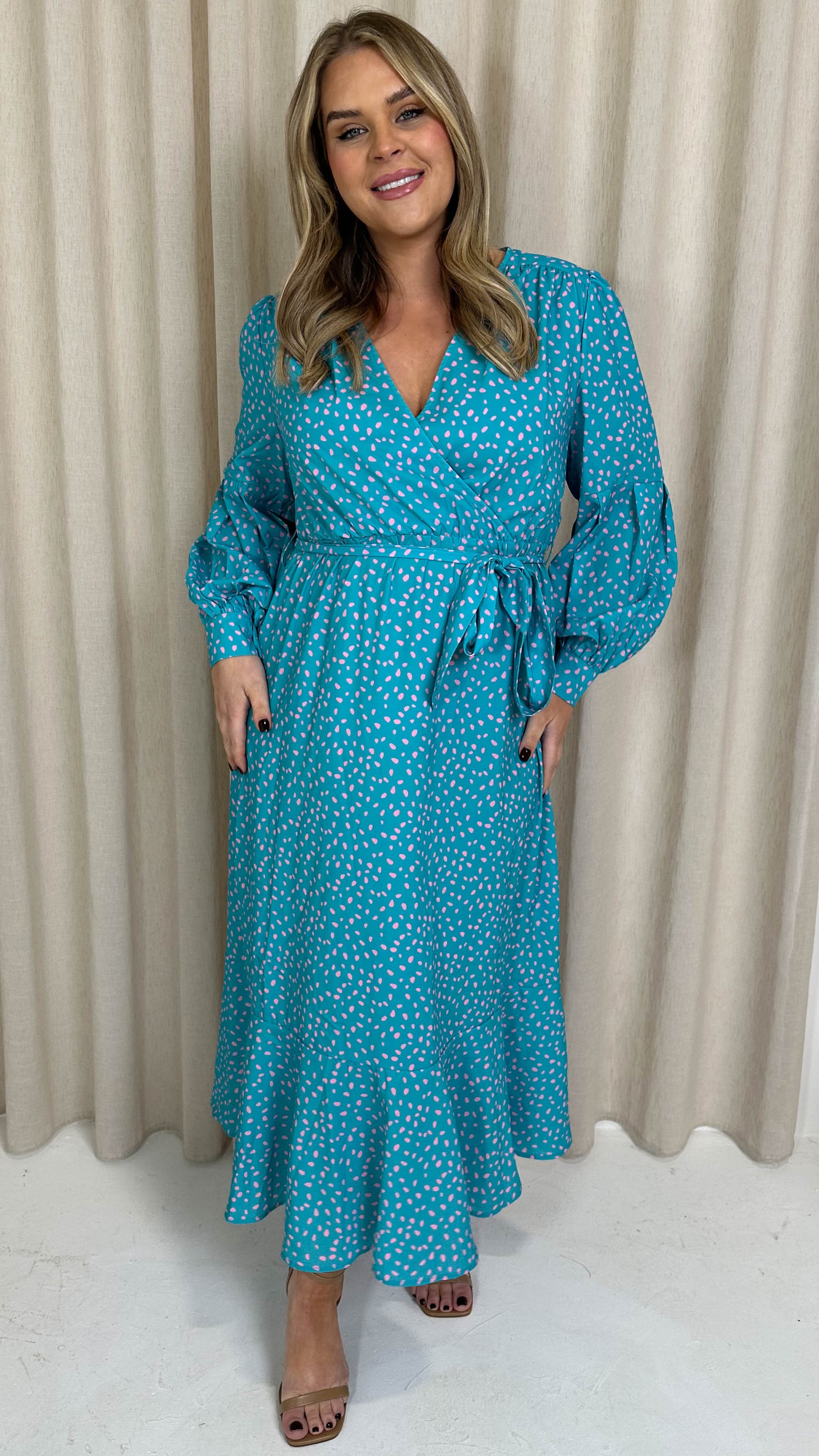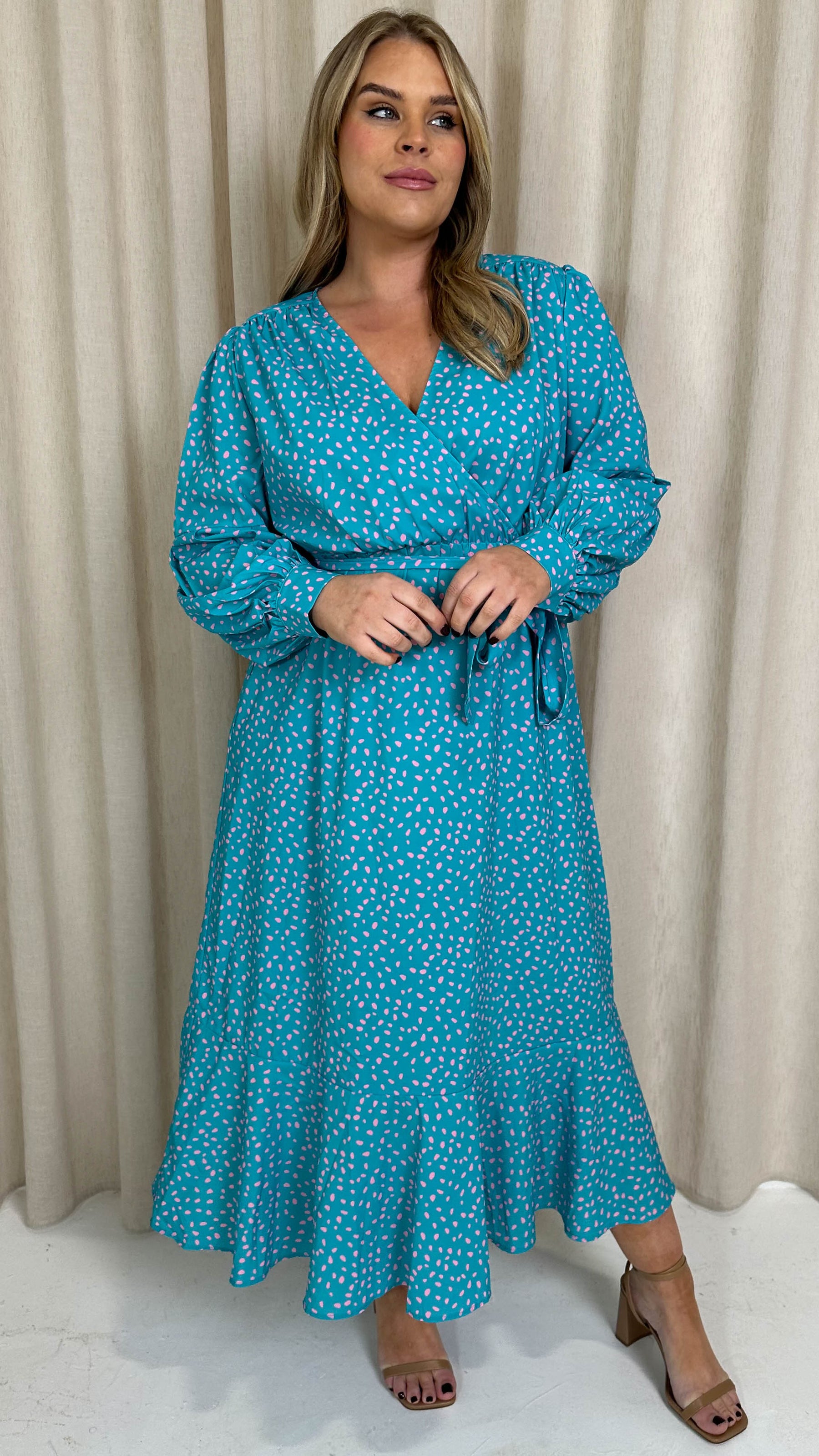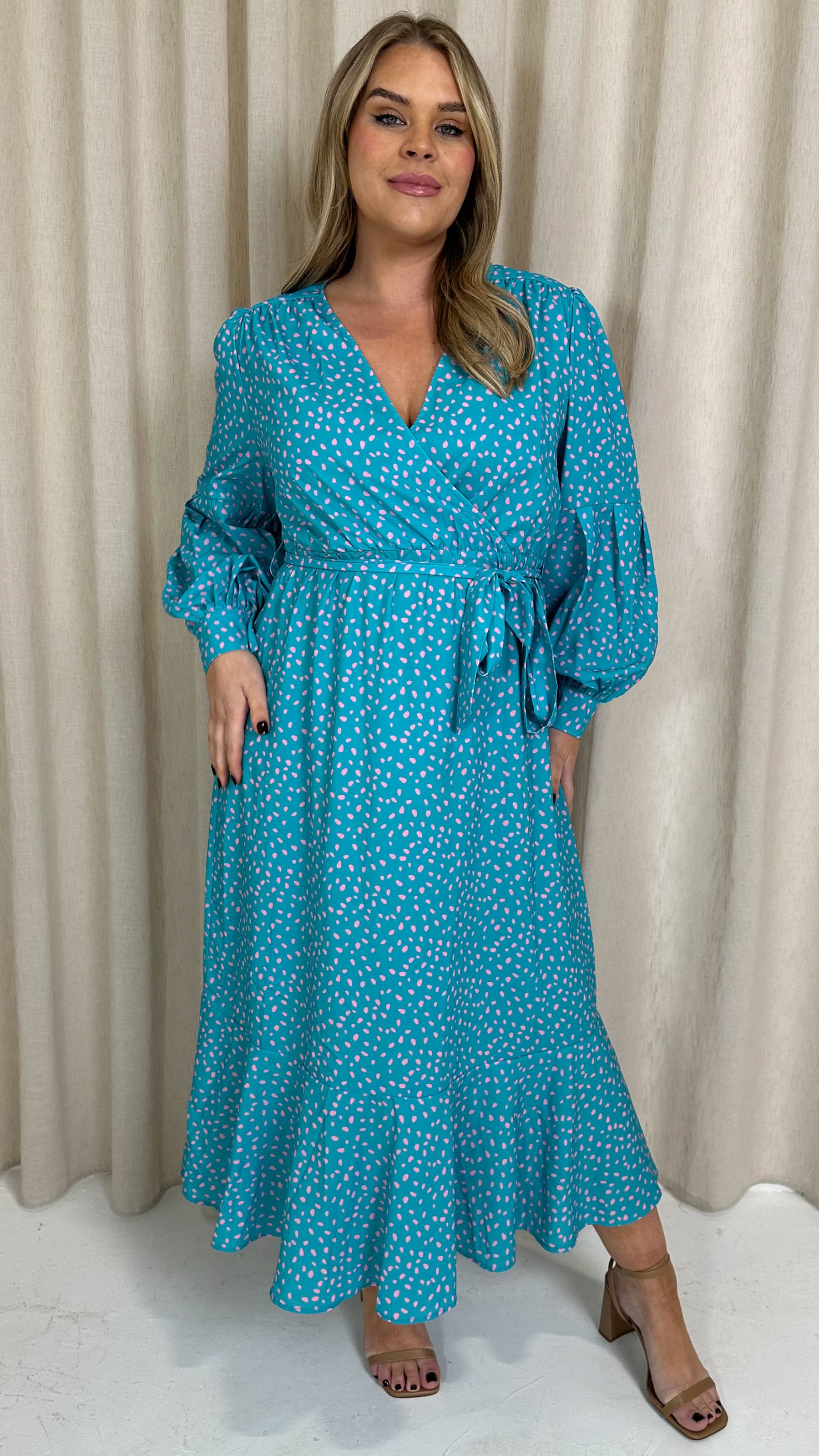CurveWow Printed Wrap Dress Turquoise Pink Spot