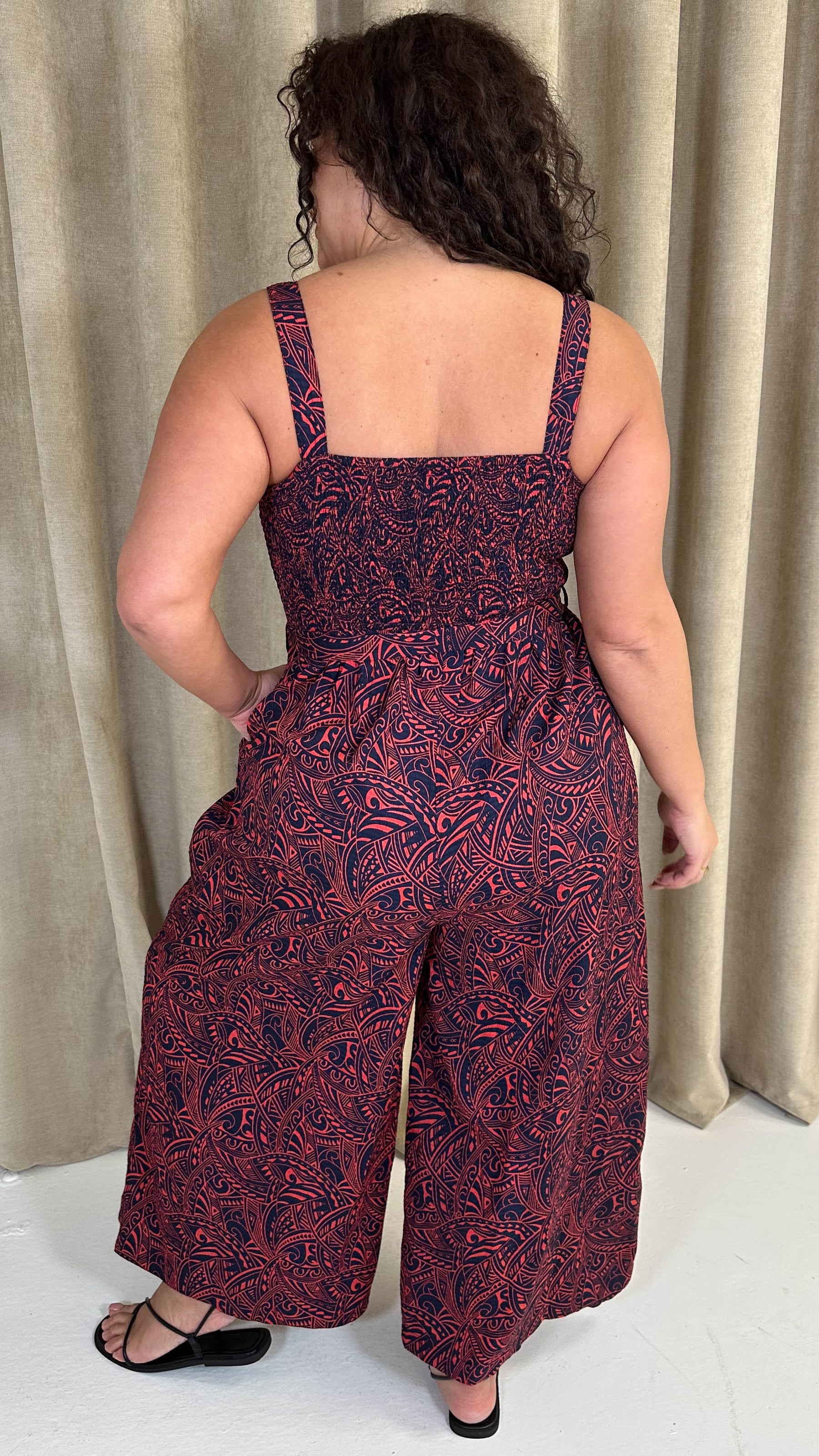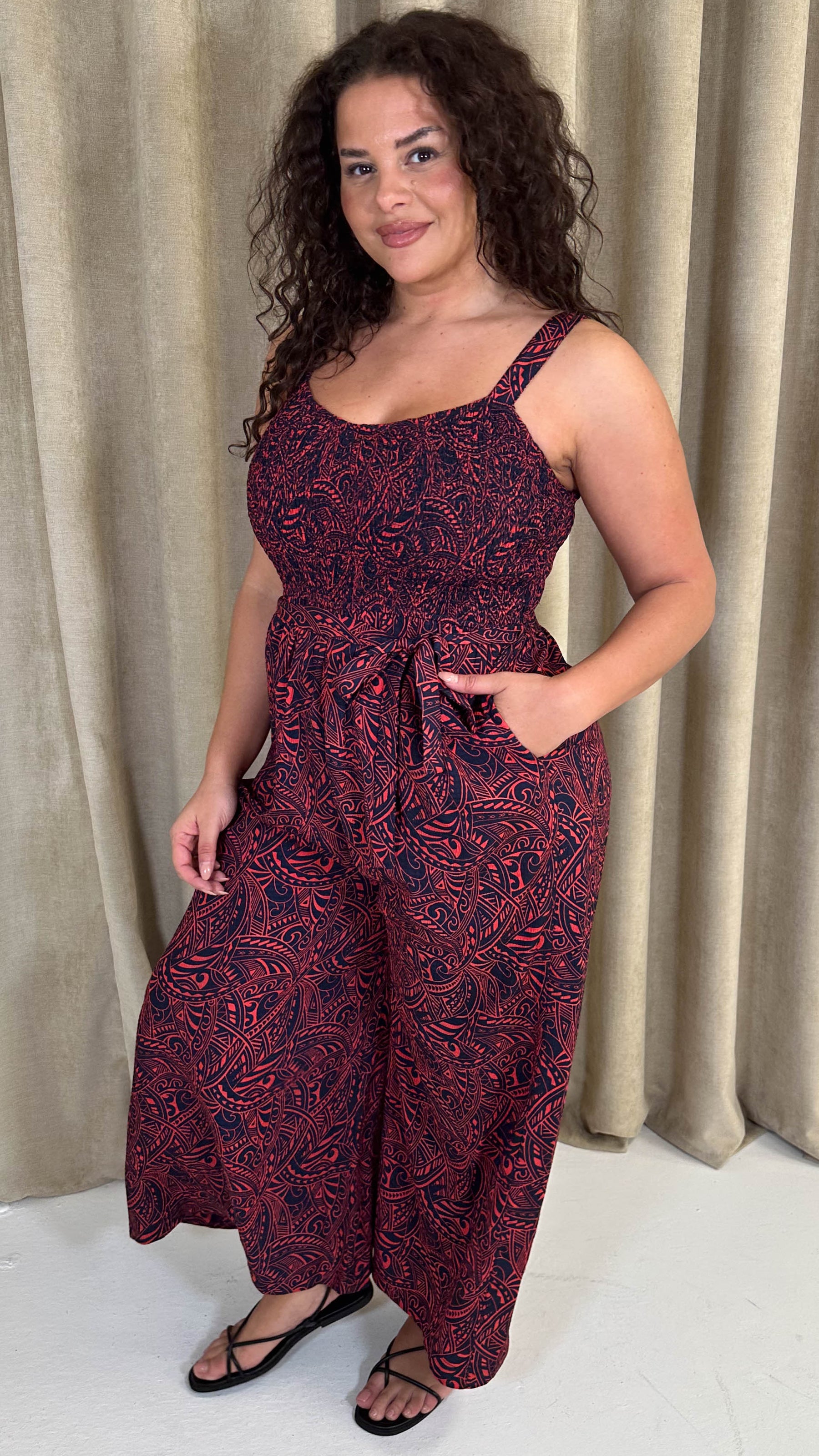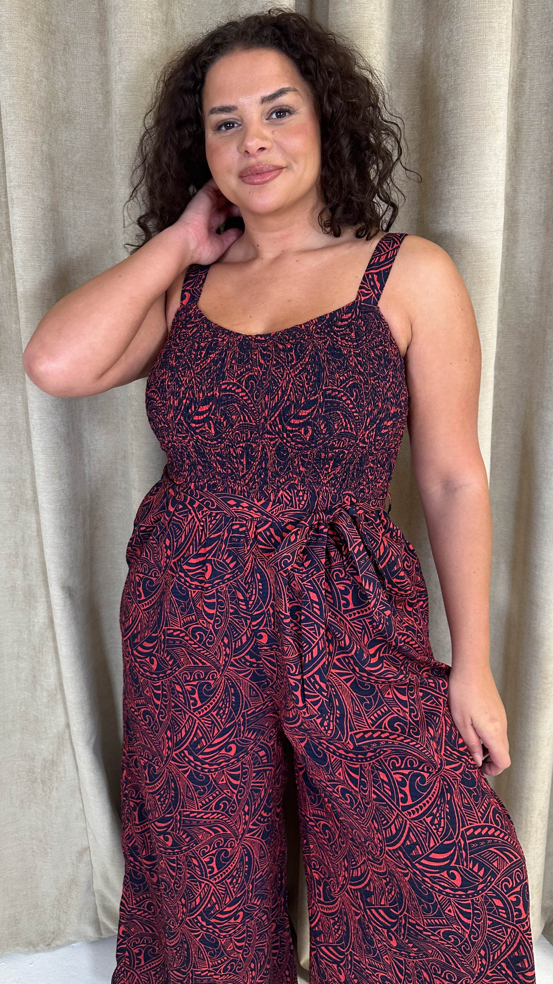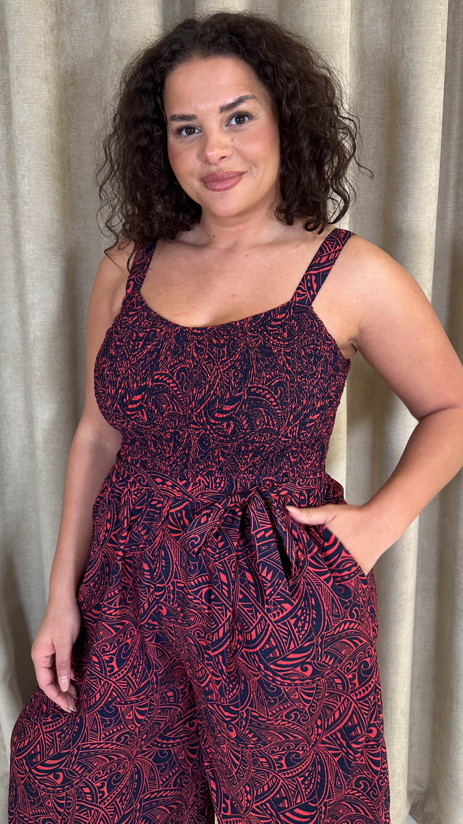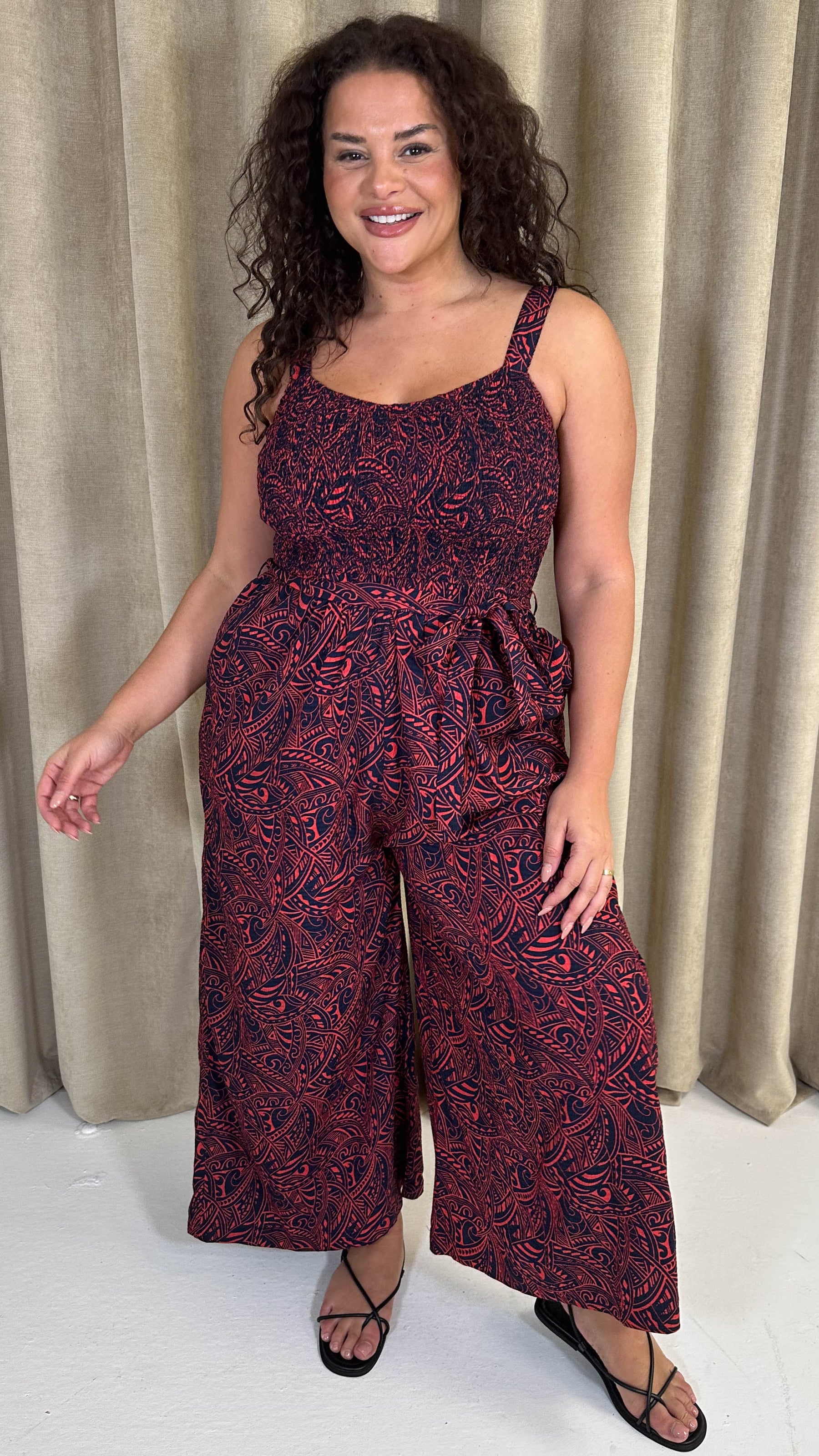 CurveWow Printed Shirred Cami Jumpsuit Red & Navy Print