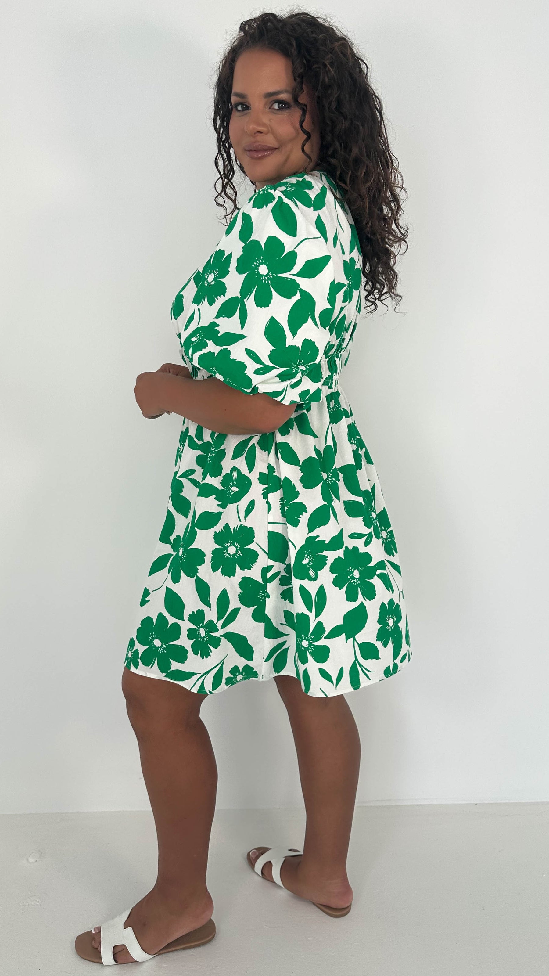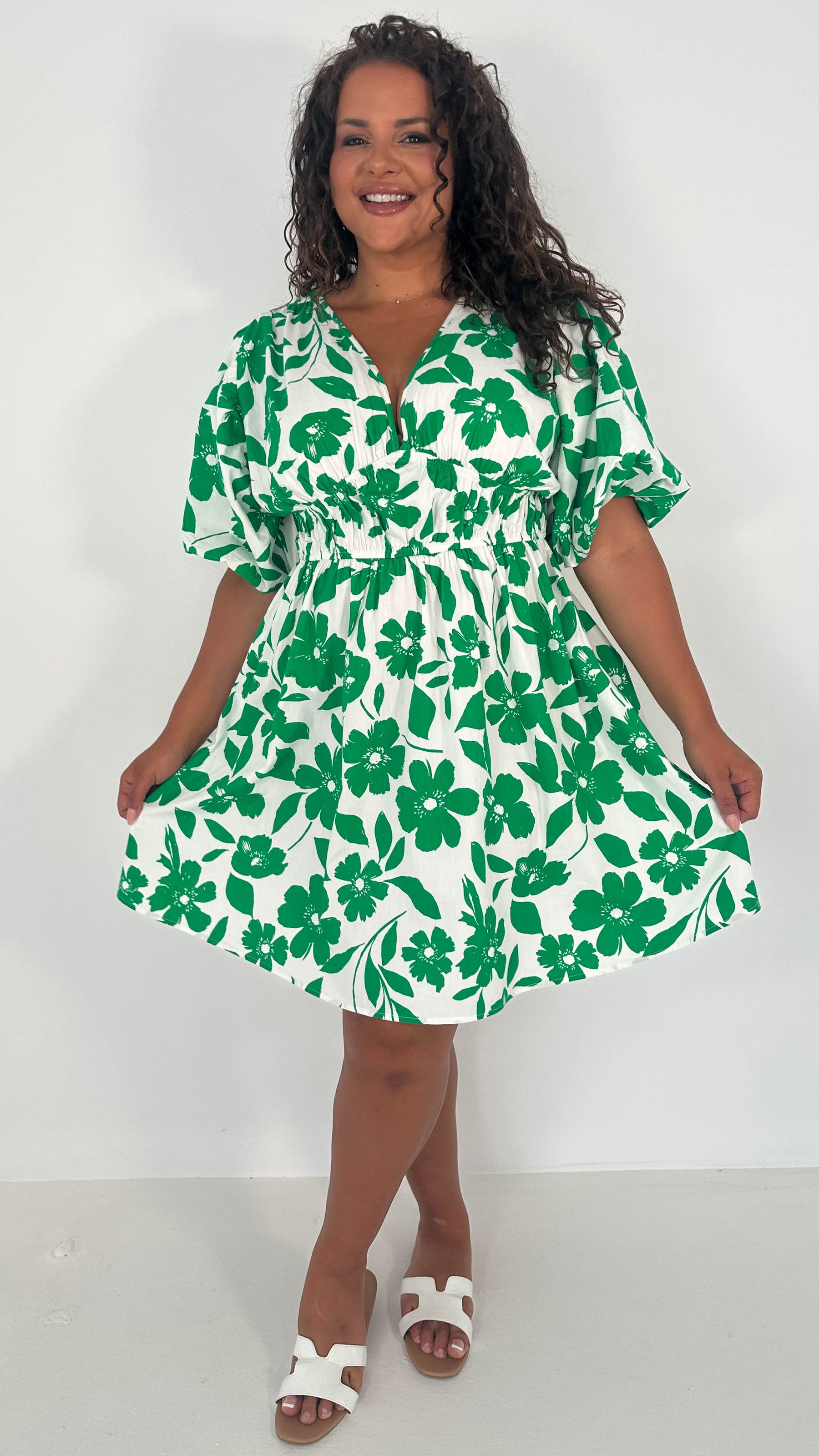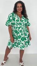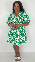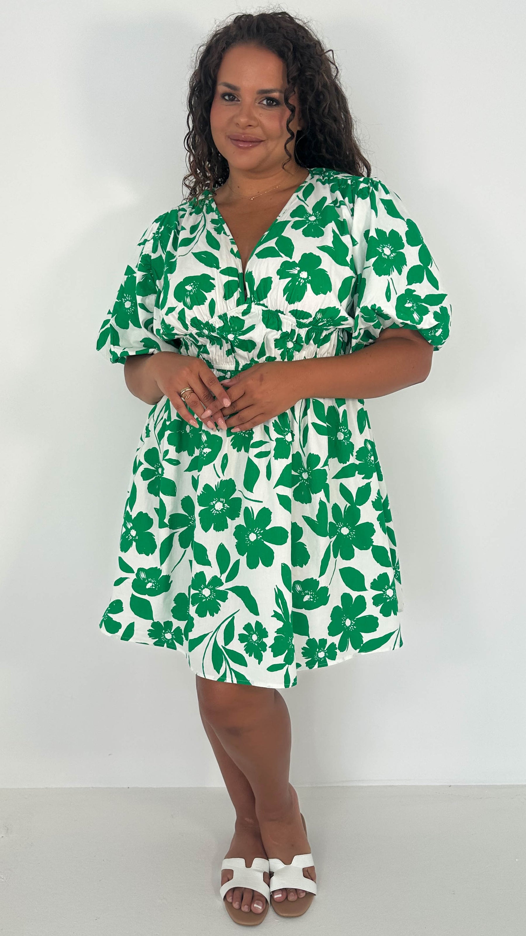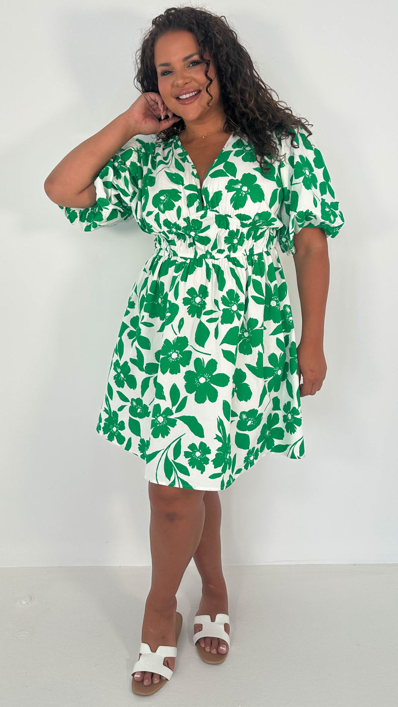 CurveWow Puff Sleeve V Neck Dress Green Floral