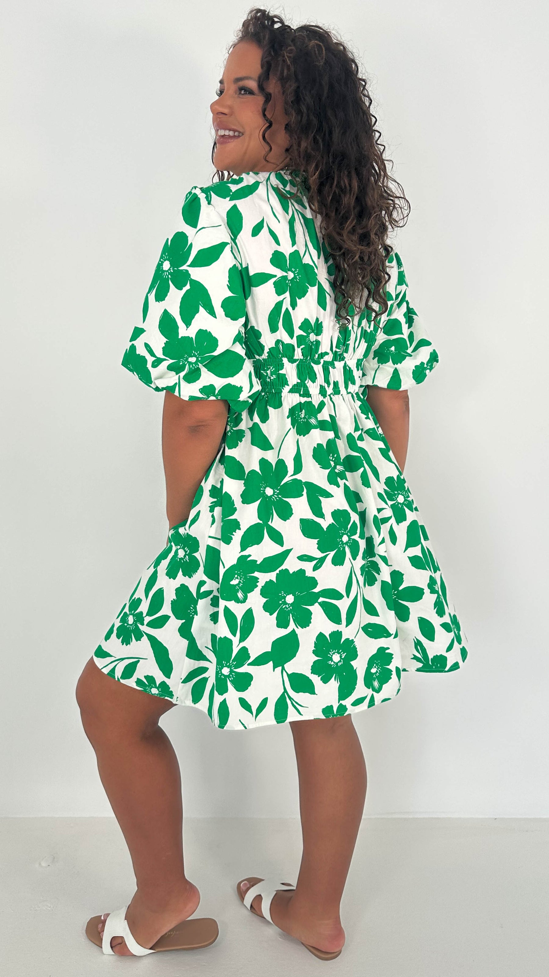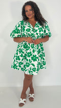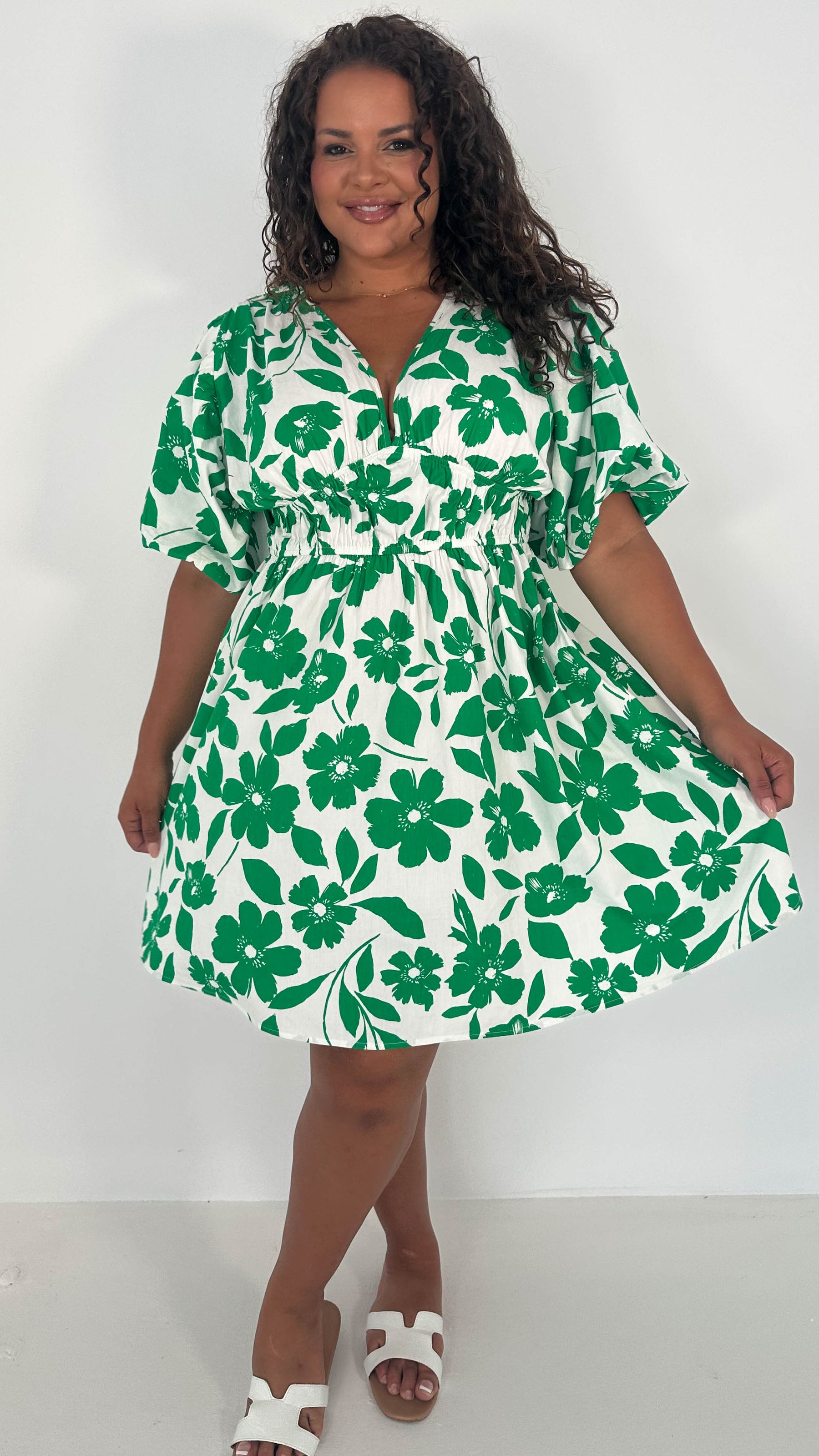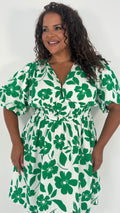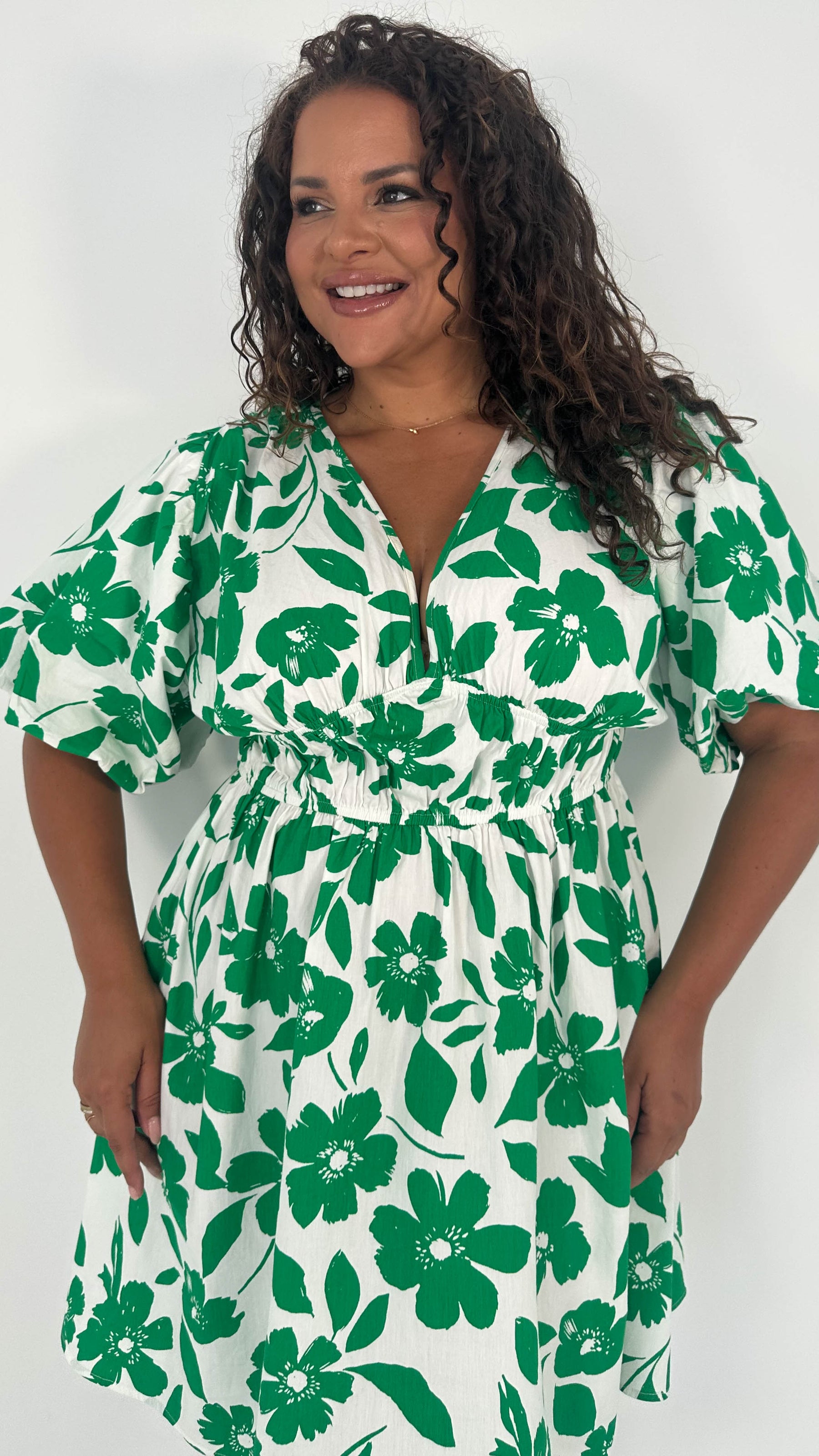 CurveWow Puff Sleeve V Neck Dress Green Floral