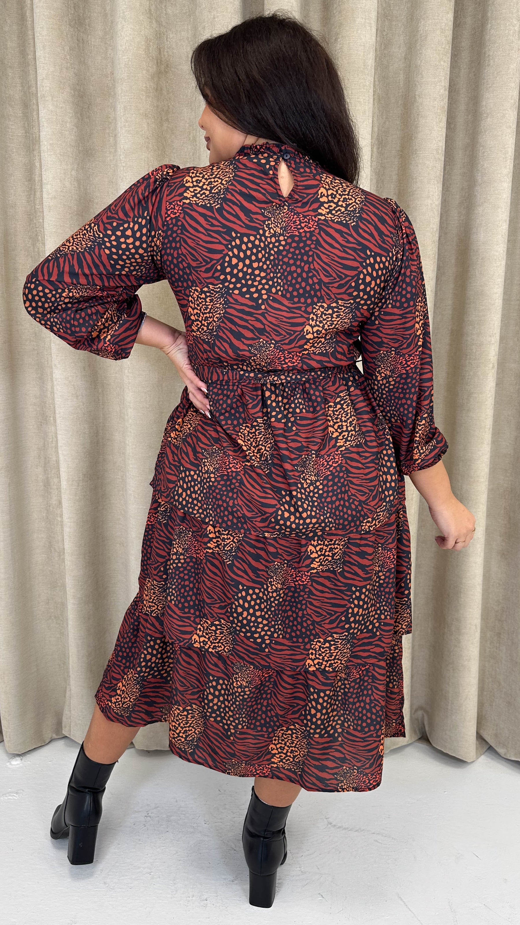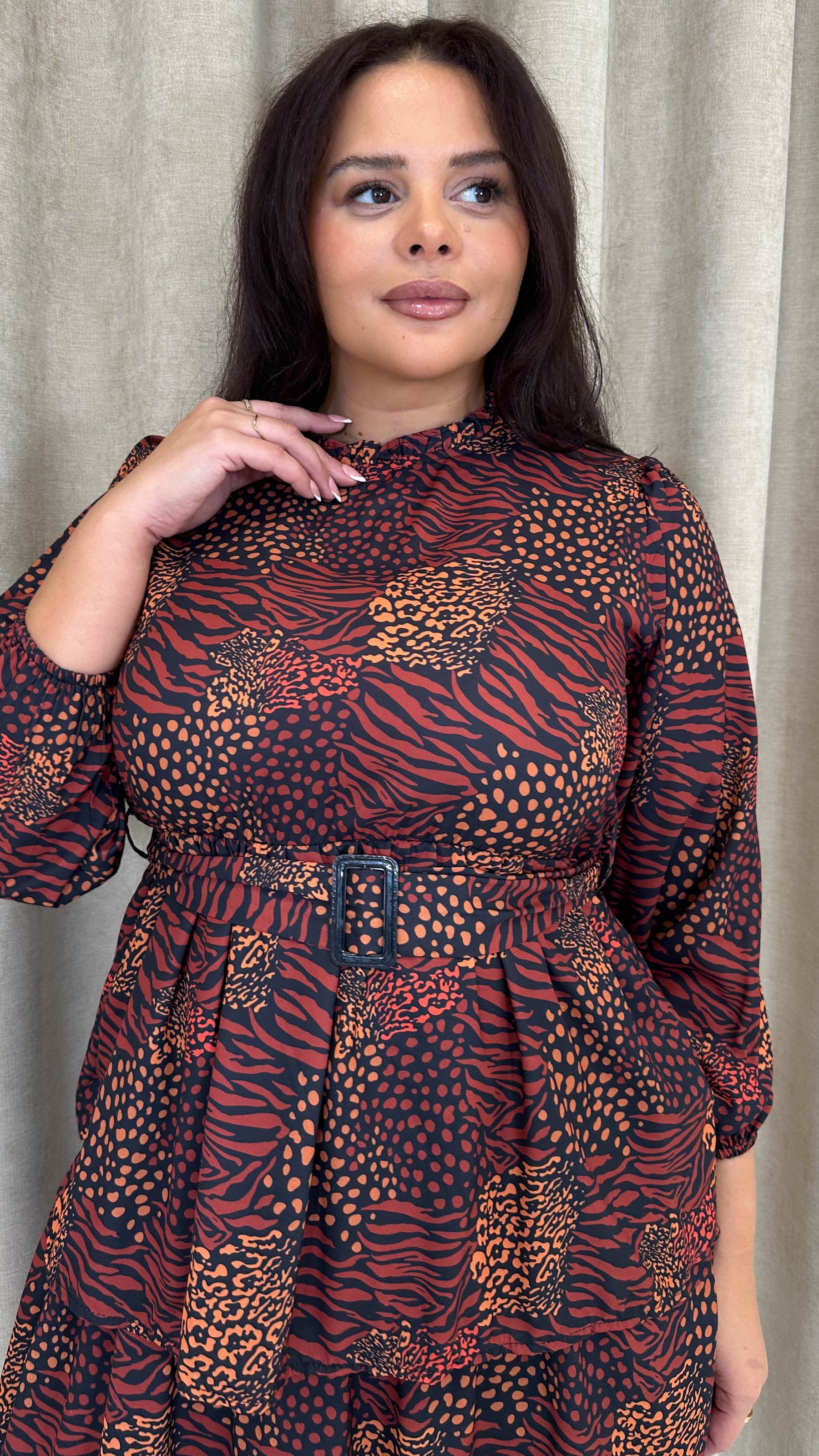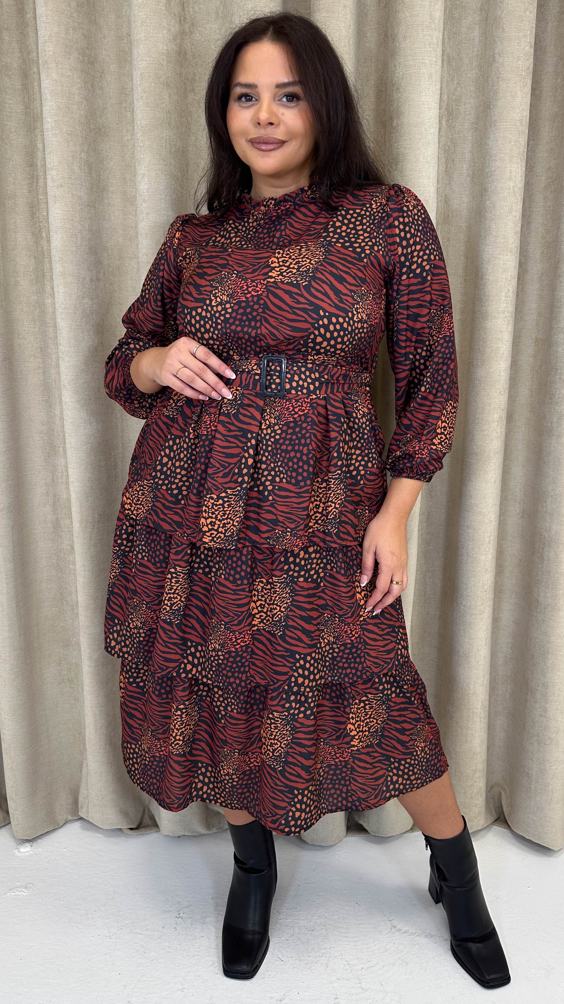 CurveWow Tiered Belt Midi Dress Rust Mixed Animal
