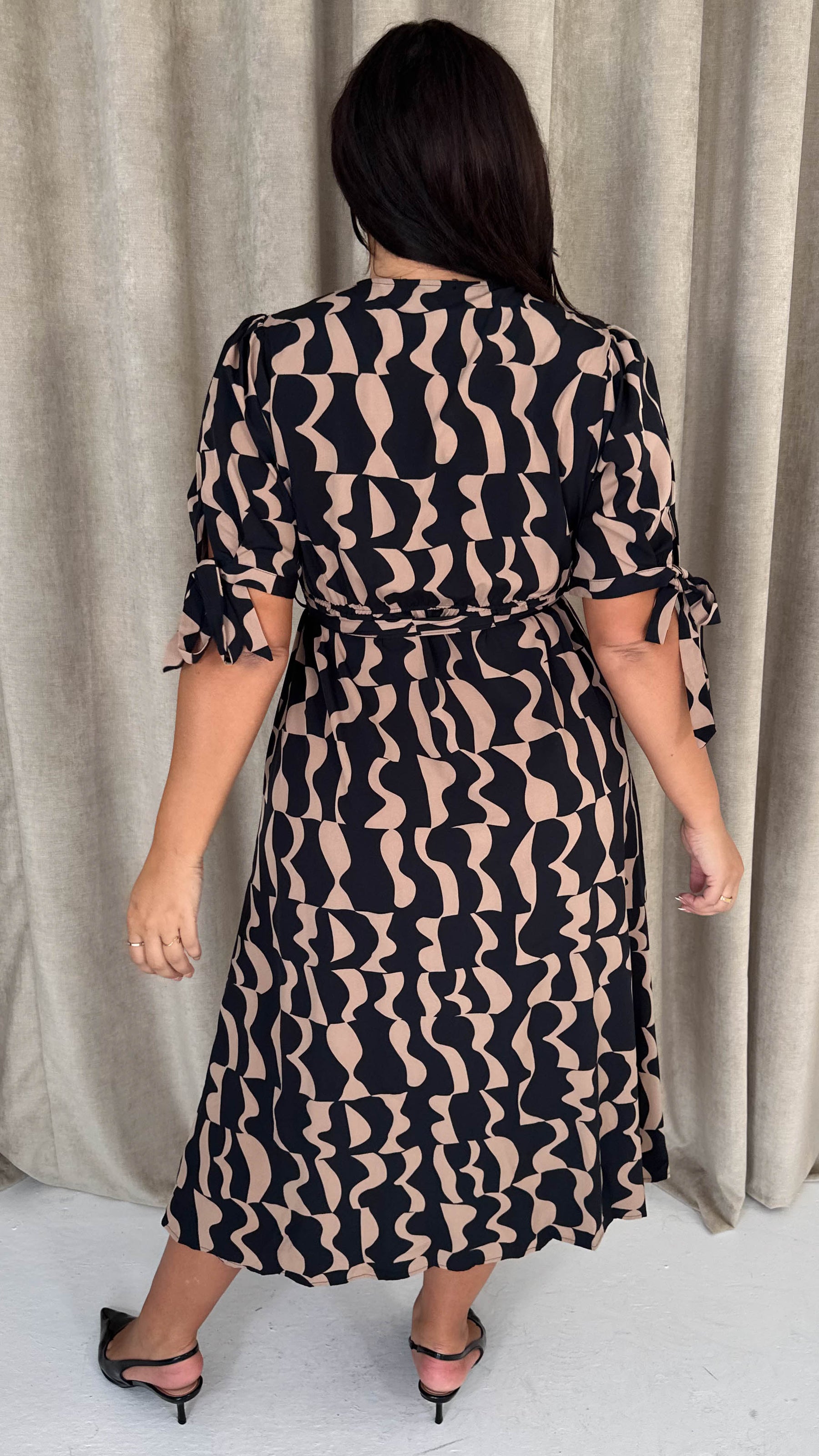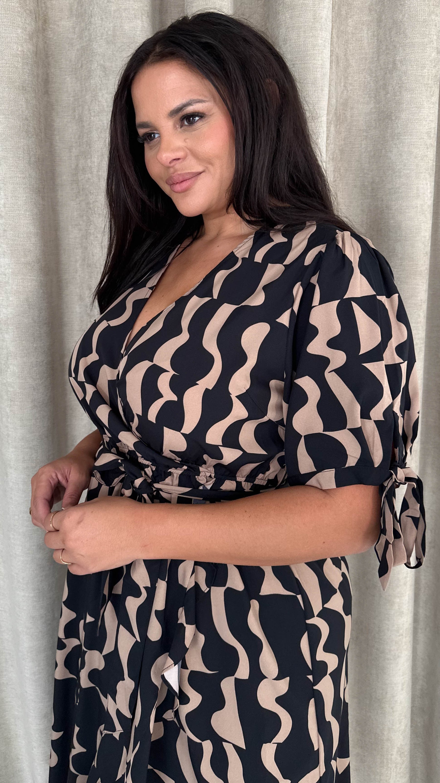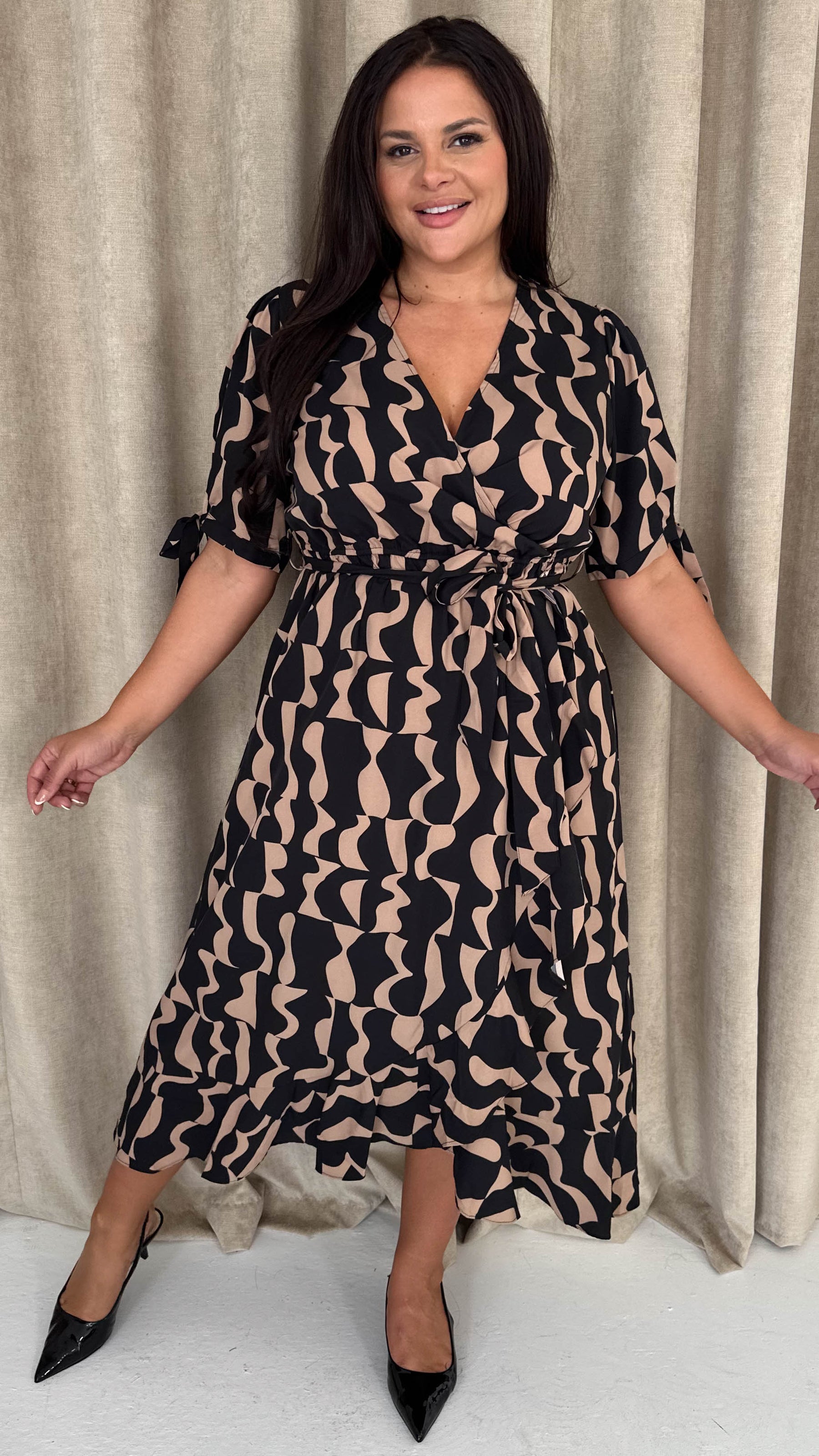 CurveWow Tie Sleeve Wrap Dress Black Abstract