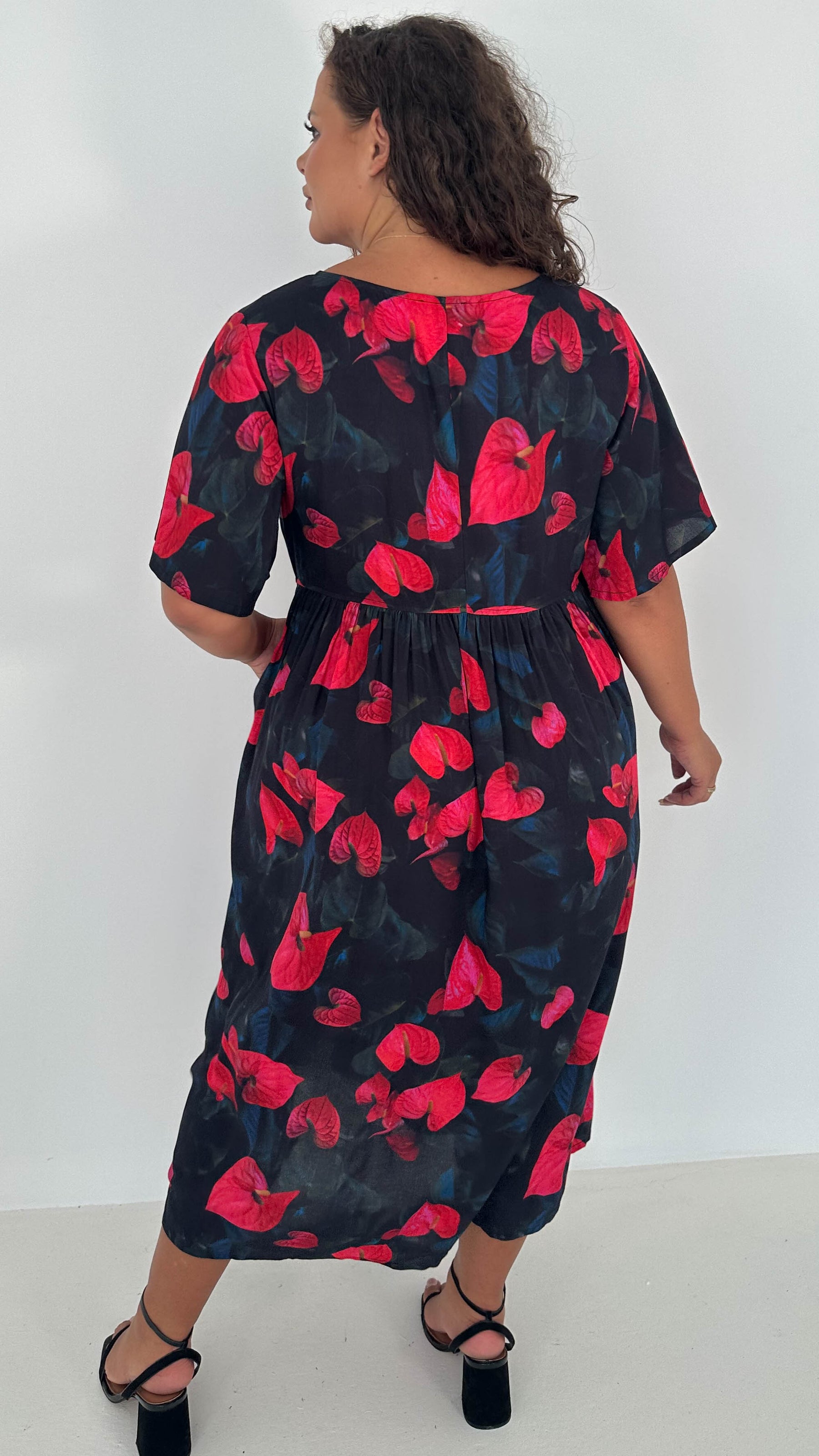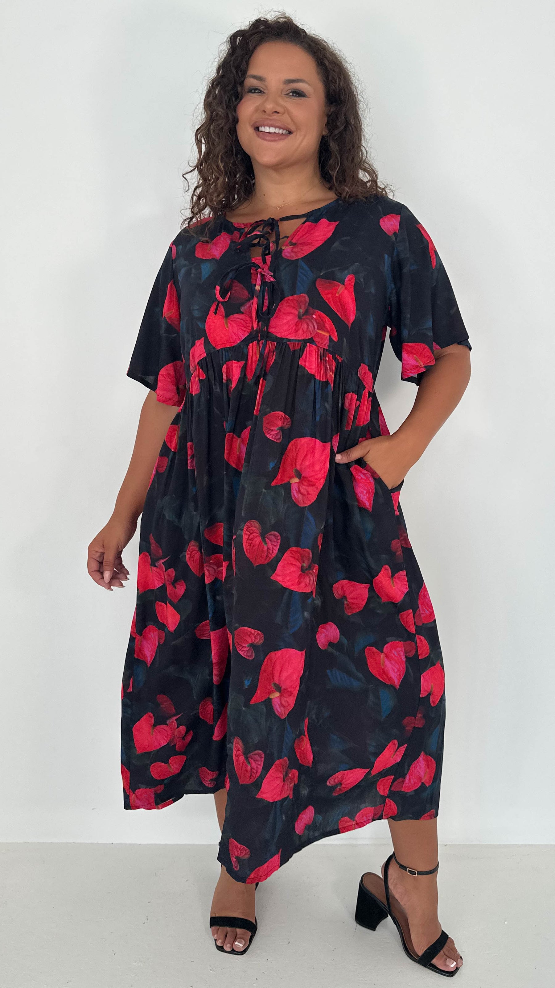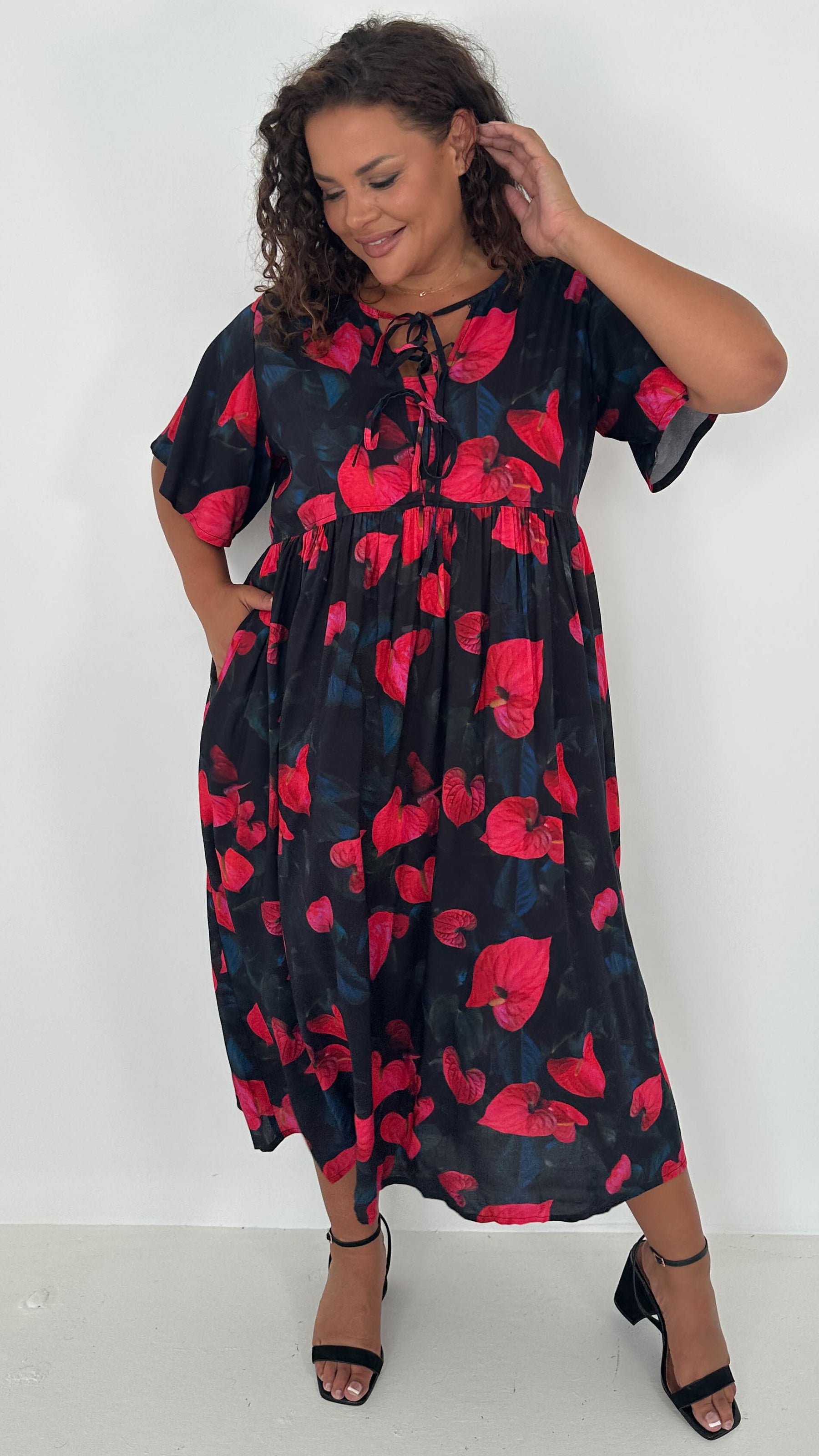 CurveWow Tied Bow Front Dress Black & Red Floral