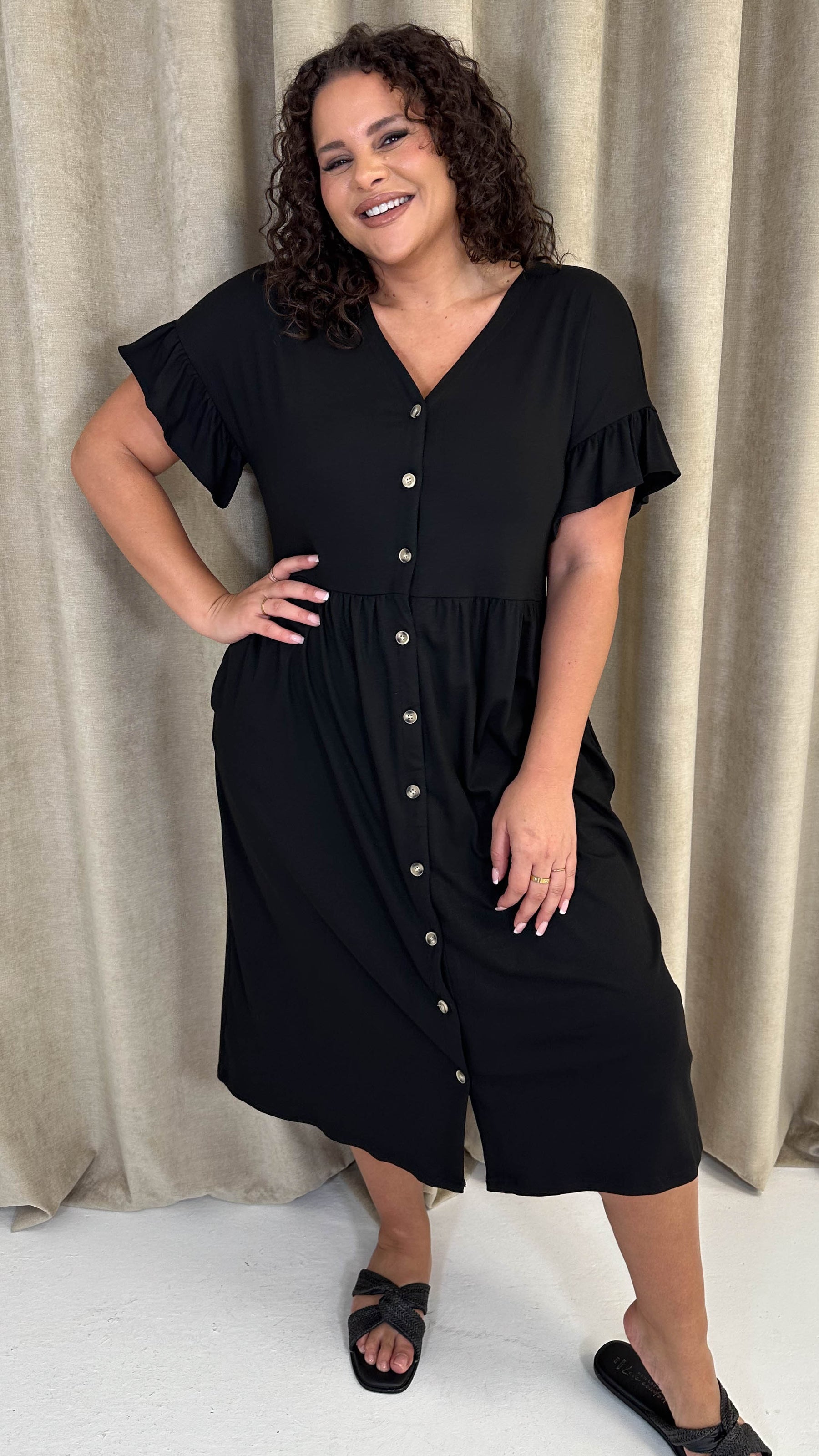 CurveWow Cotton Frill Sleeve Button Front Dress Black