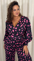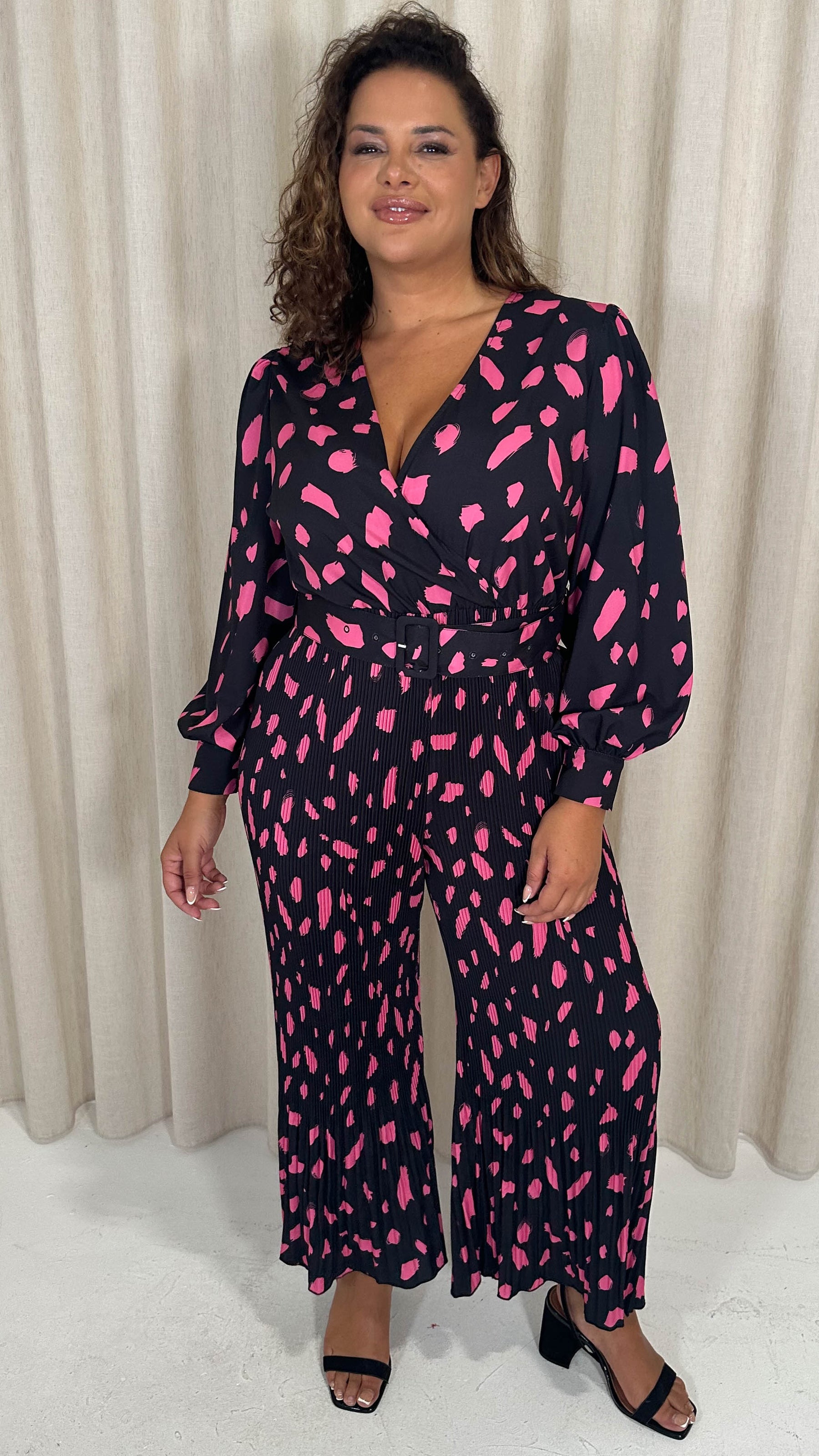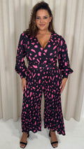 CurveWow V Neck Pleated Jumpsuit Black/Pink Spot