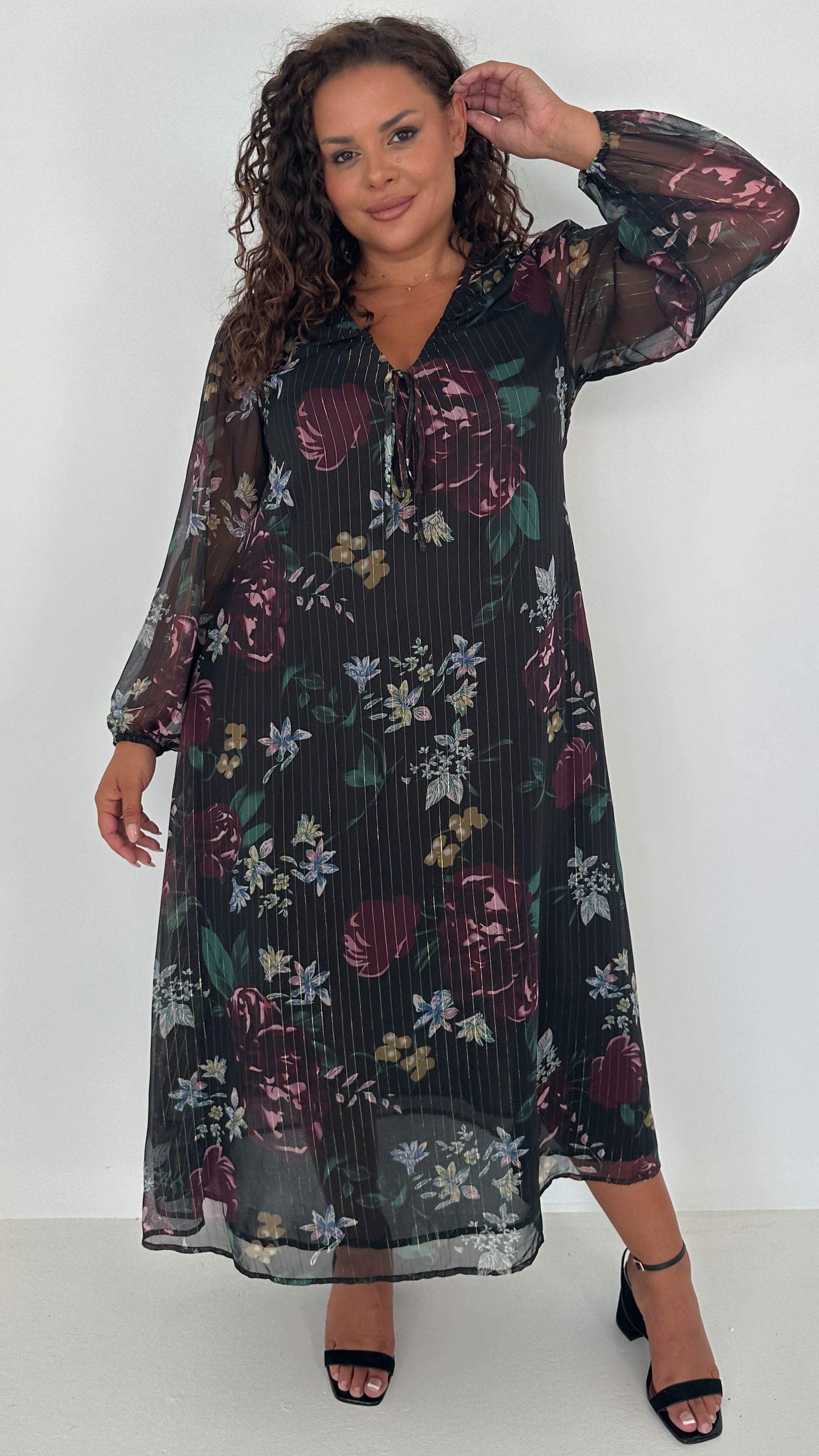 CurveWow V-Neck Tie Detail Maxi Dress Black Floral