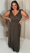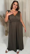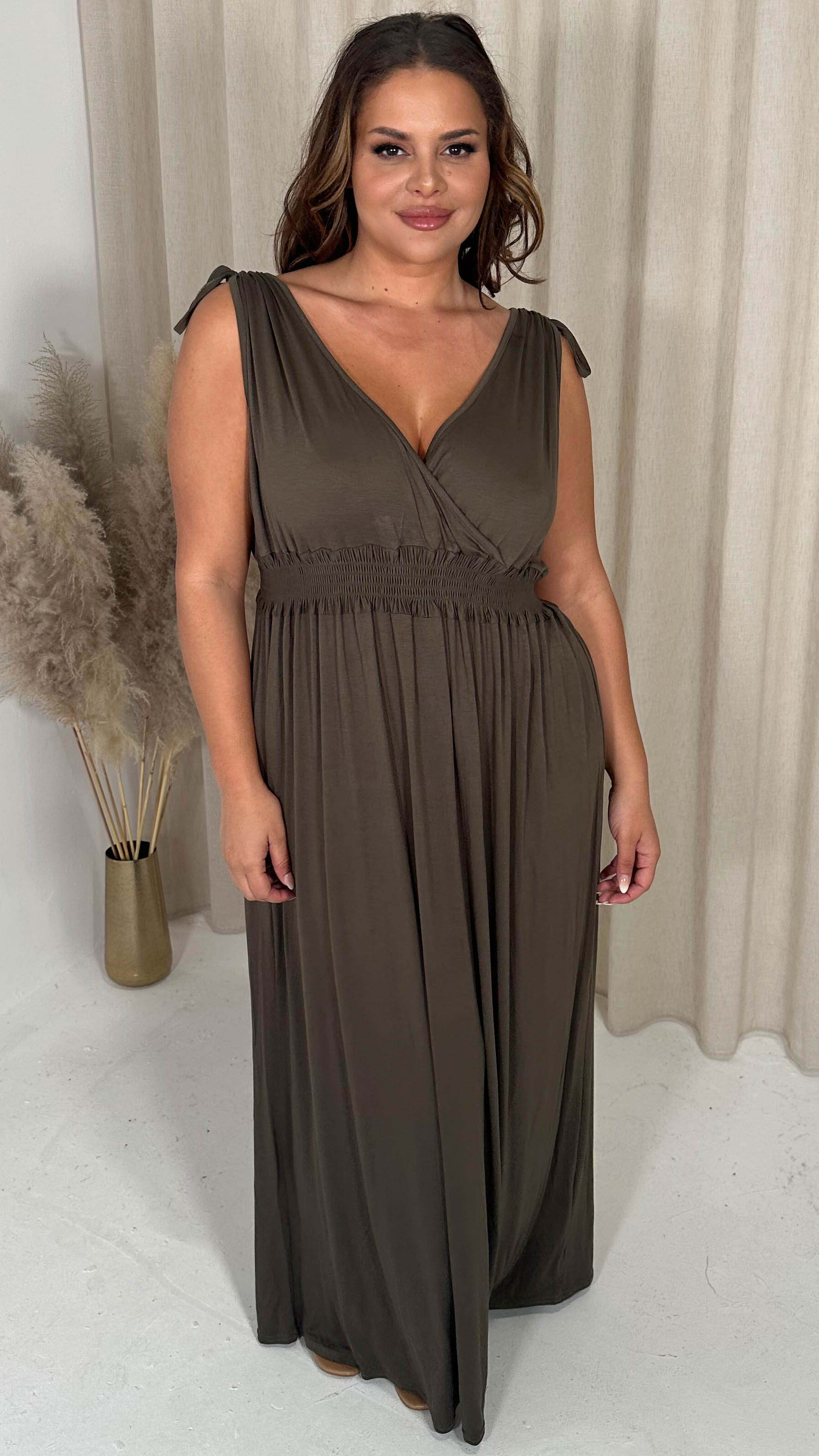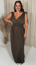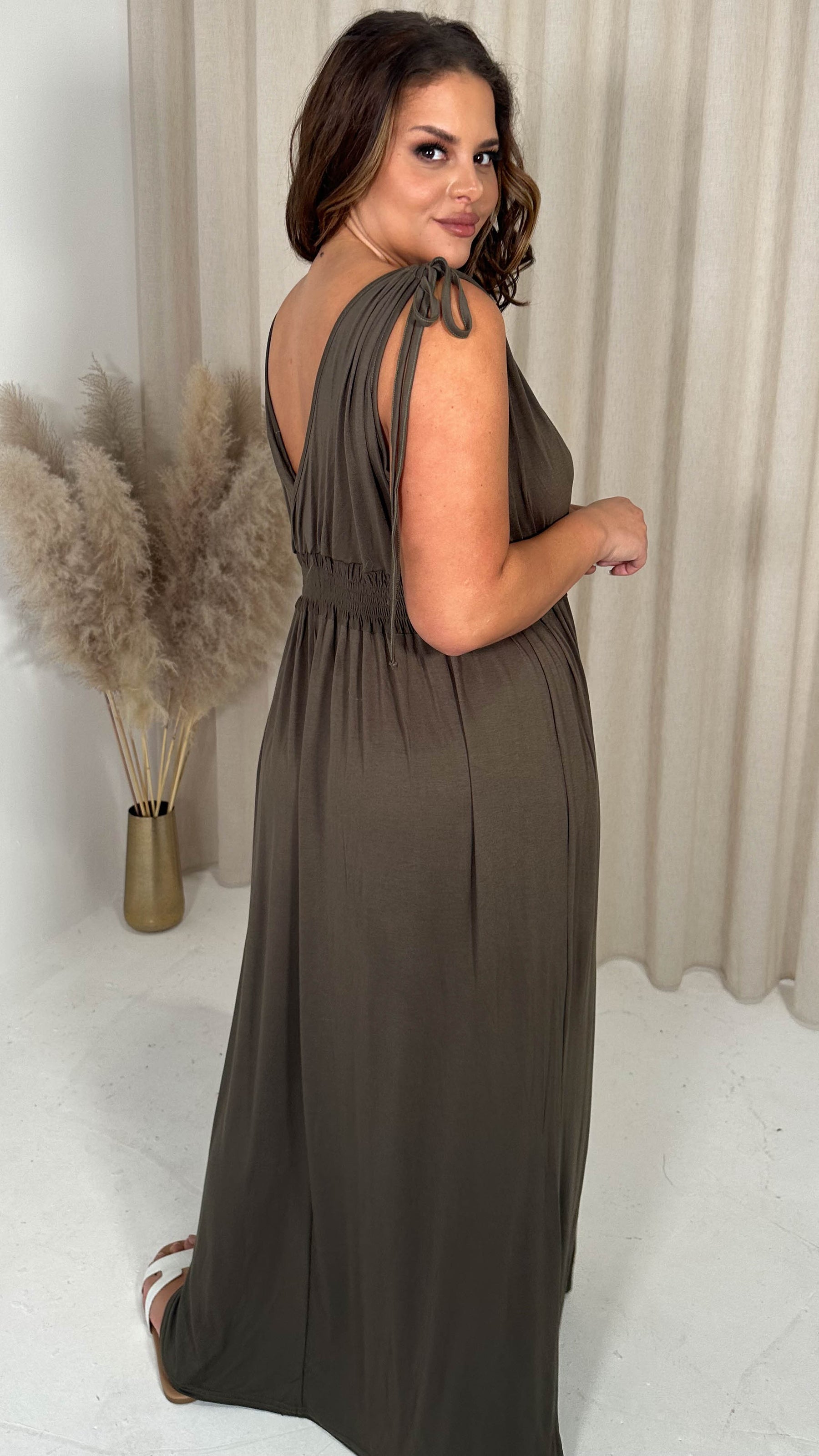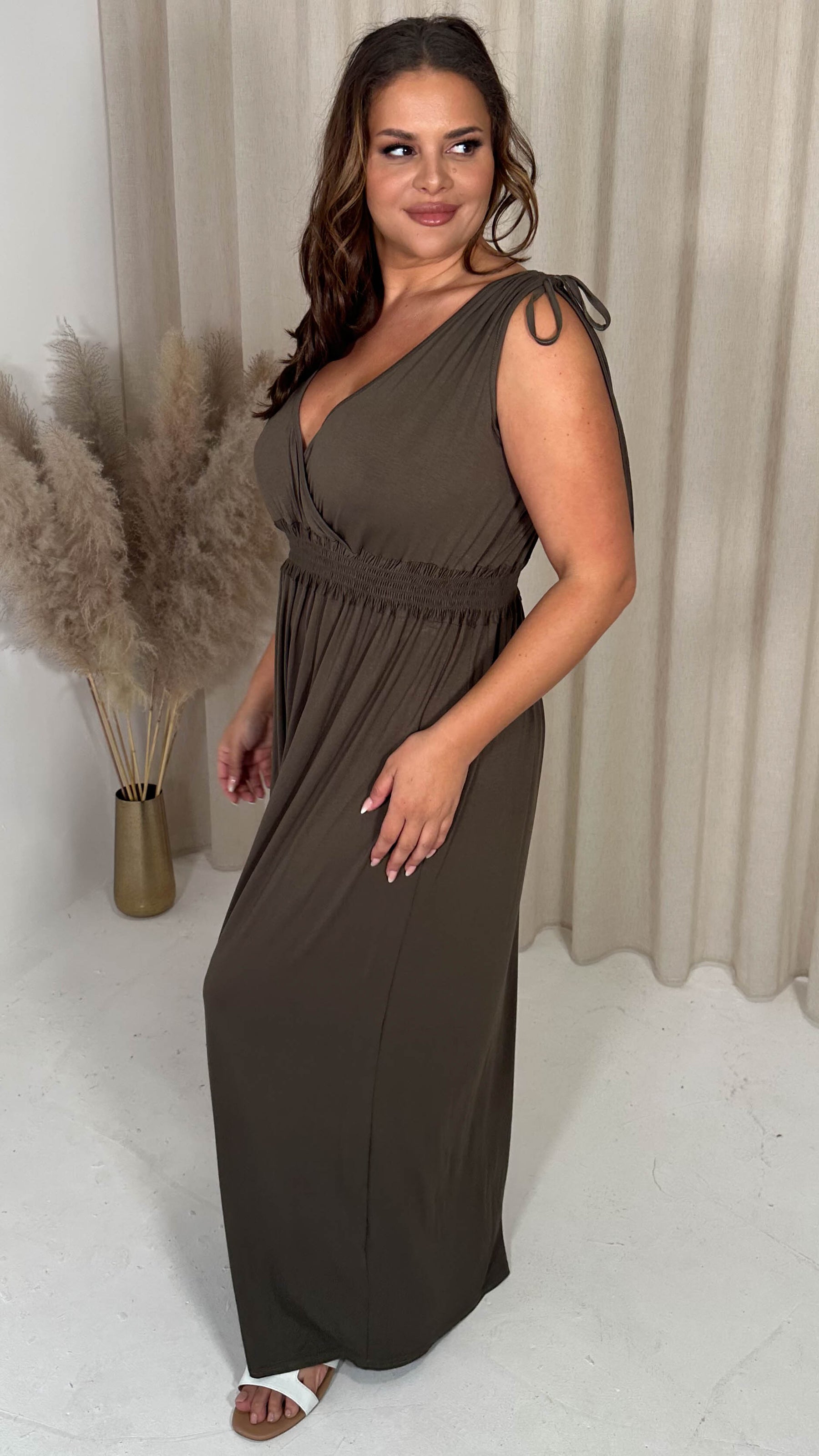 CurveWow Tie Shoulder Shirred Waist Maxi Dress Khaki