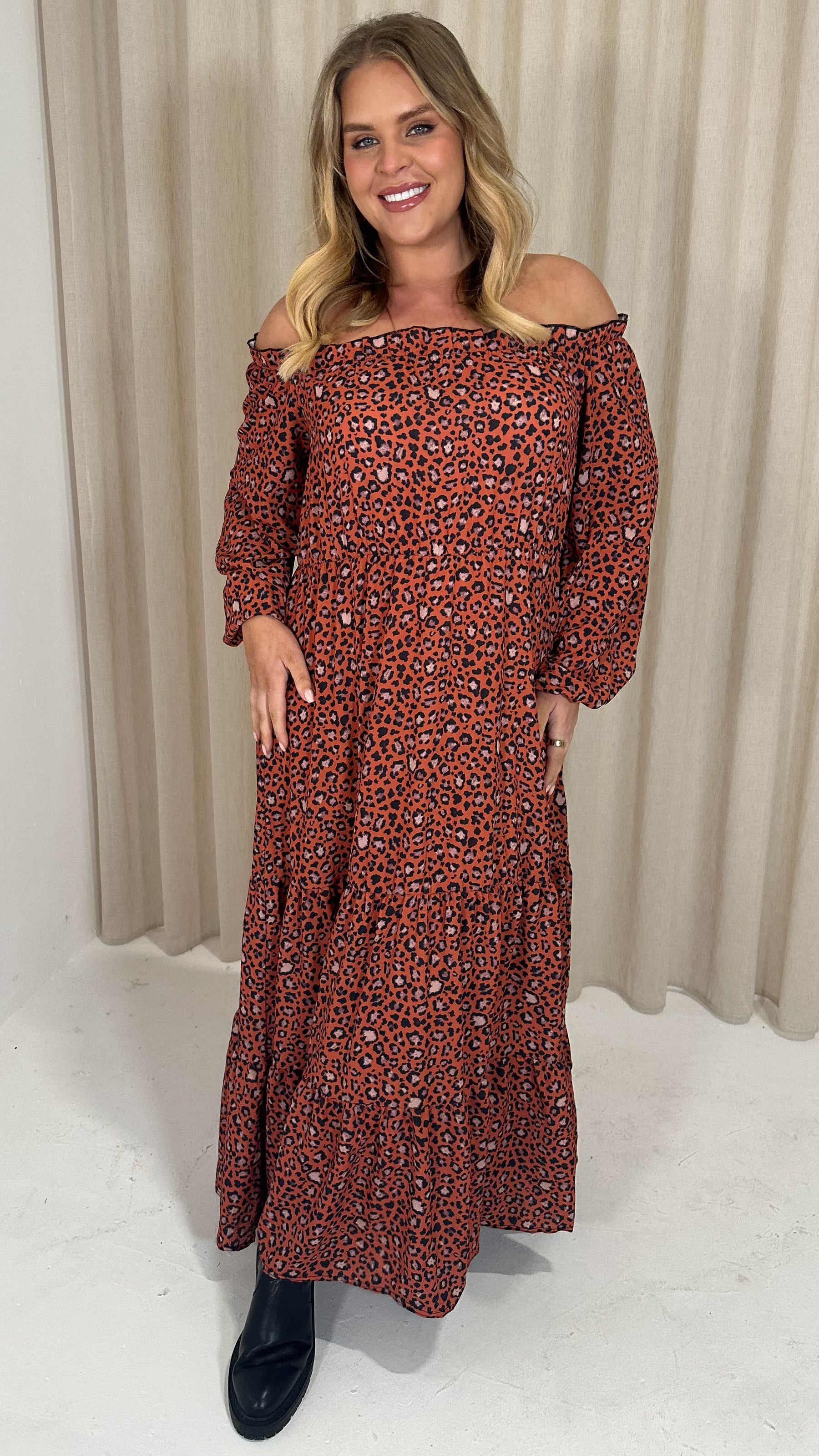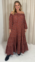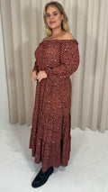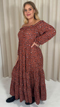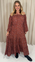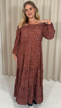 CurveWow Tiered Bardot Maxi Dress Rust Animal