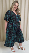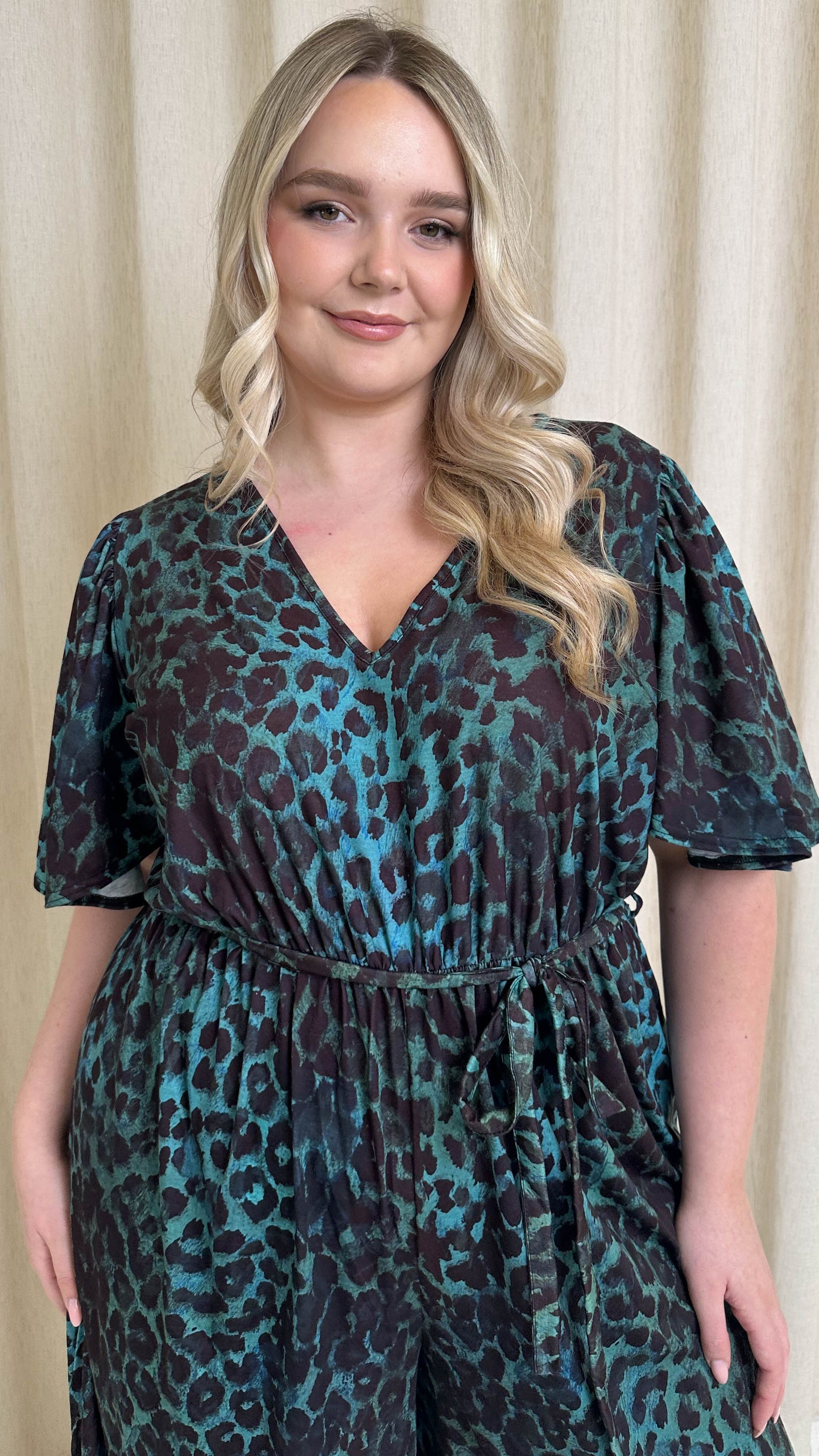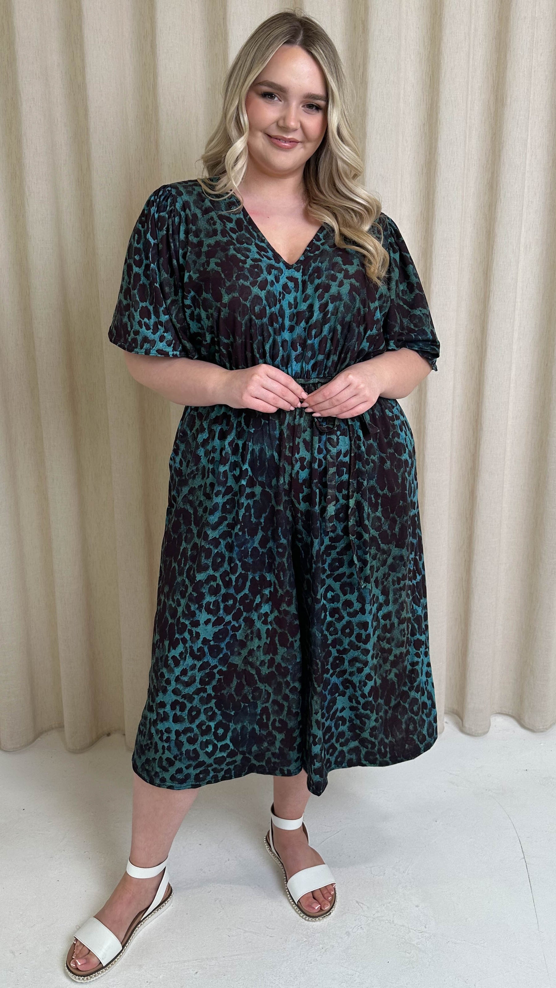 CurveWow V Neck Tie Waist Culotte Jumpsuit Green Animal