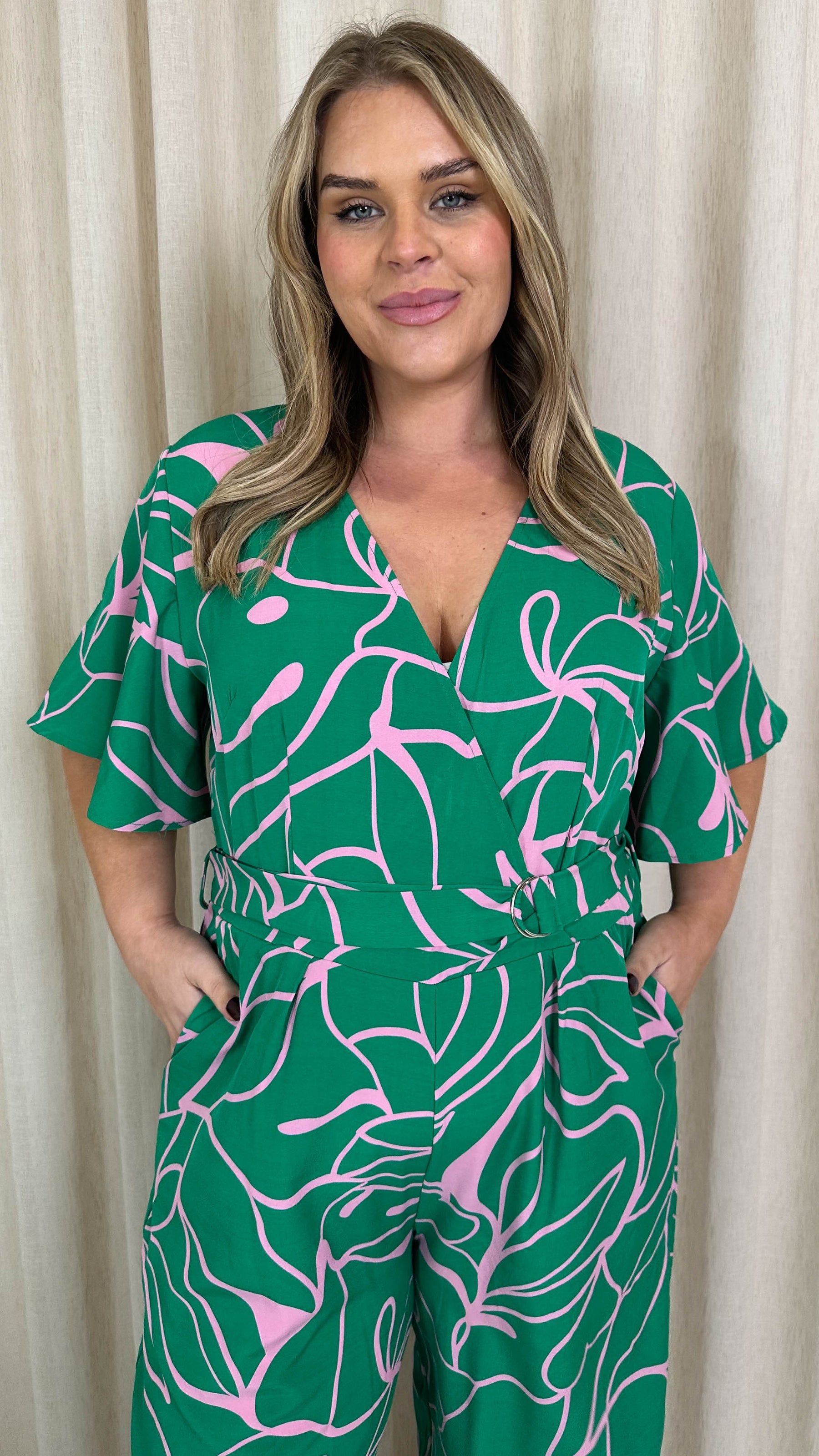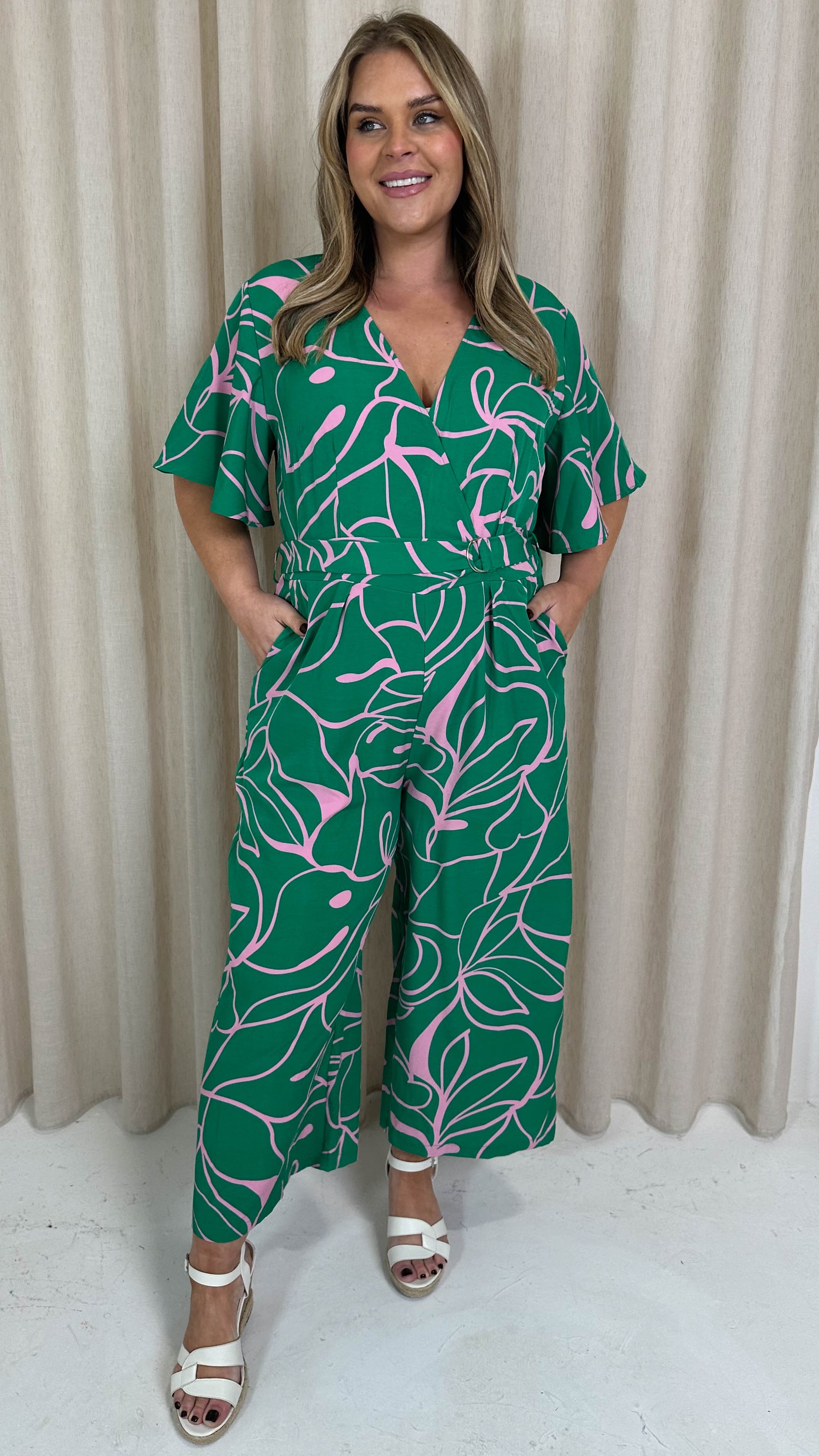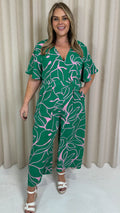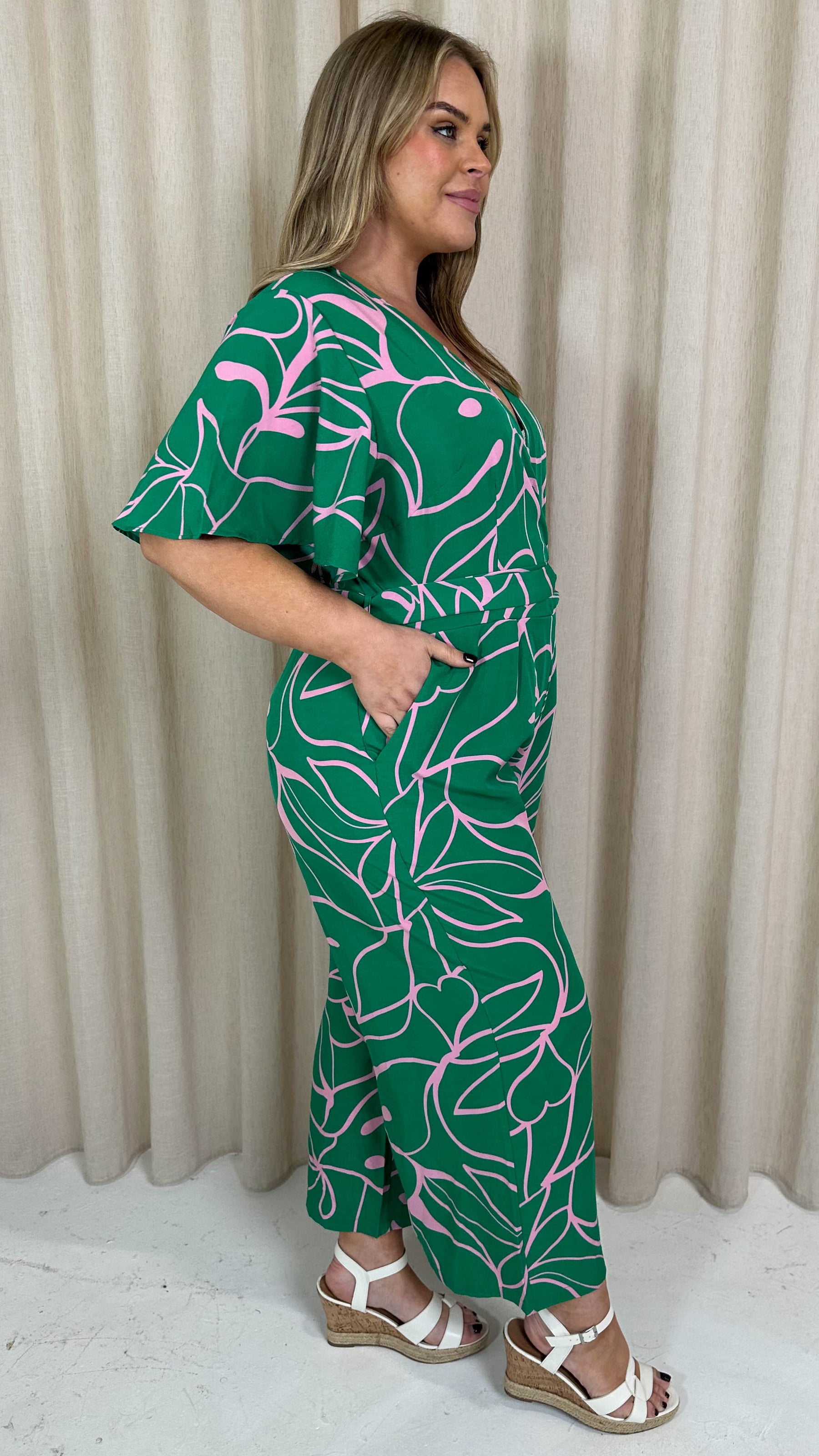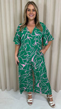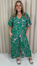 CurveWow Angel Sleeve Culotte Jumpsuit Green/Pink