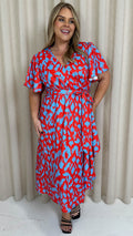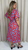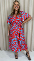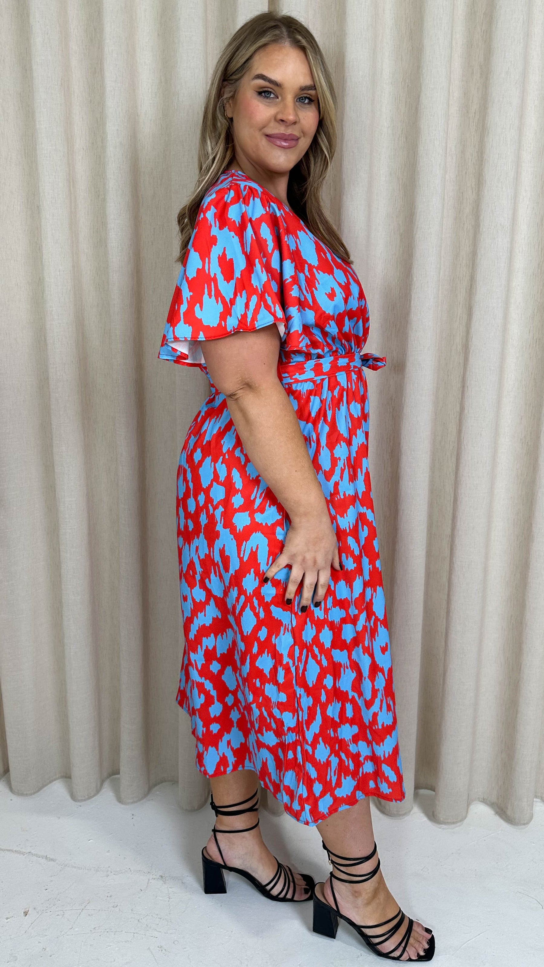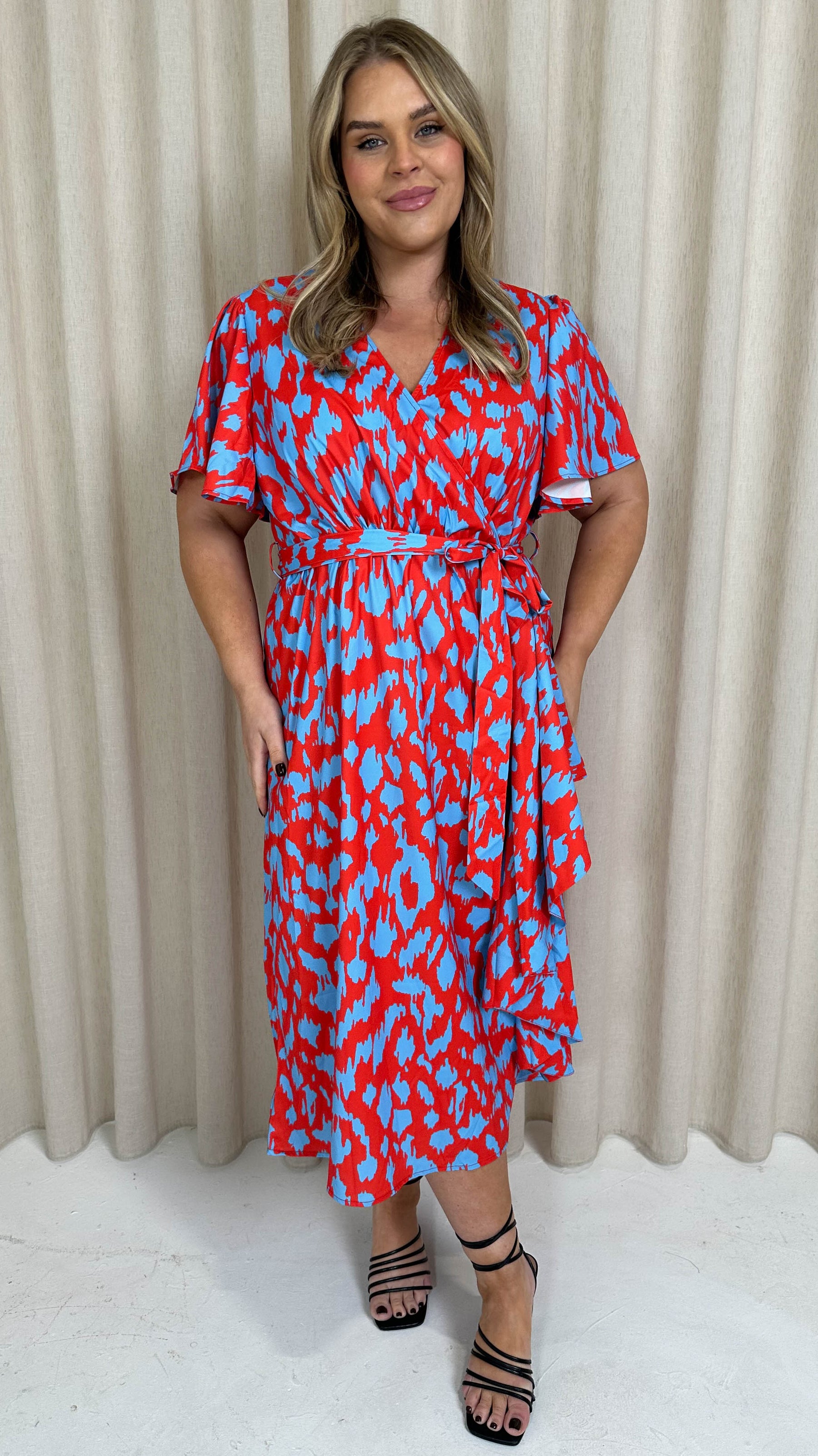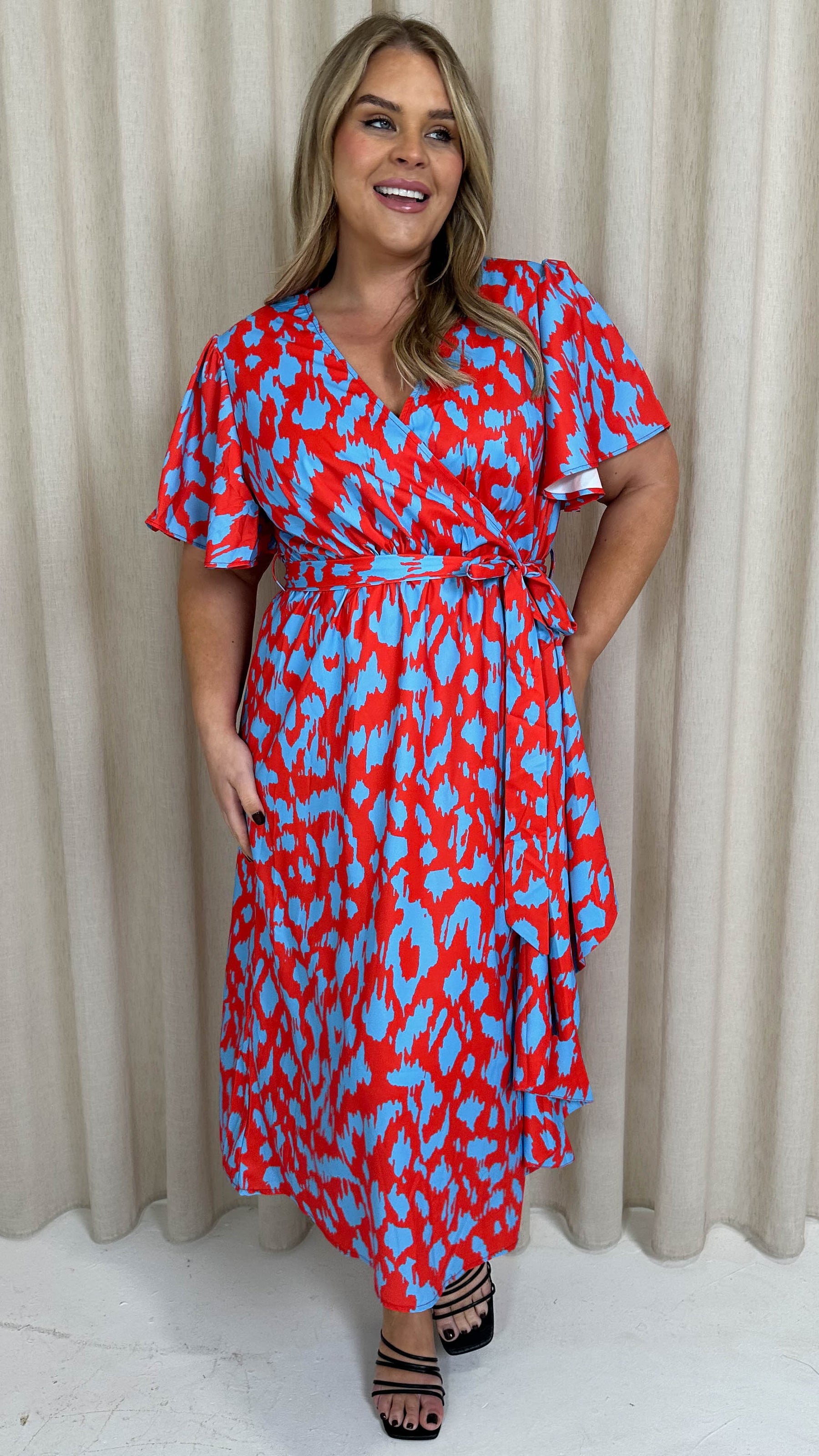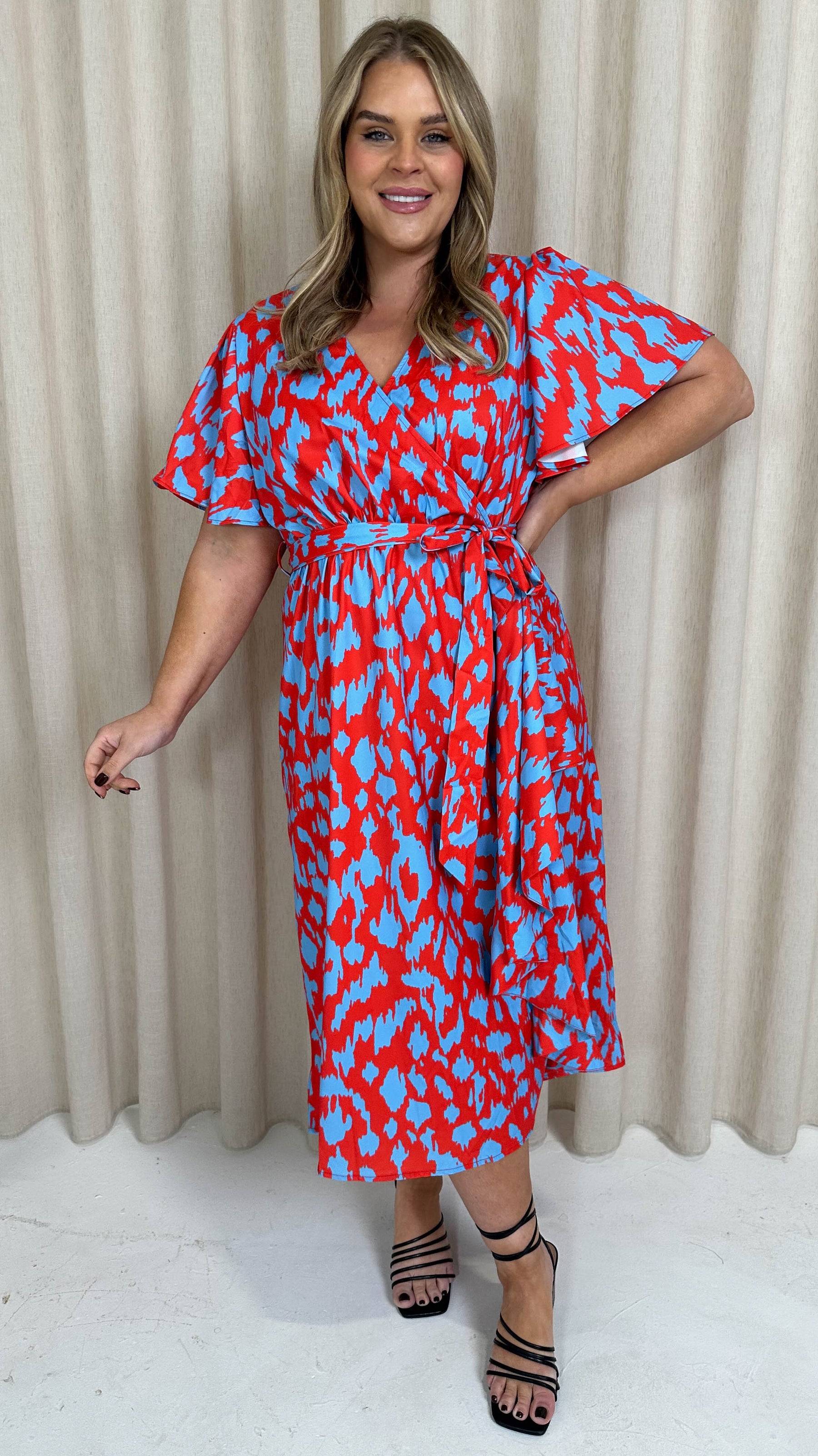 CurveWow Frill Side Angel Sleeve Wrap Midi Dress Red/Blue