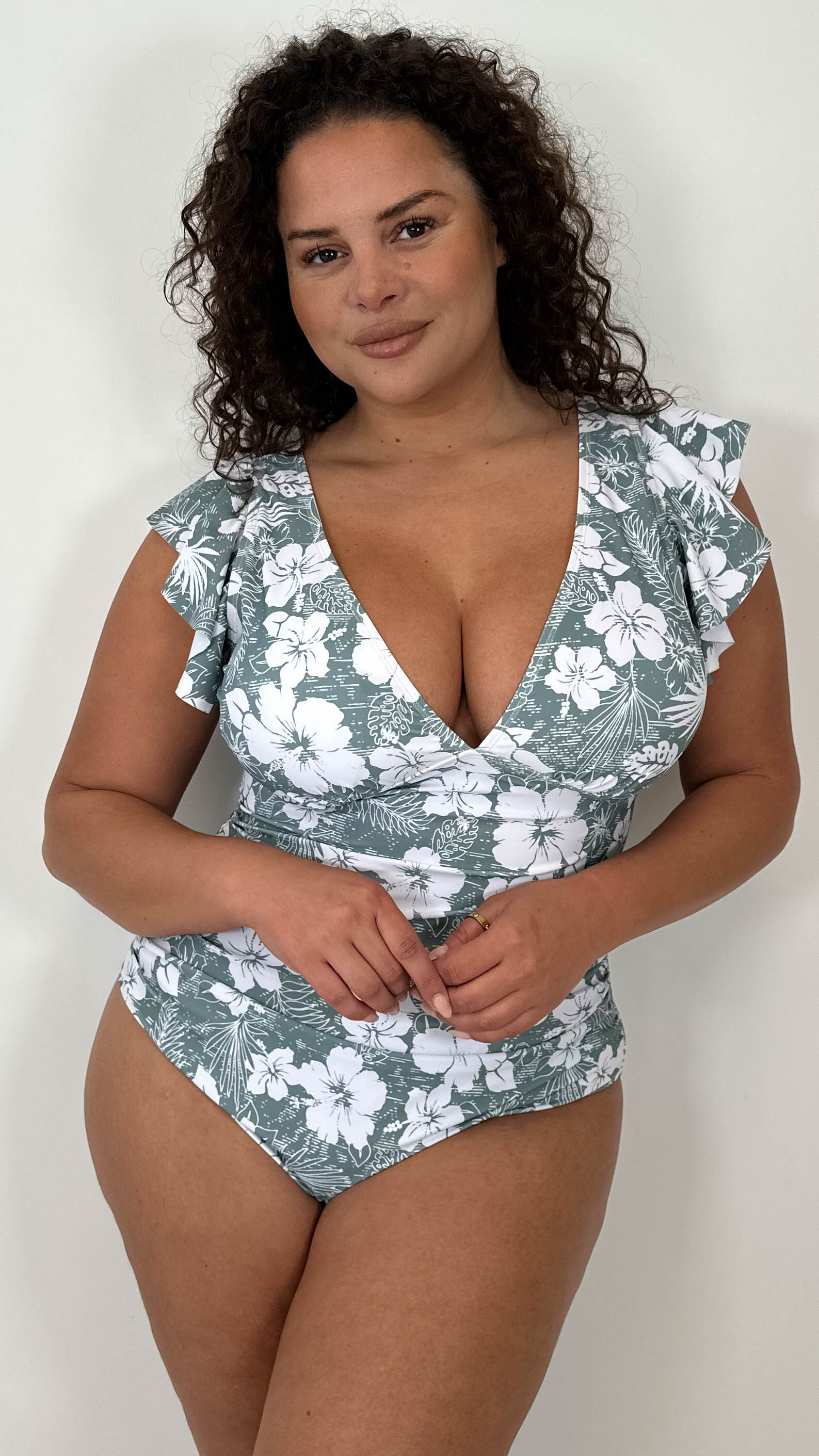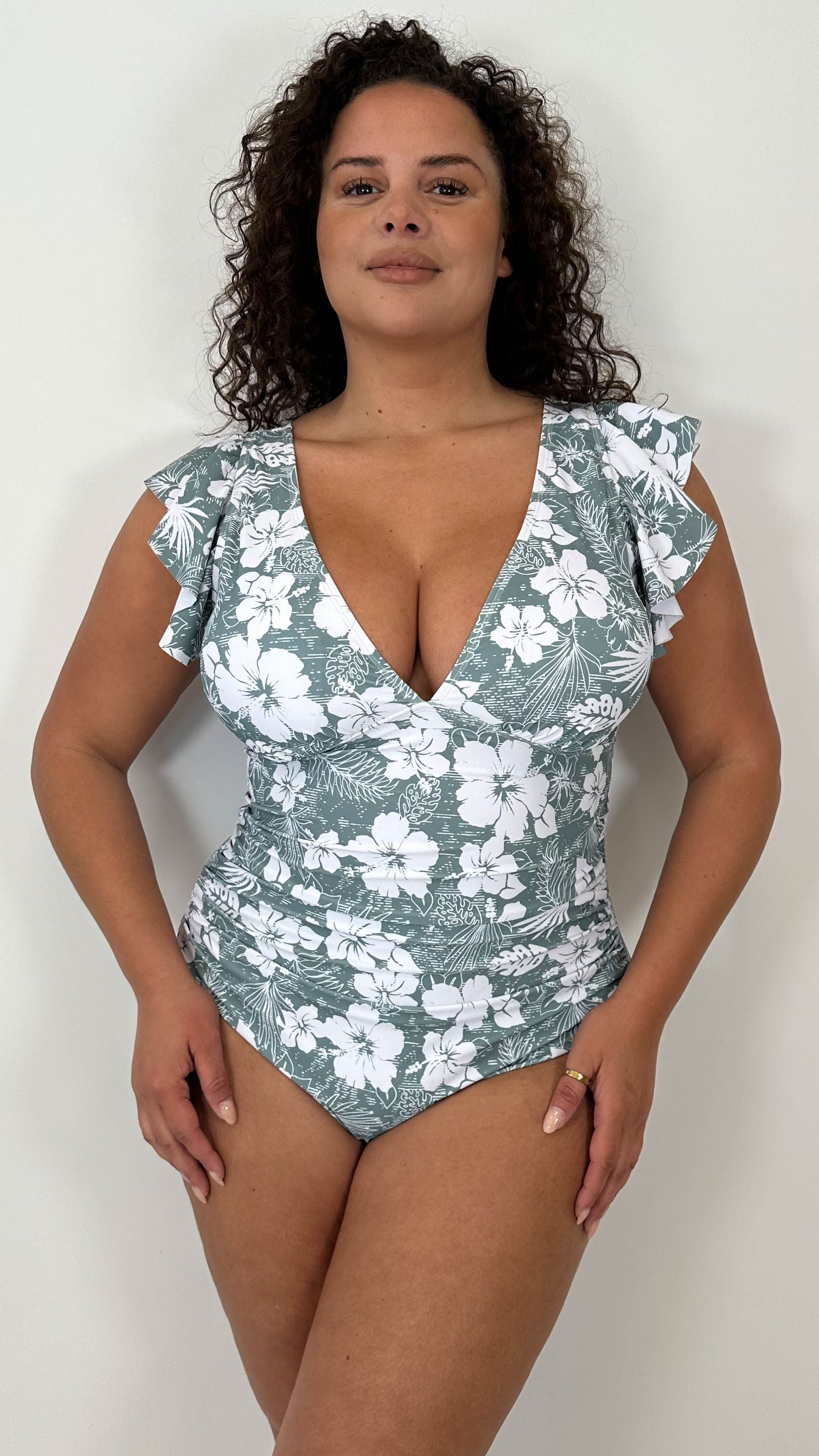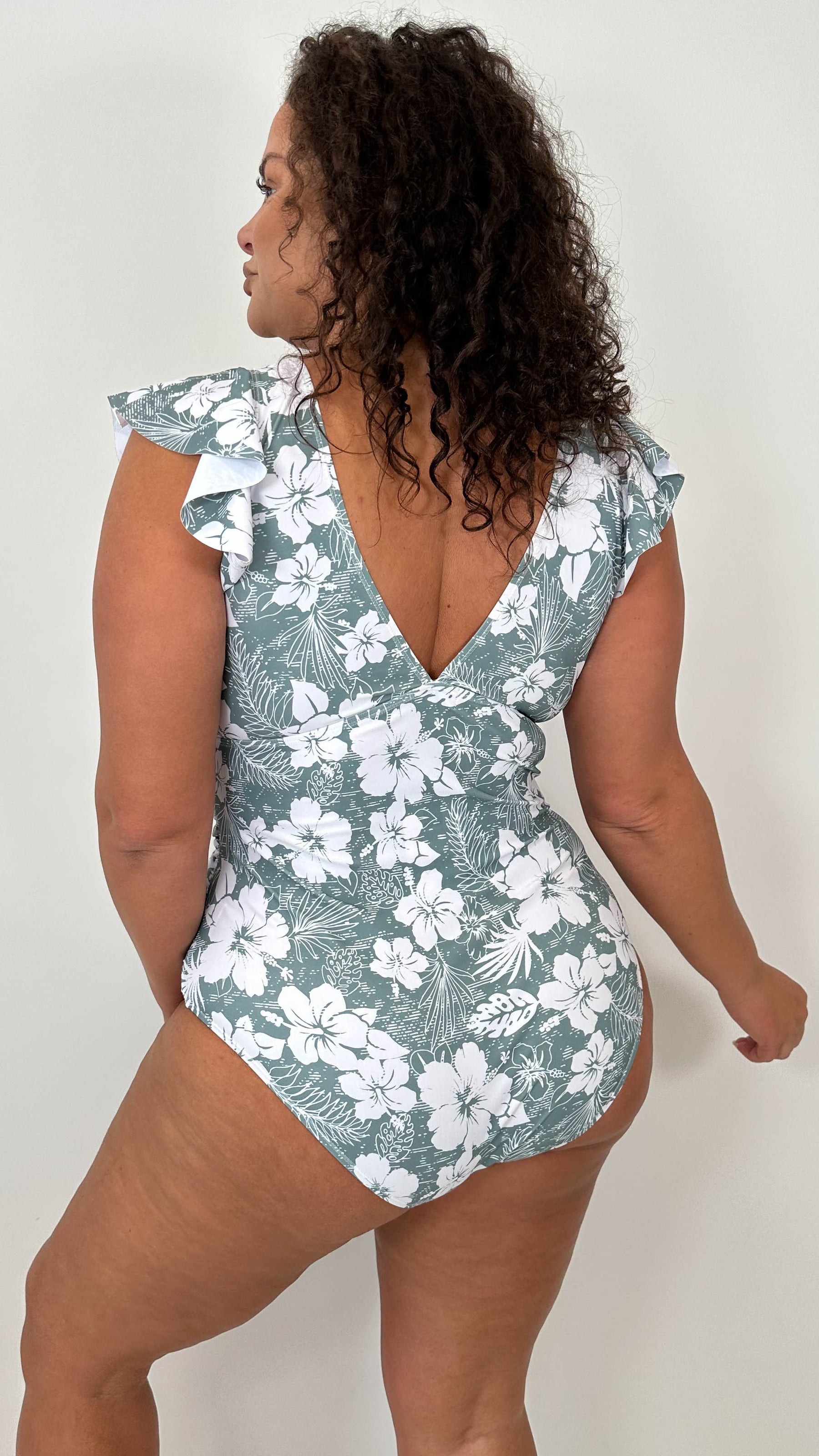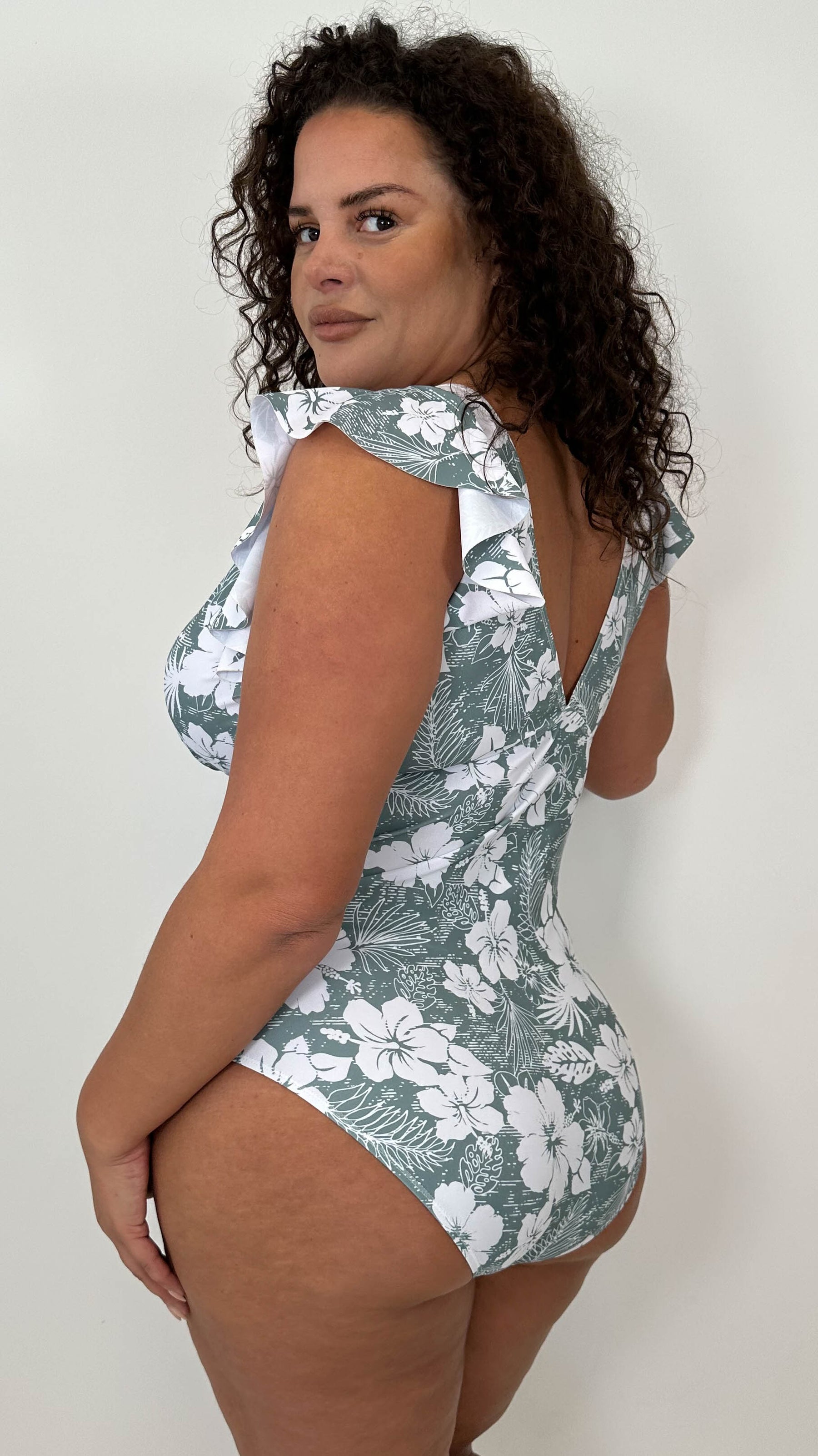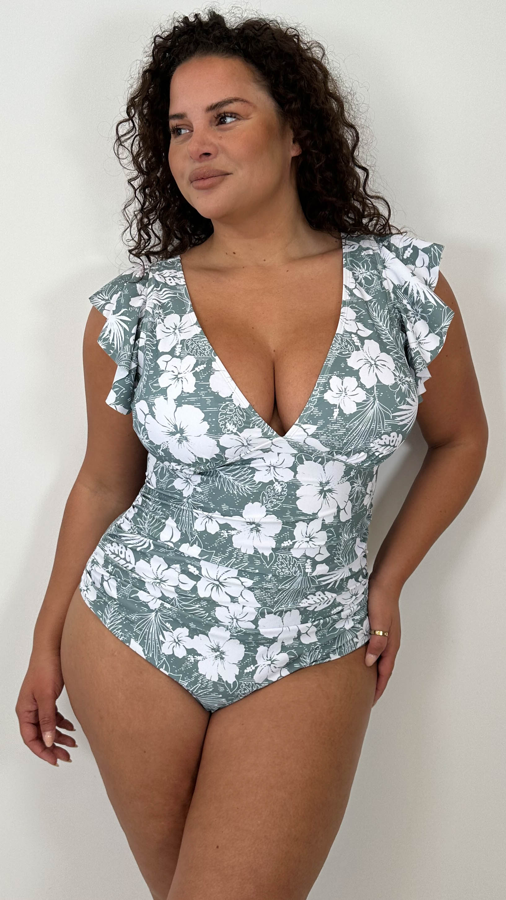 CurveWow Frill Sleeve Swimsuit Sage Green Tropical Floral