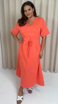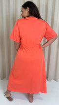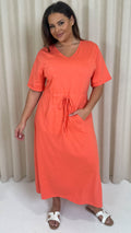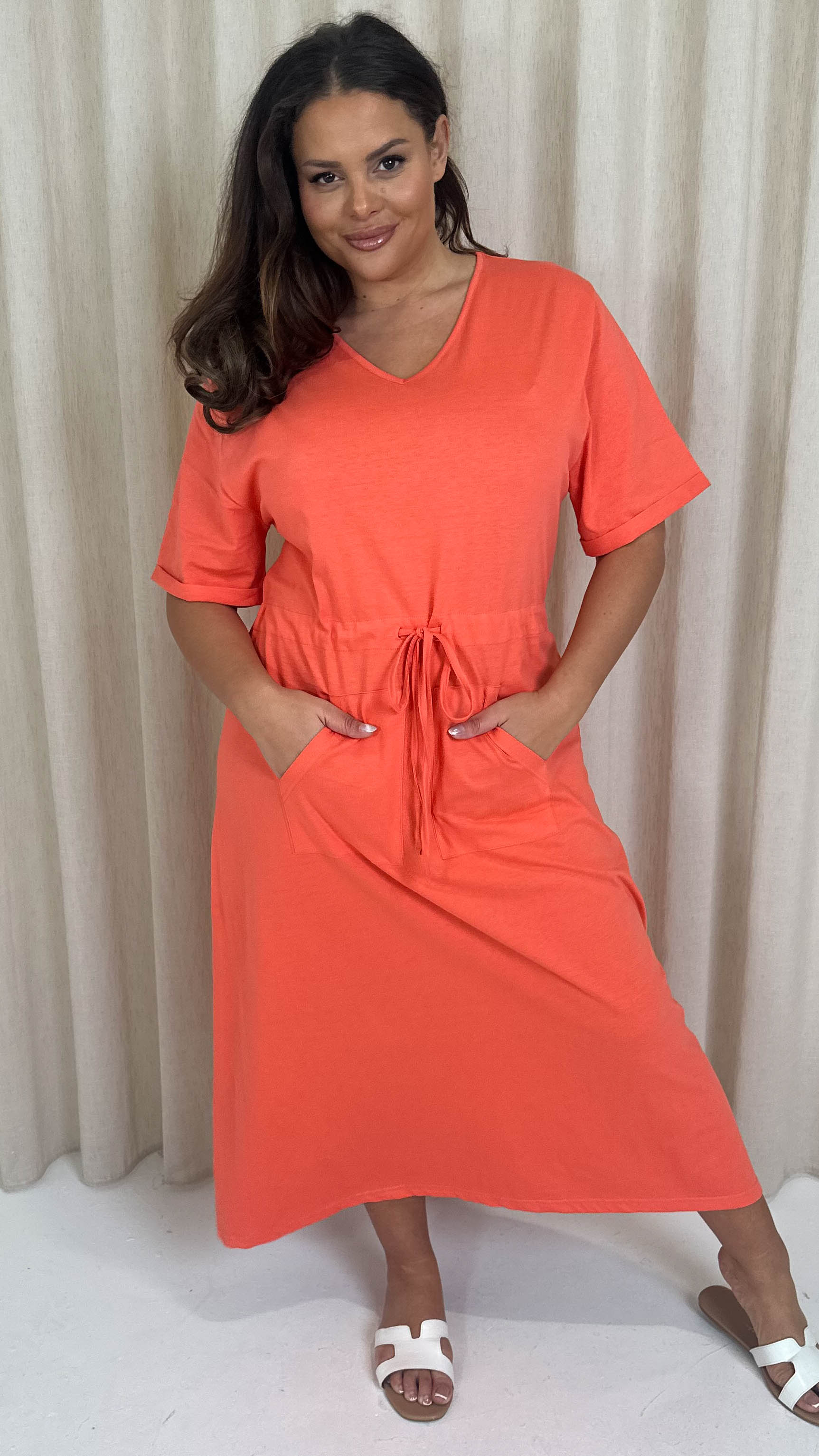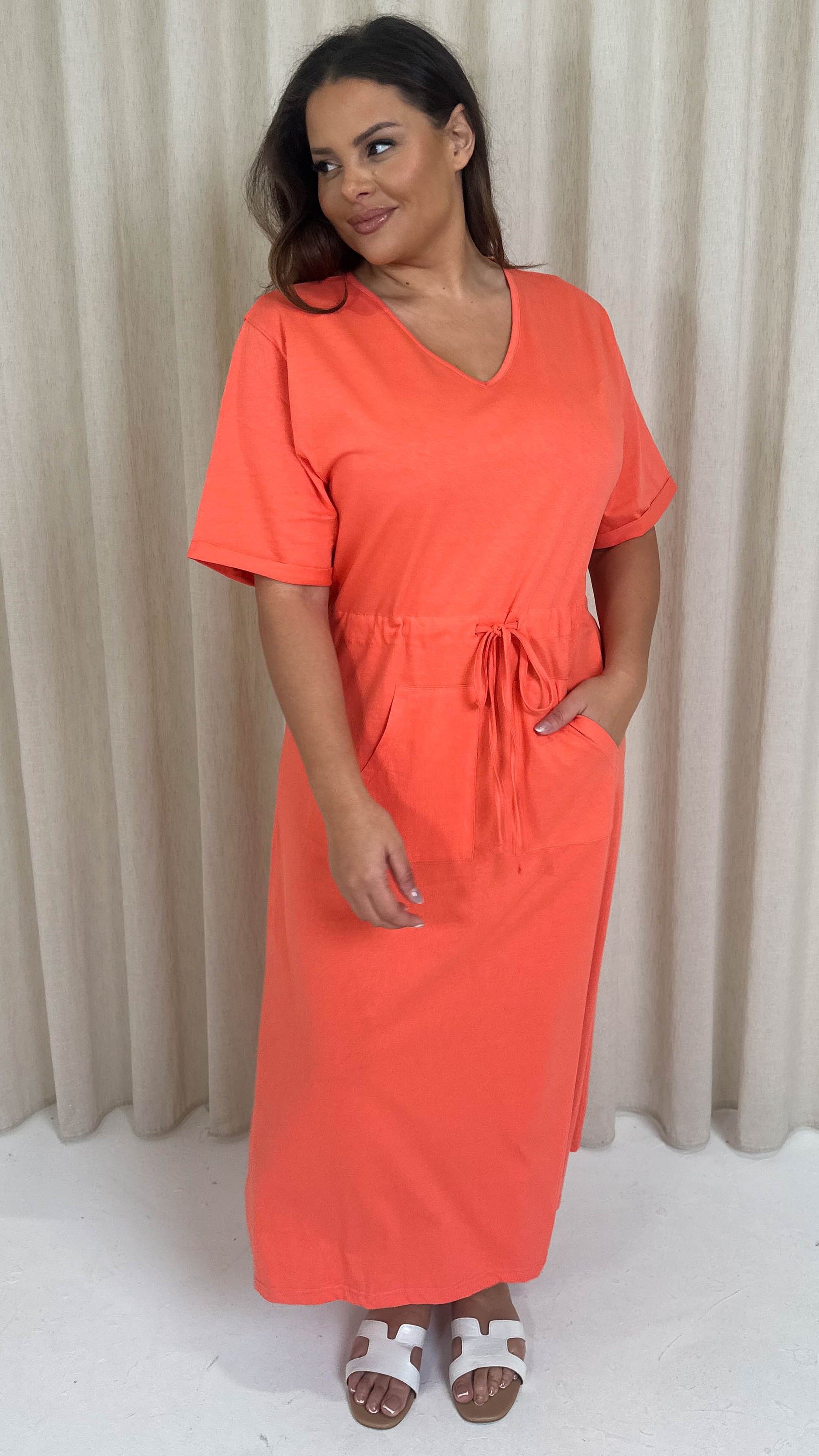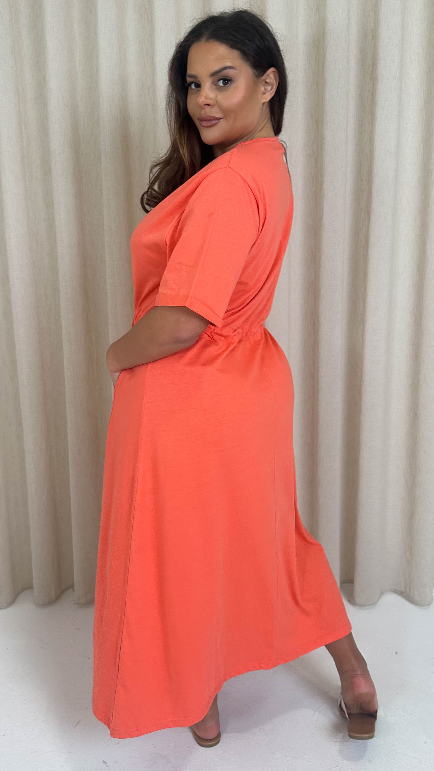 CurveWow Maxi T-Shirt Dress With Drawstring Hot Coral