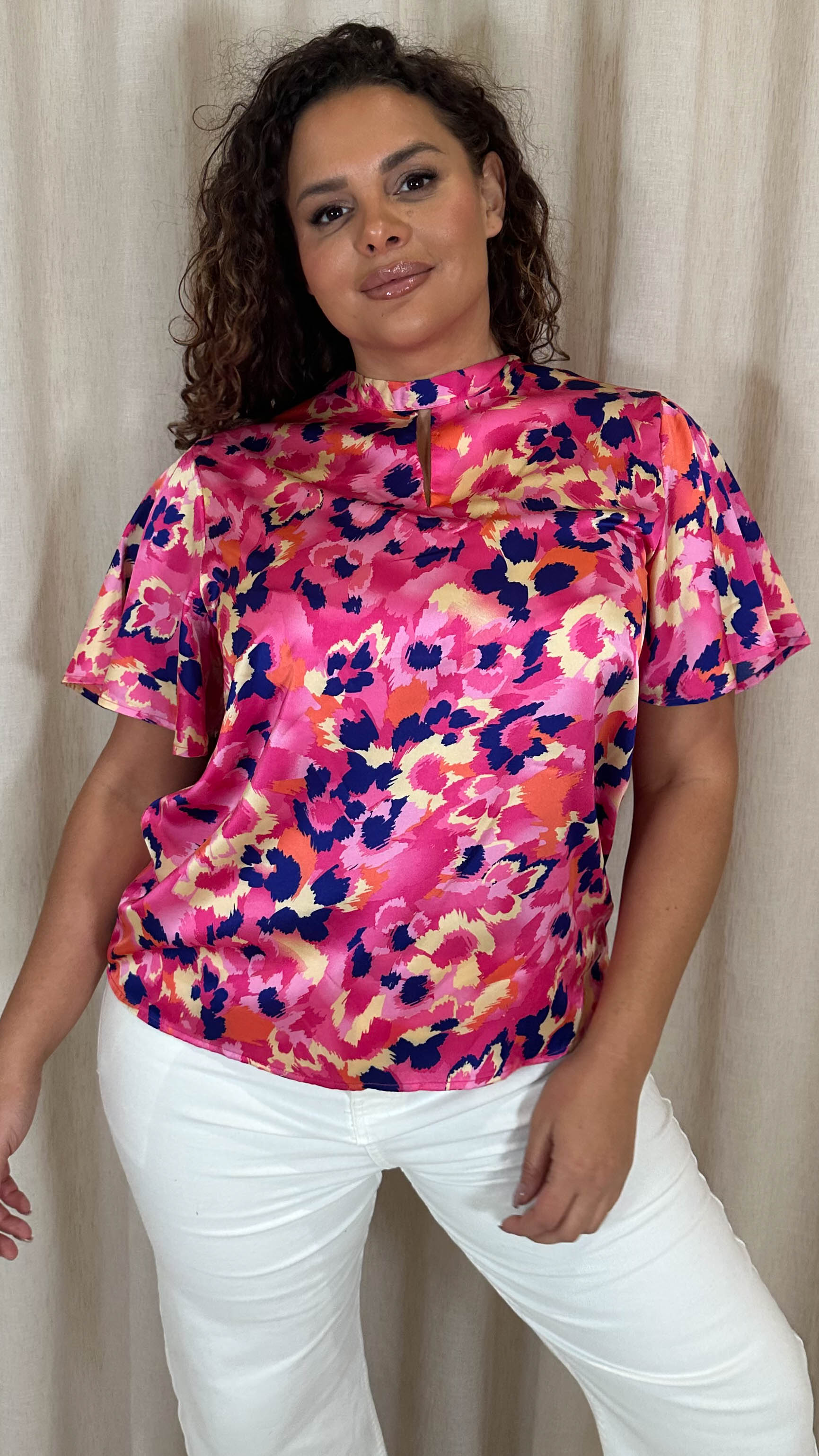 CurveWow Printed Satin Keyhole Top Pink Leopard