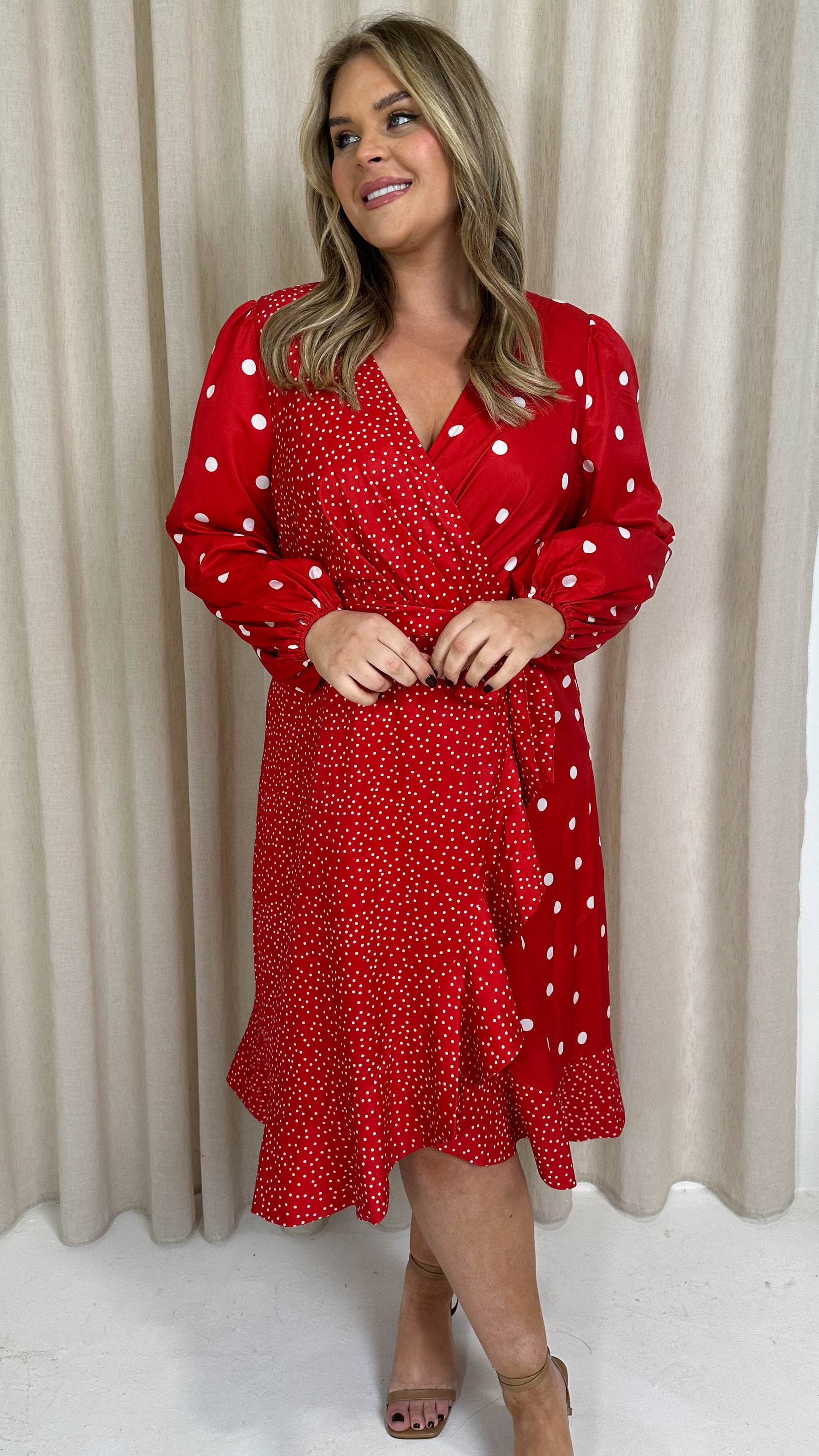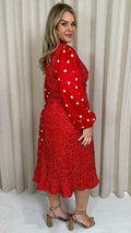 CurveWow Spliced Polkadot Frill Hem Wrap Dress Red