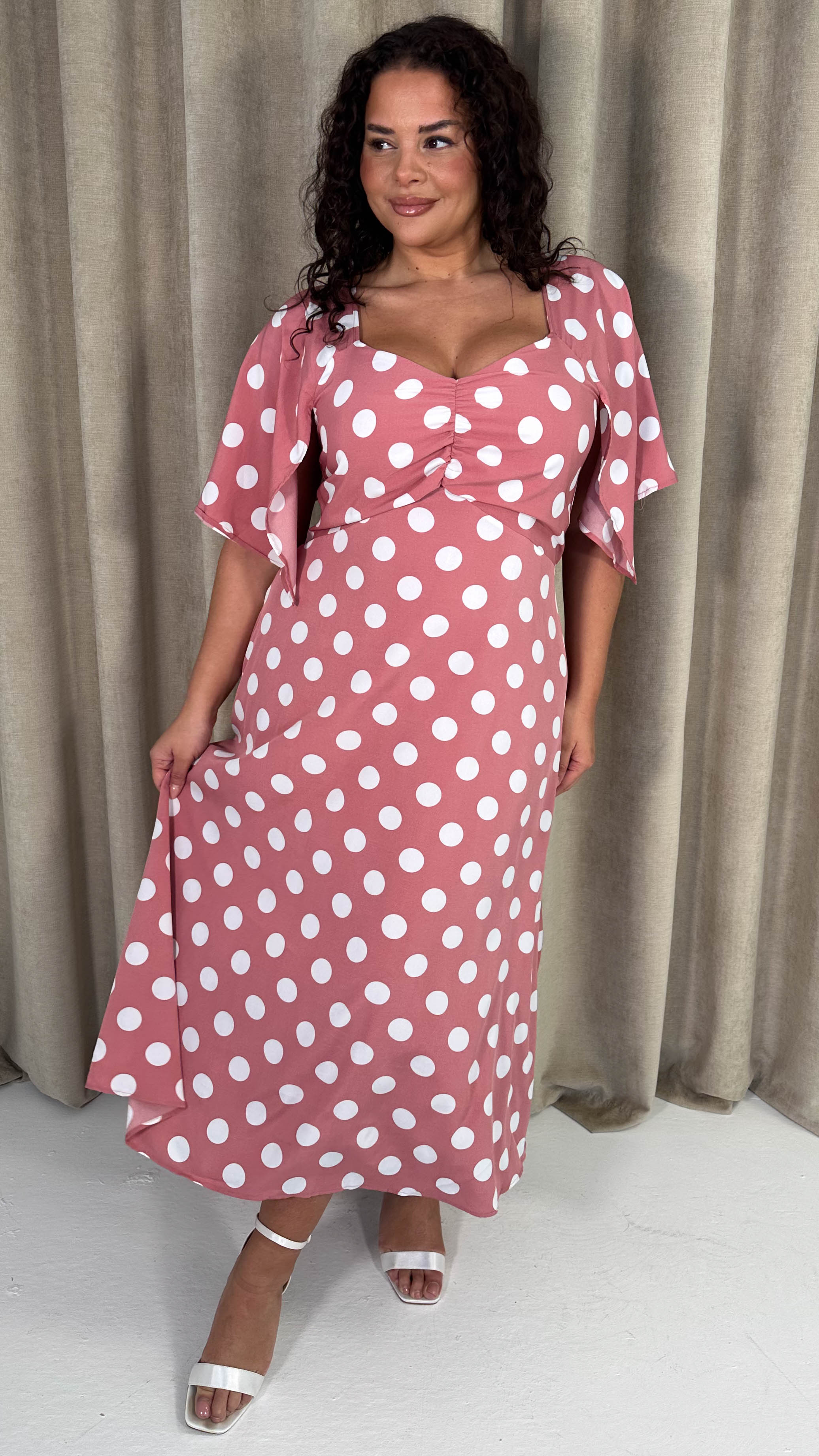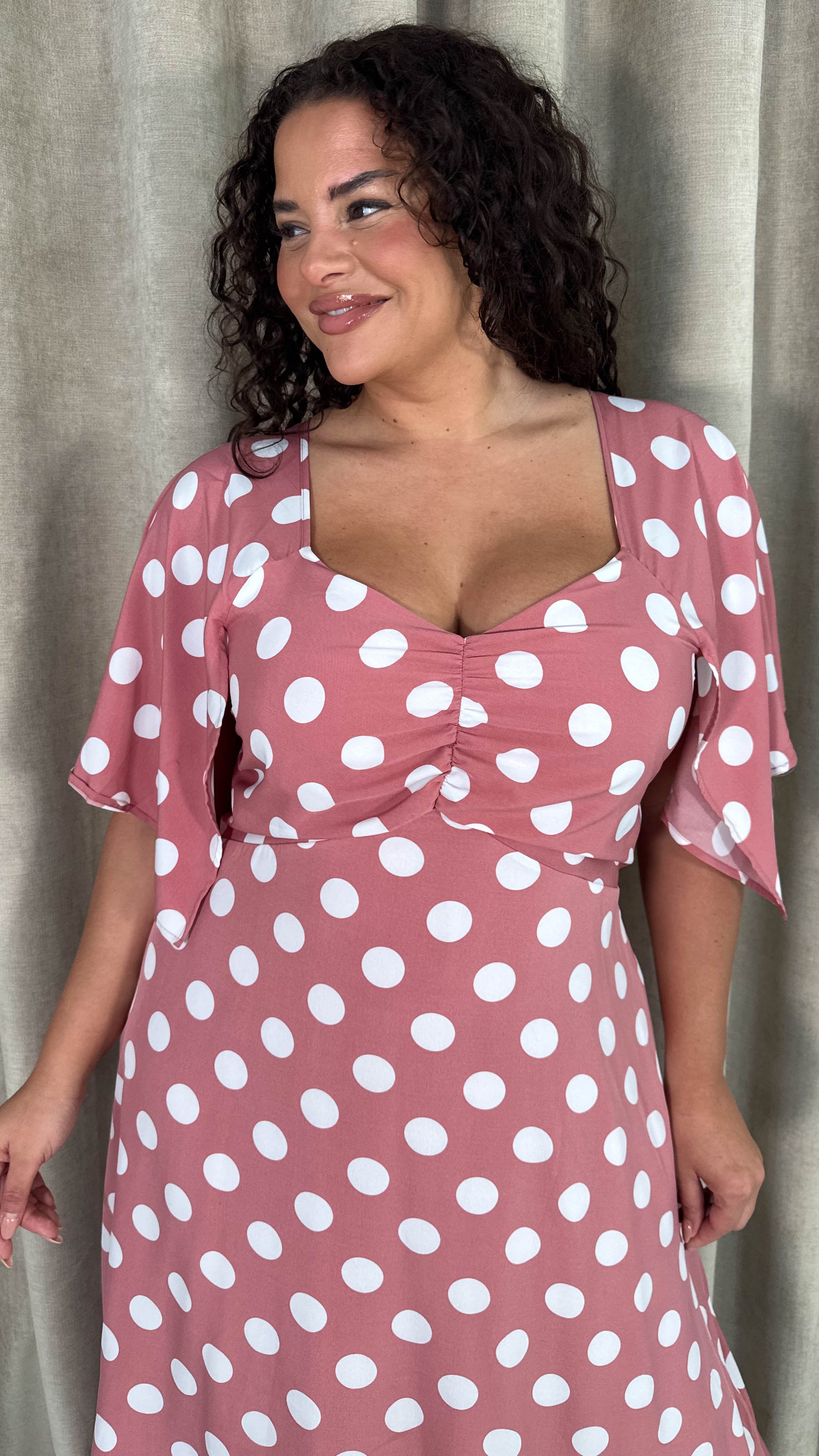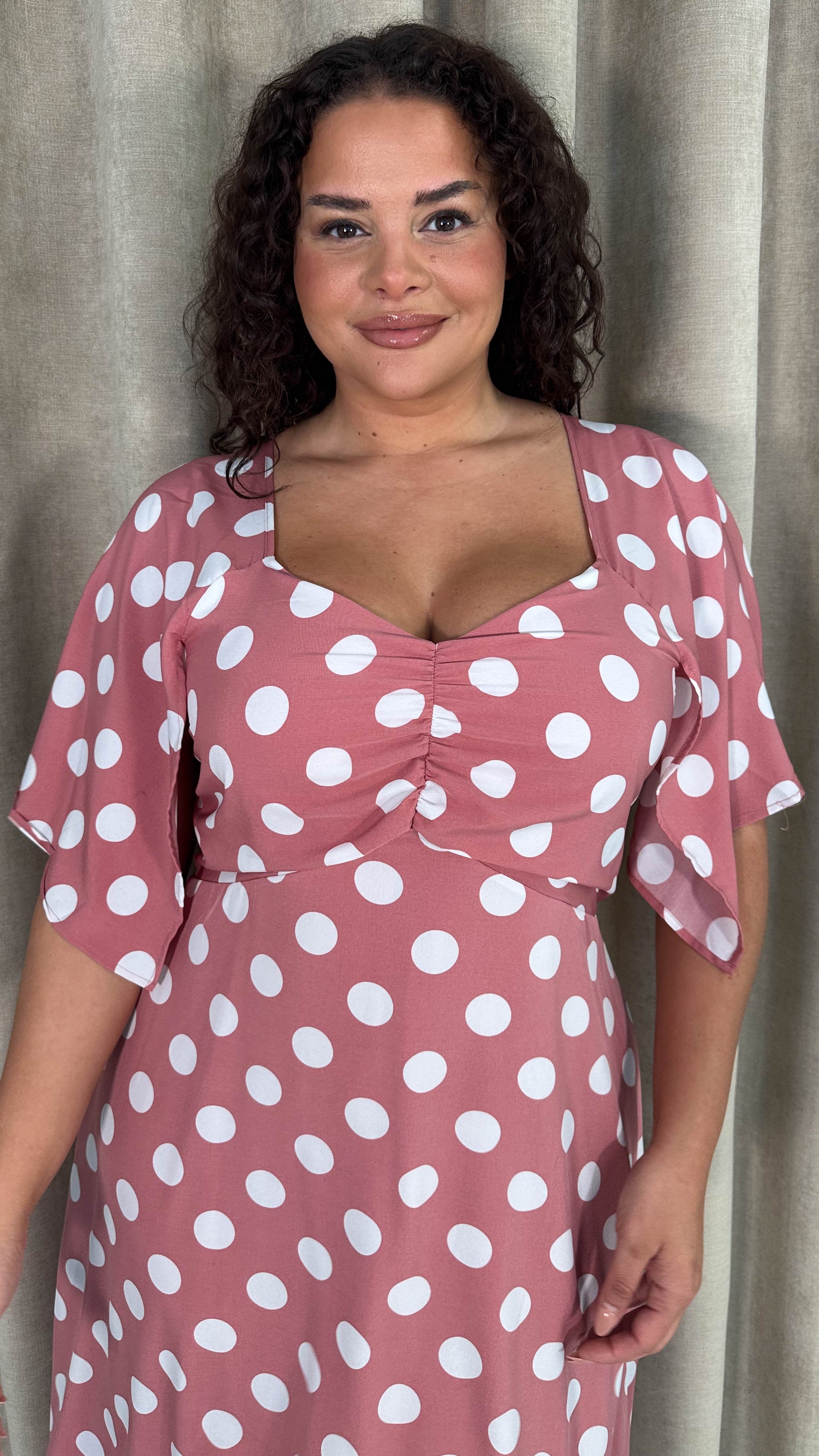 CurveWow Ruched Front Midi Dress Pink Polka Dot