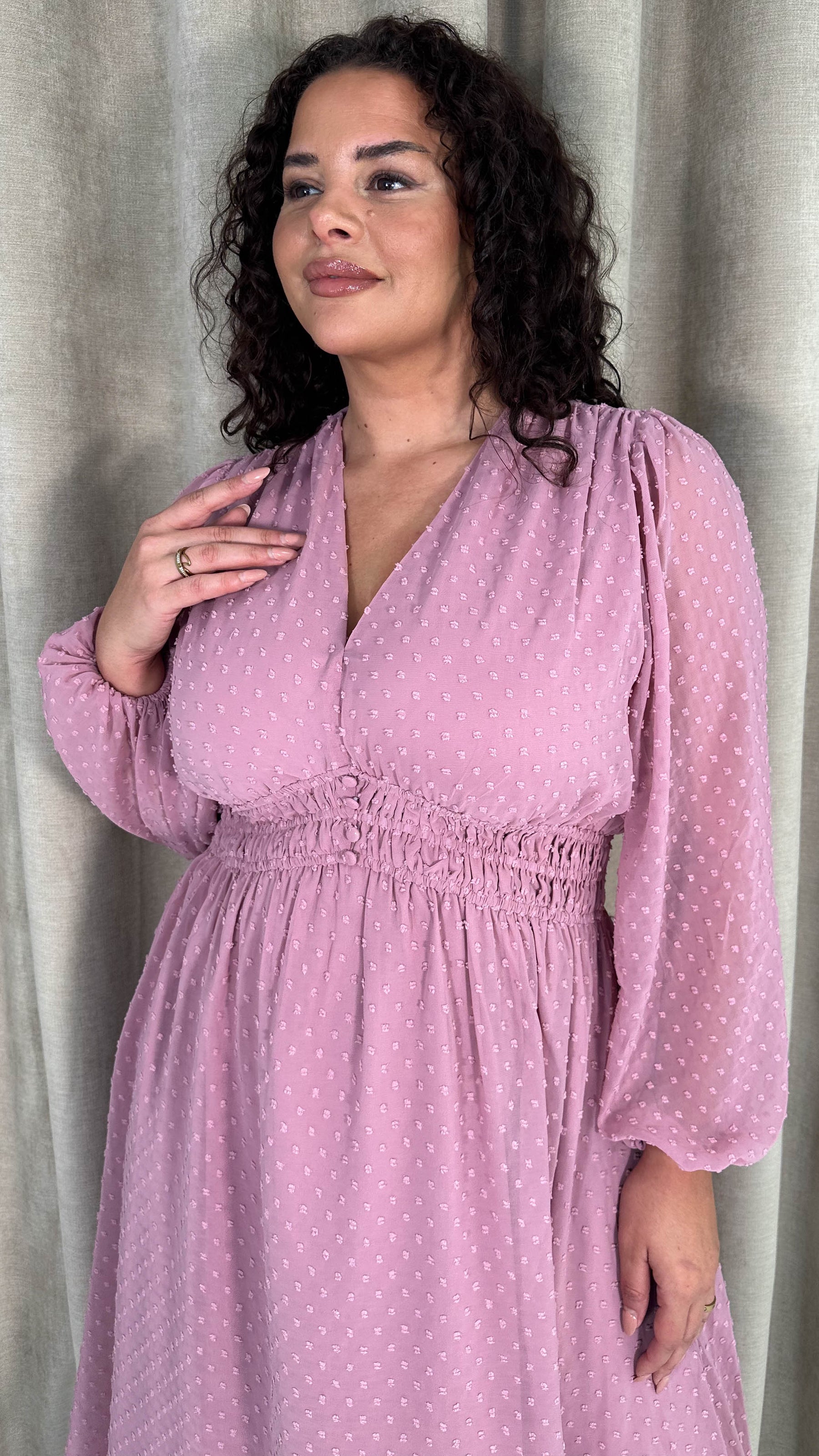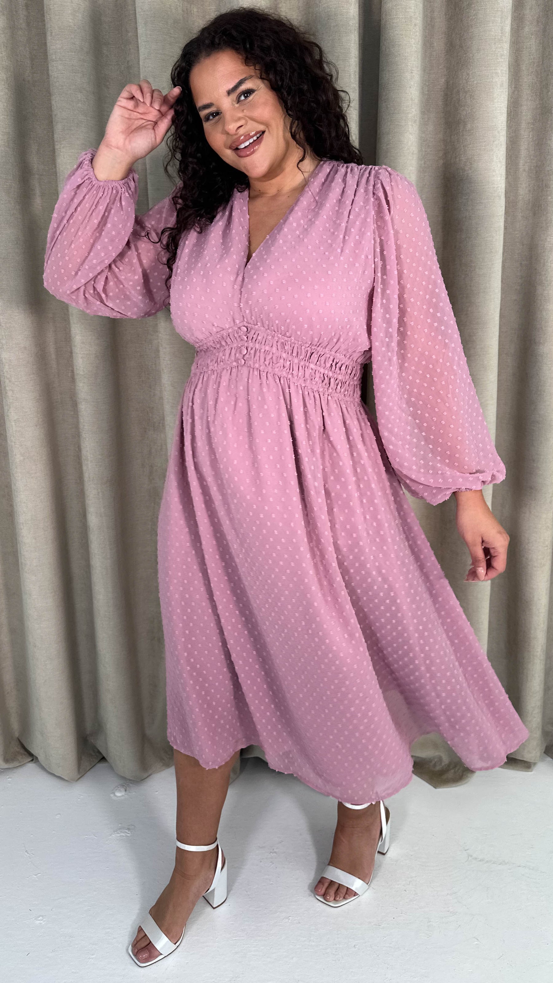 CurveWow Dobby Shirred Bodice Midi Dress Pink