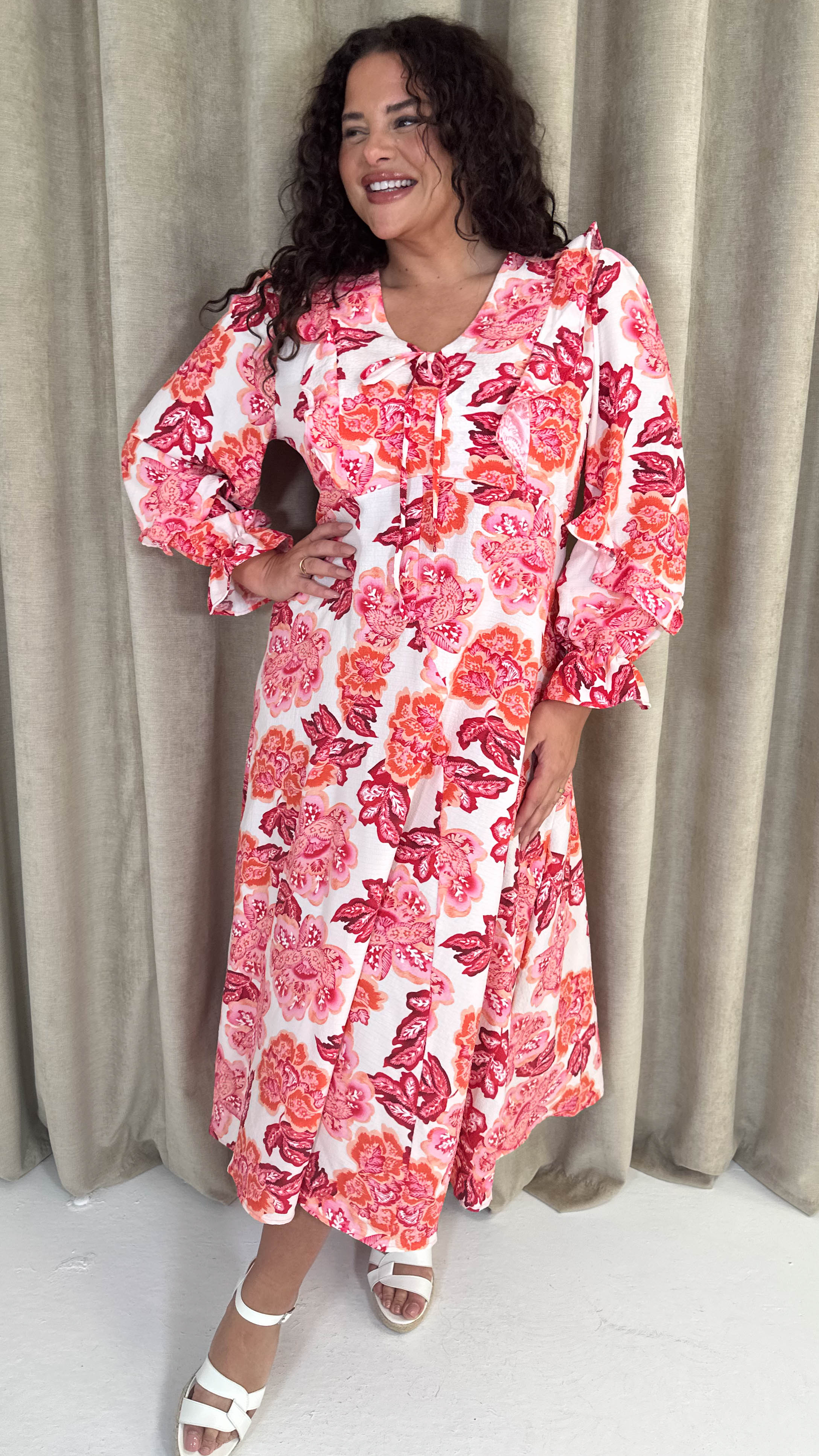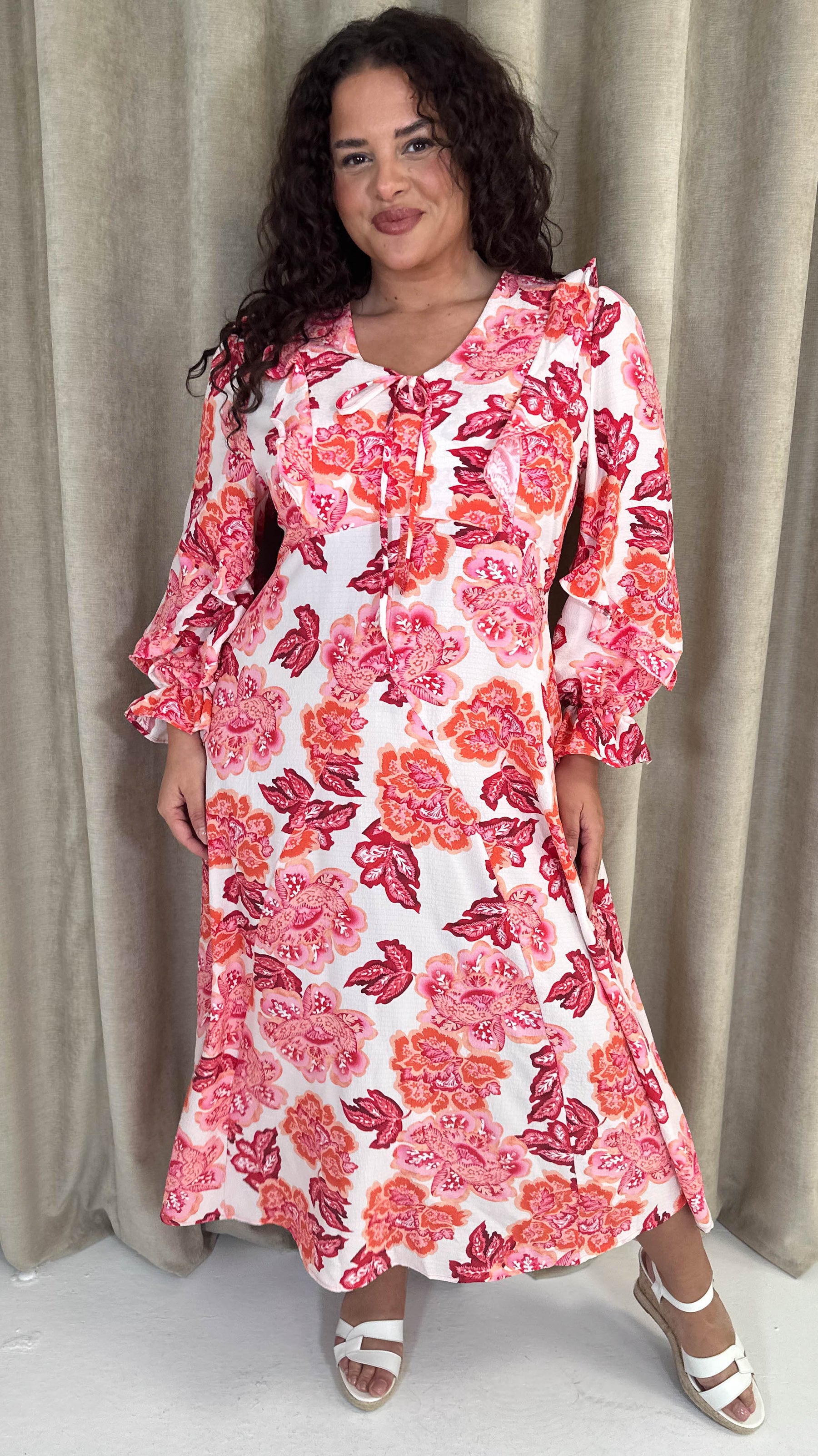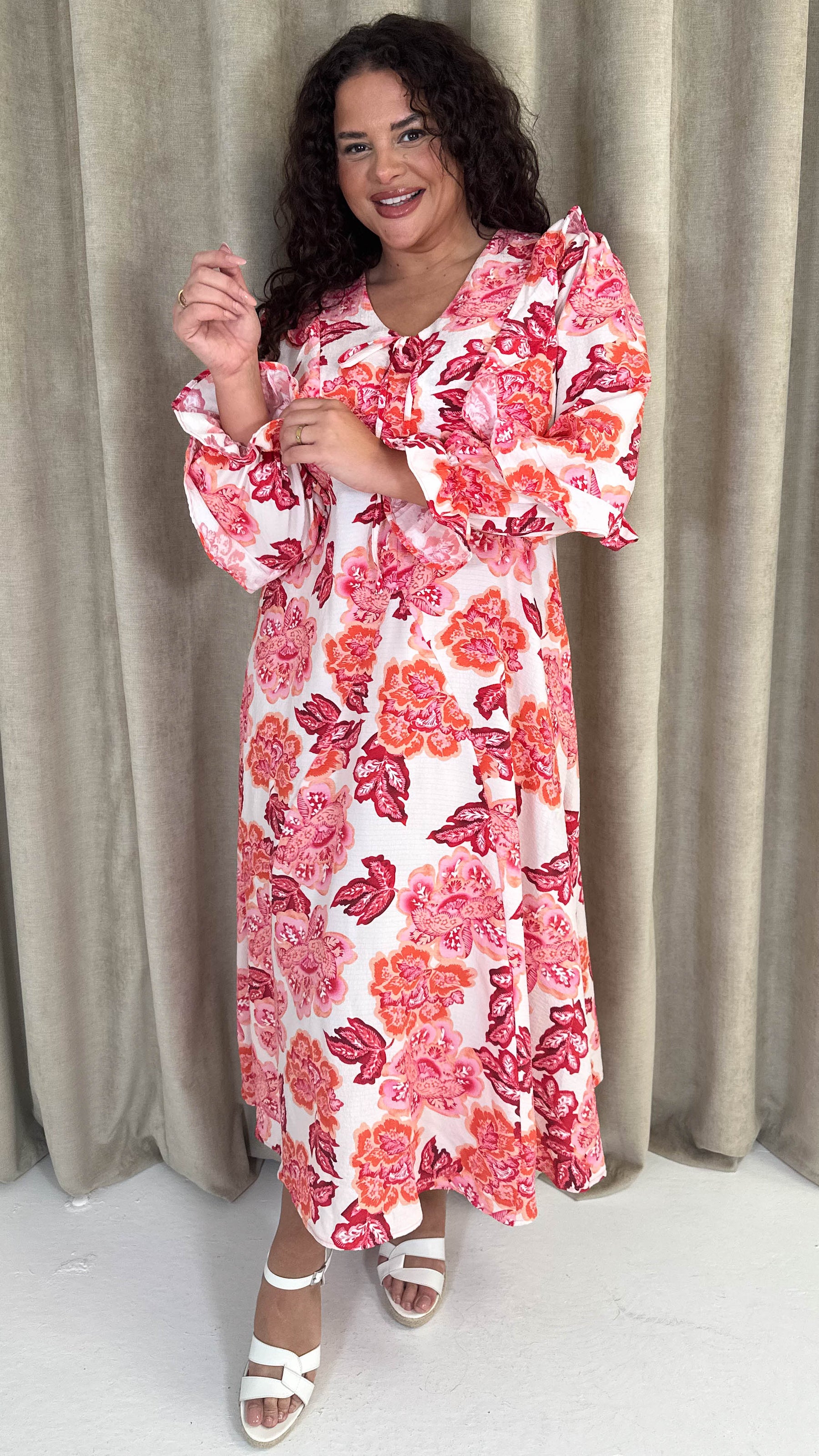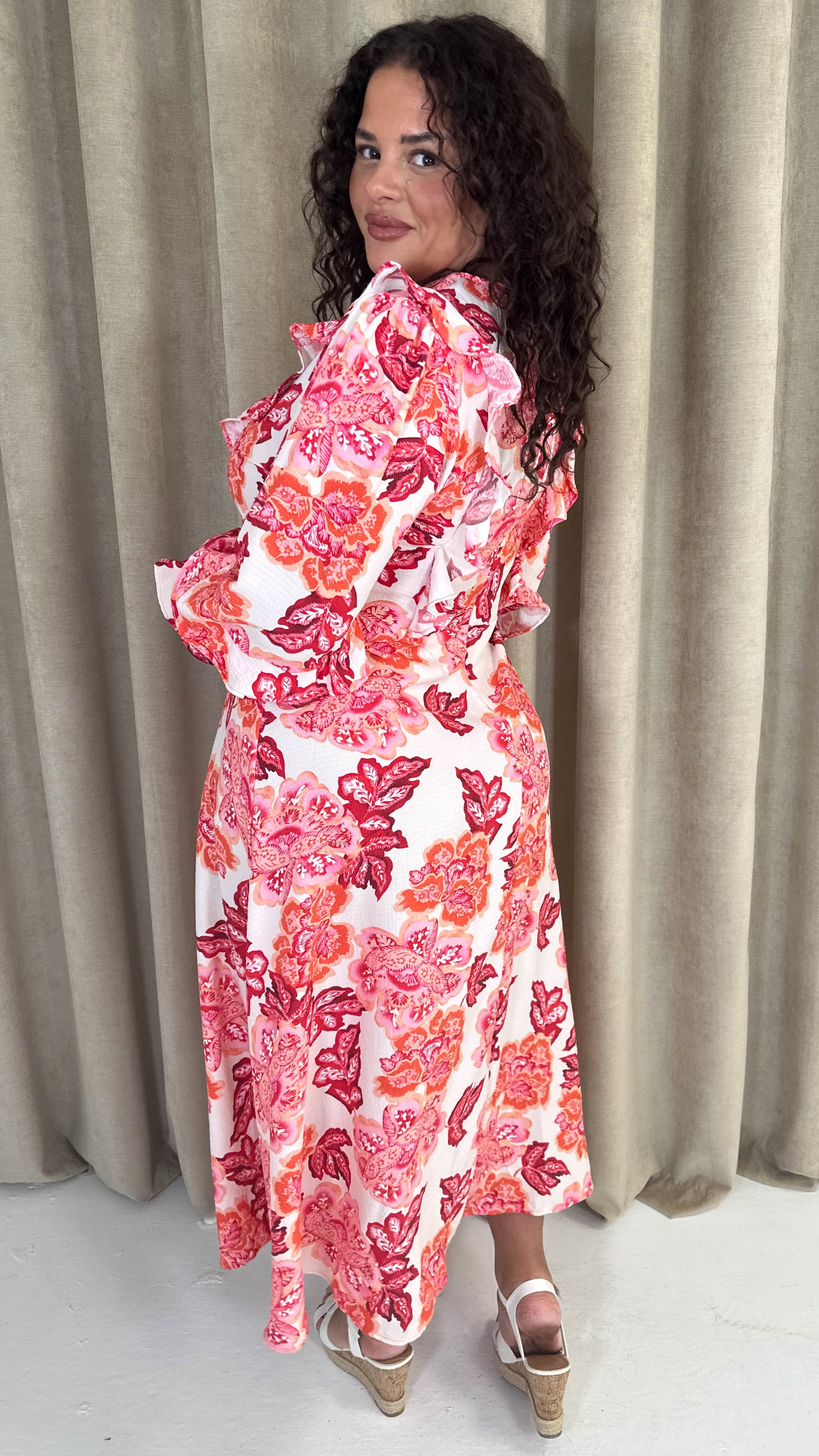 CurveWow Frill Sleeve Maxi Dress Cream & Red Floral