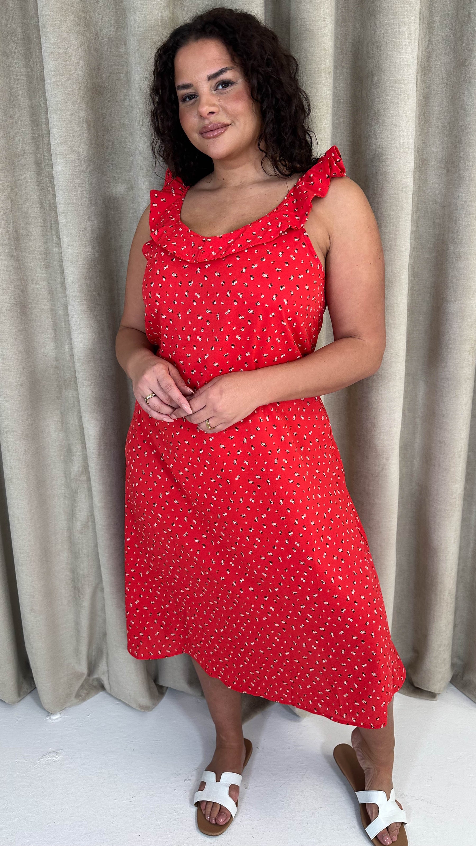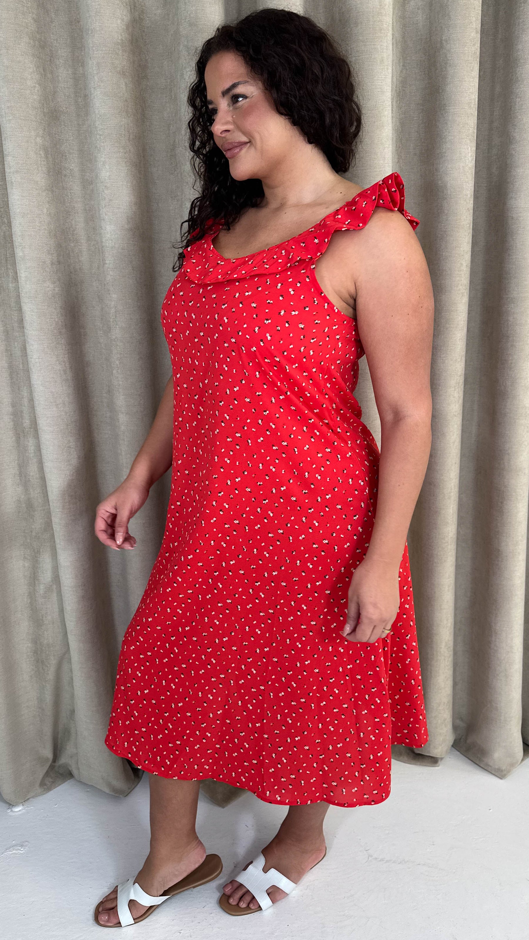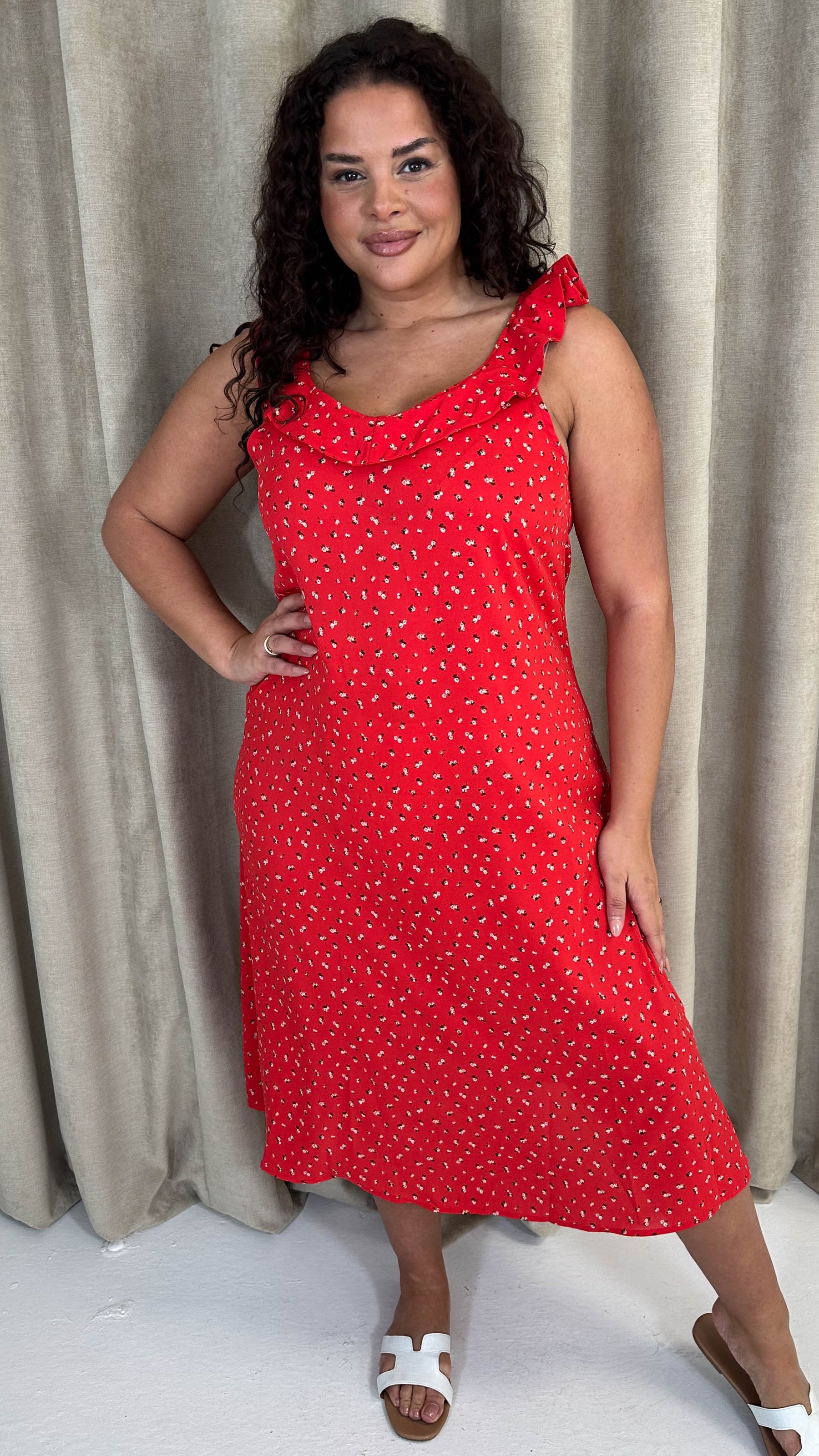 CurveWow Frill V-Neck Summer Dress Red Ditsy