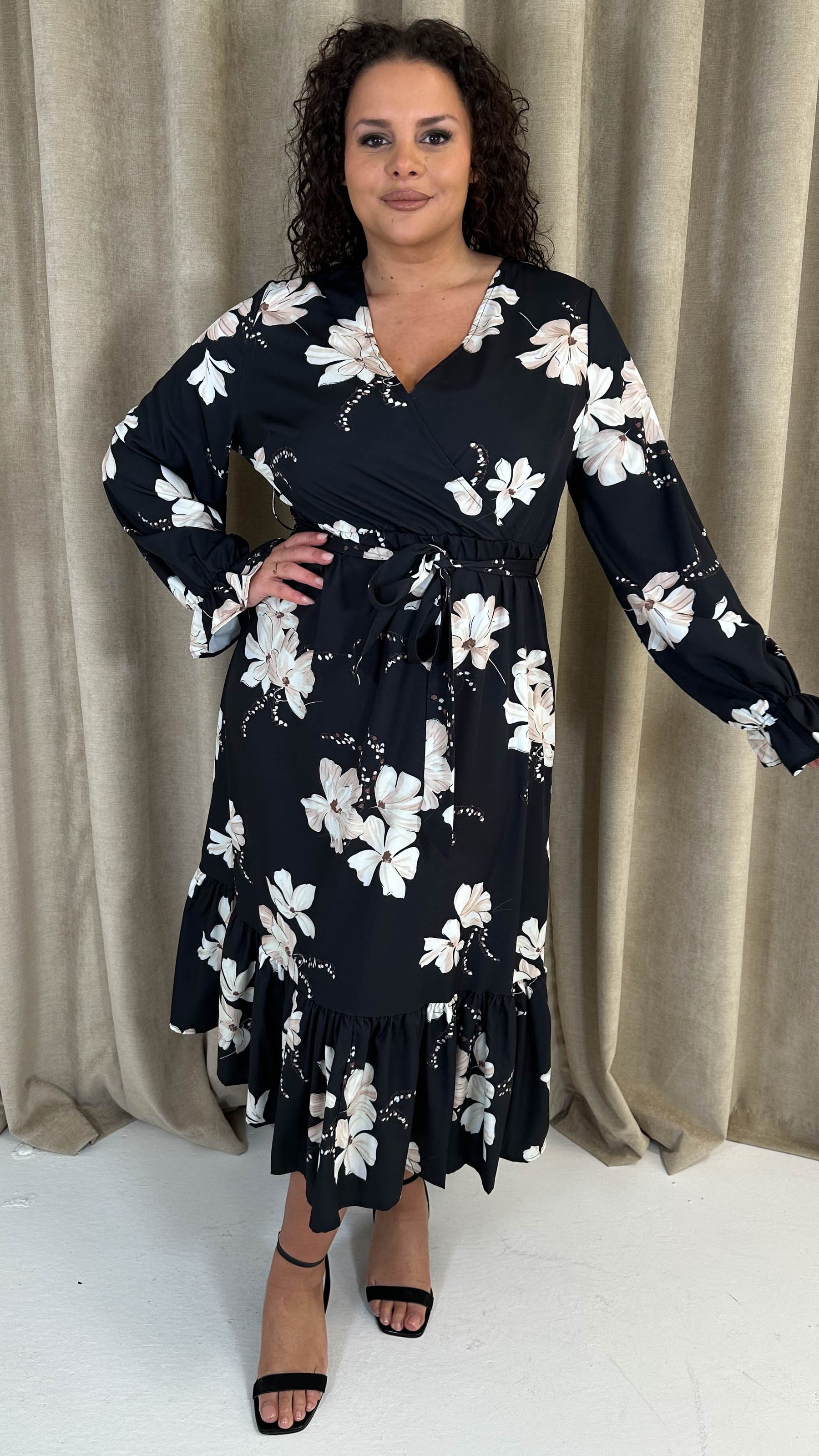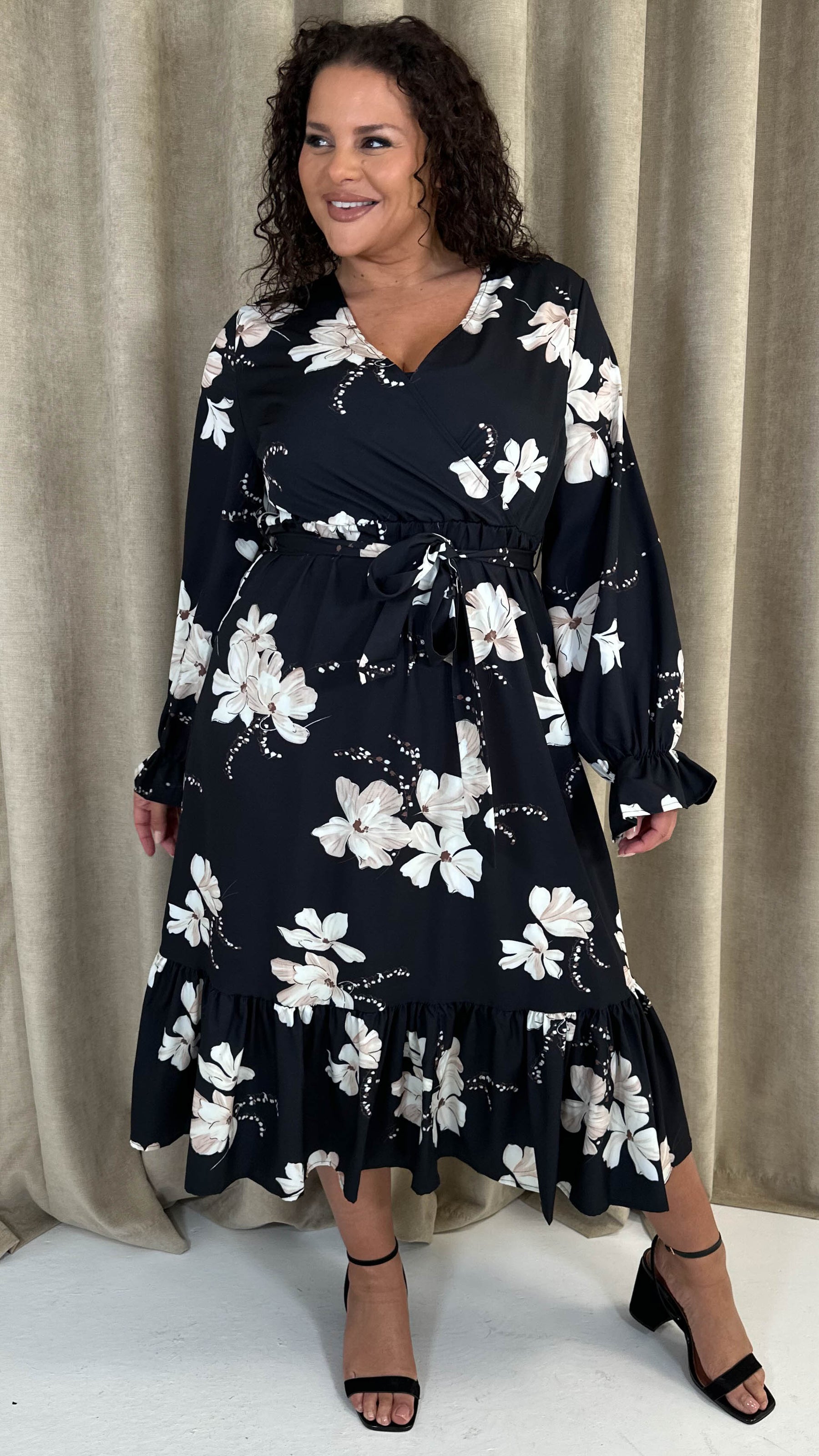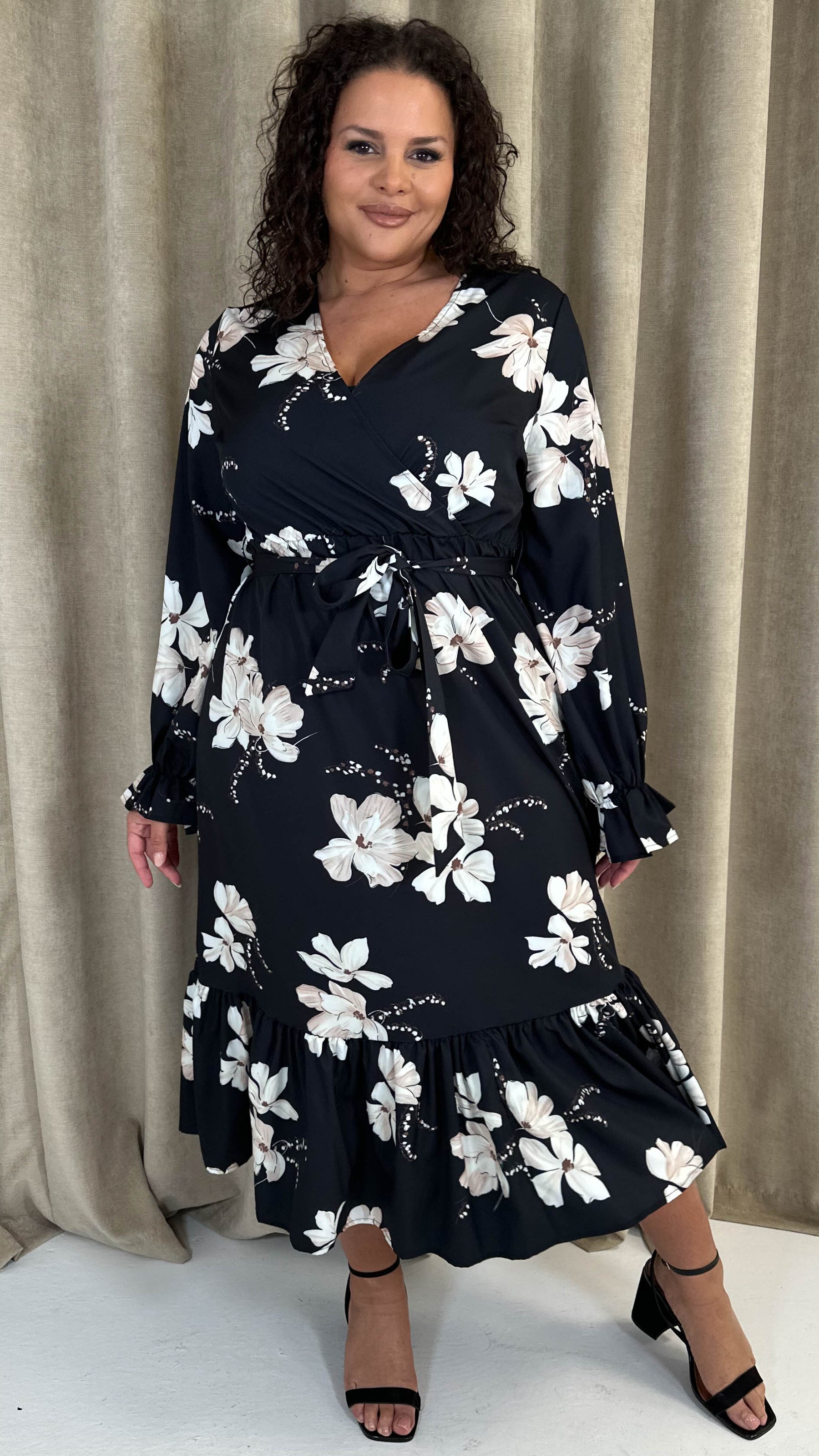 CurveWow Long Sleeve Floral Wrap Midaxi Dress Black/Ivory
