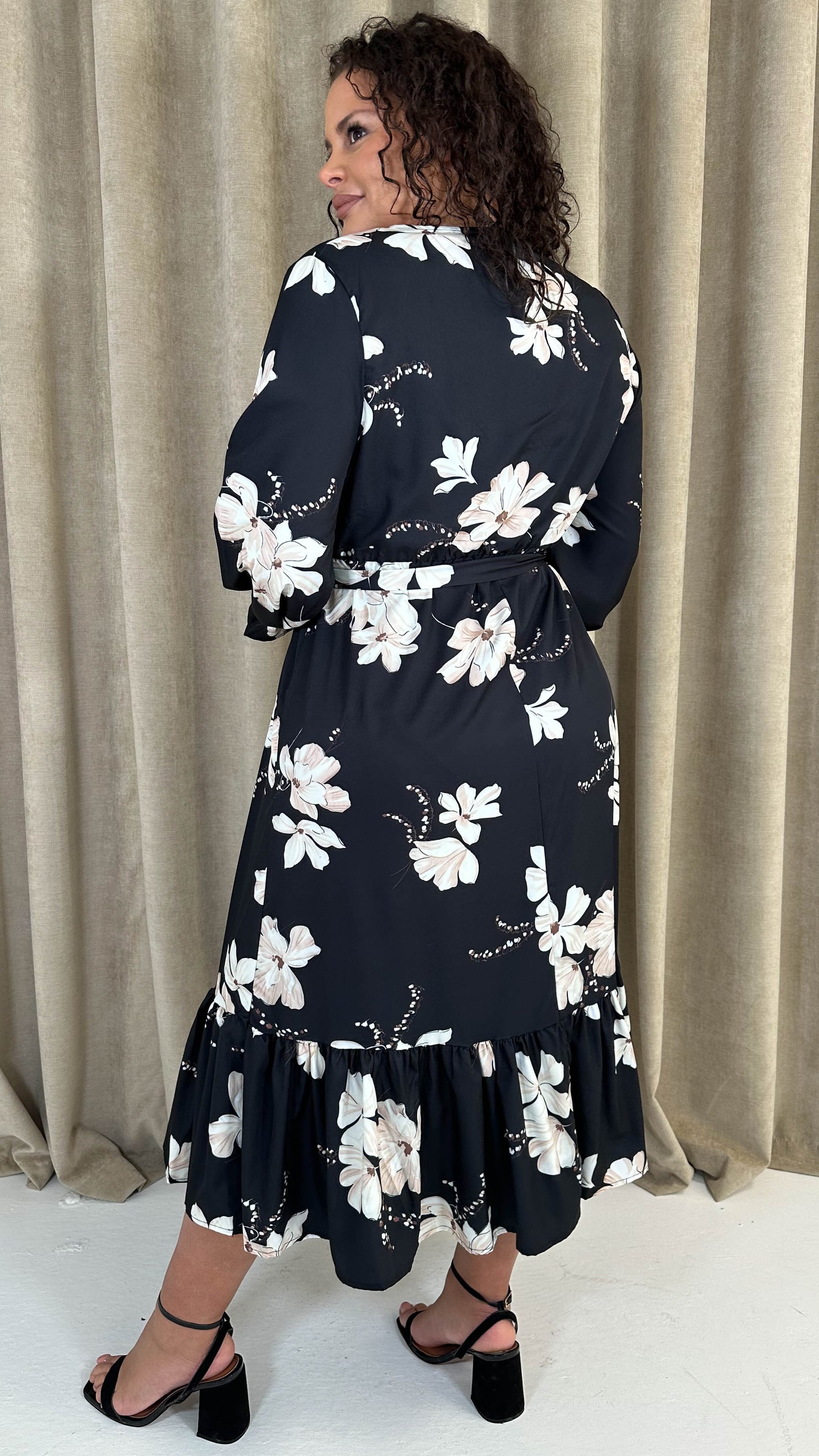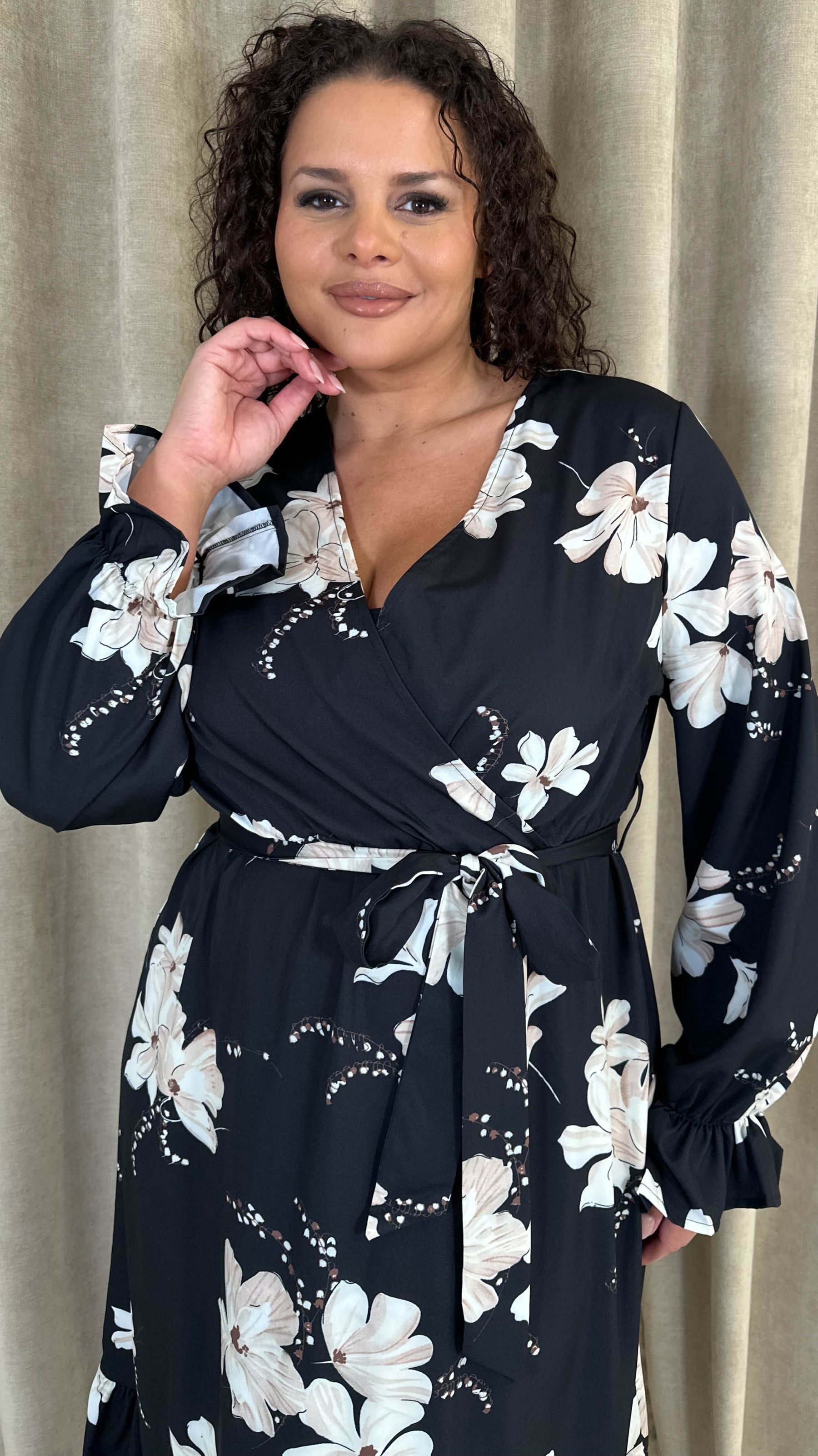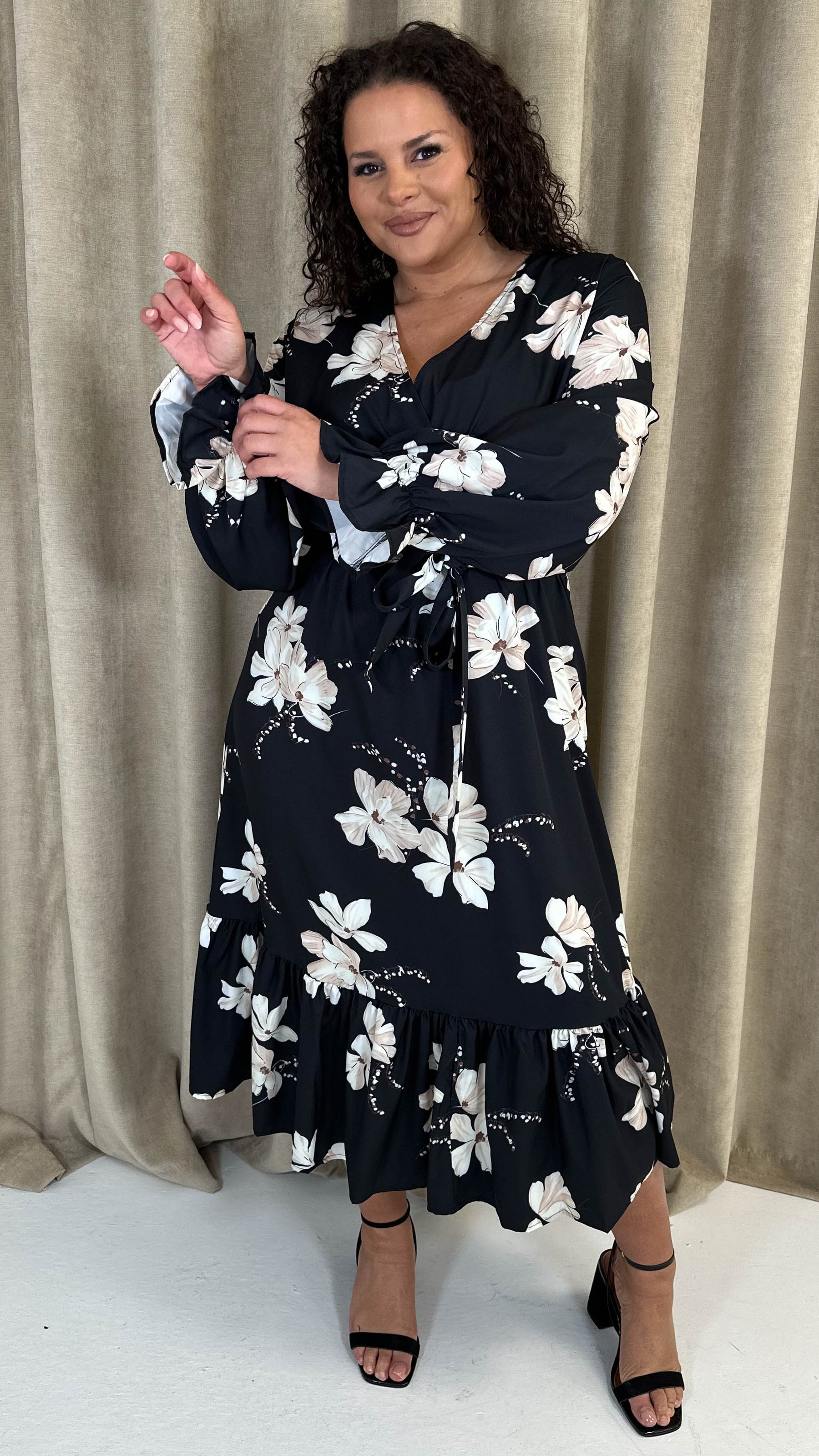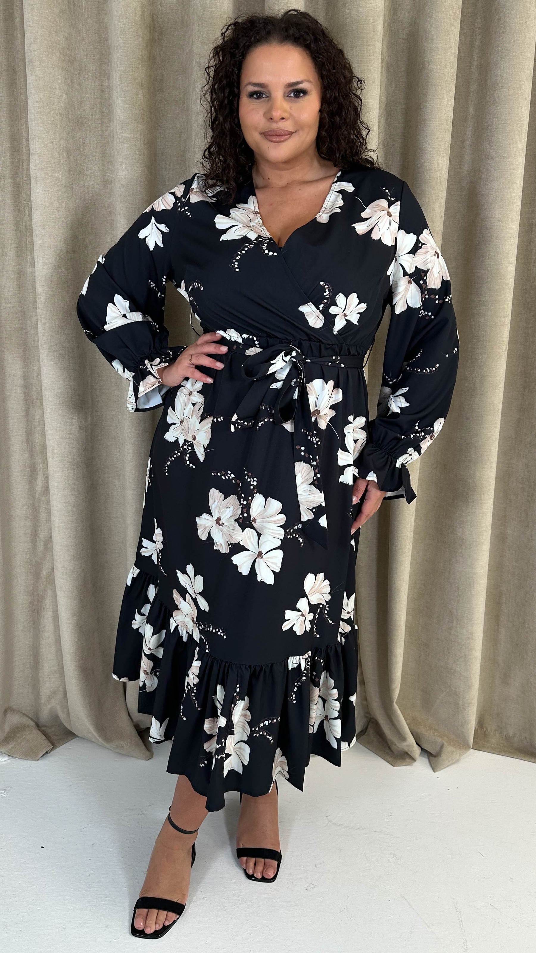CurveWow Long Sleeve Floral Wrap Midaxi Dress Black/Ivory