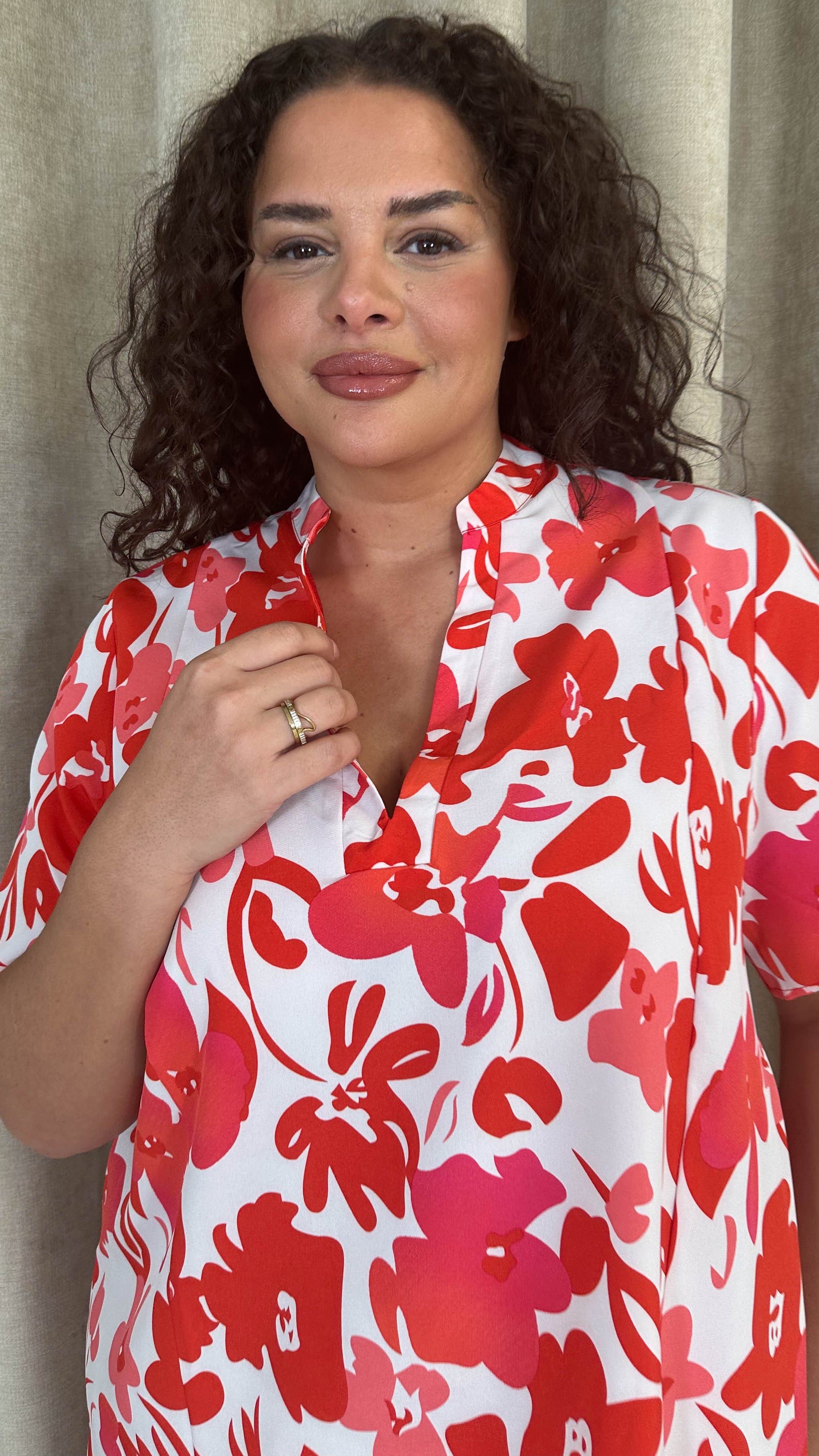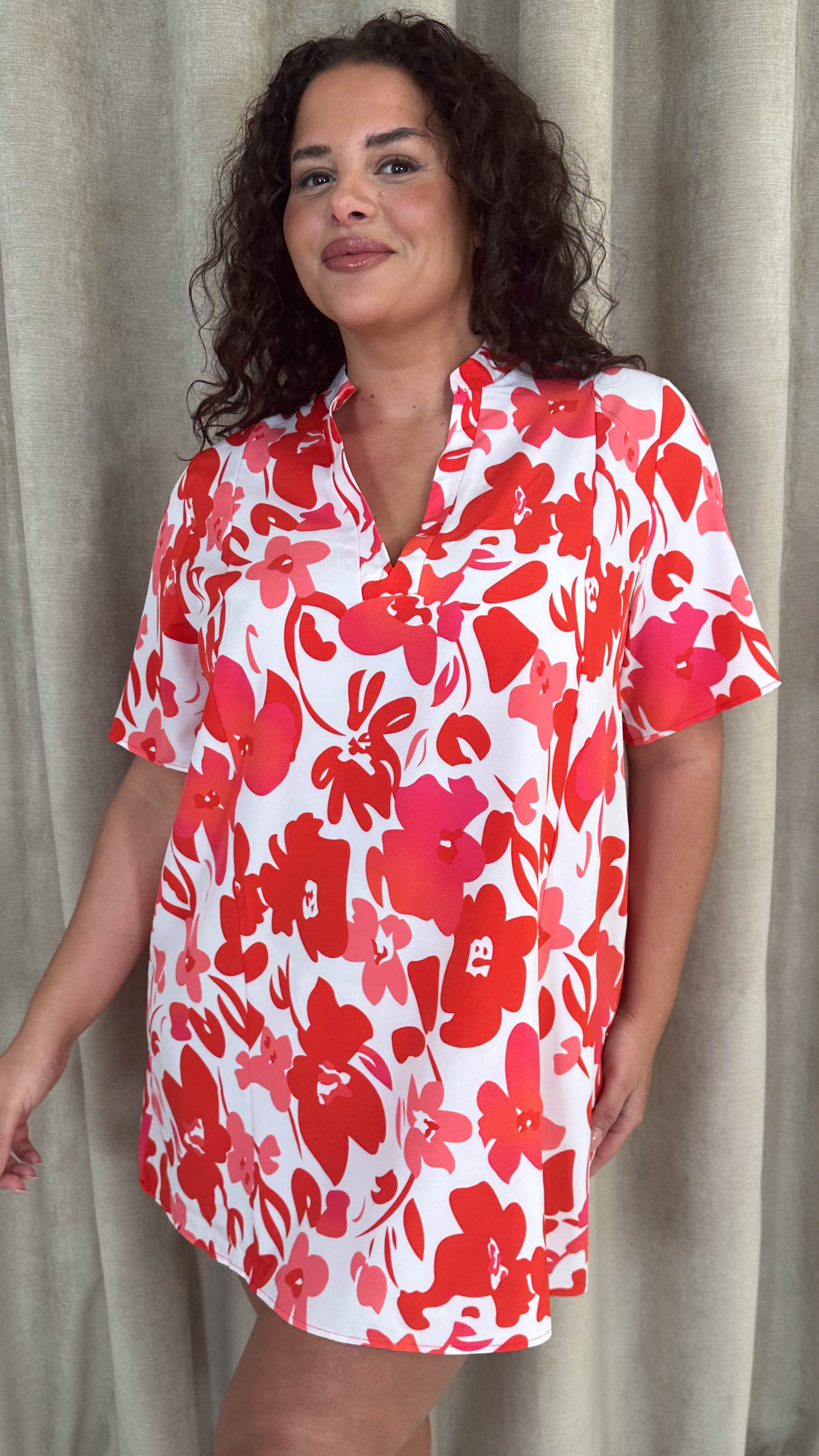 CurveWow Notch Neck Mini Shift Dress Red & Pink Floral