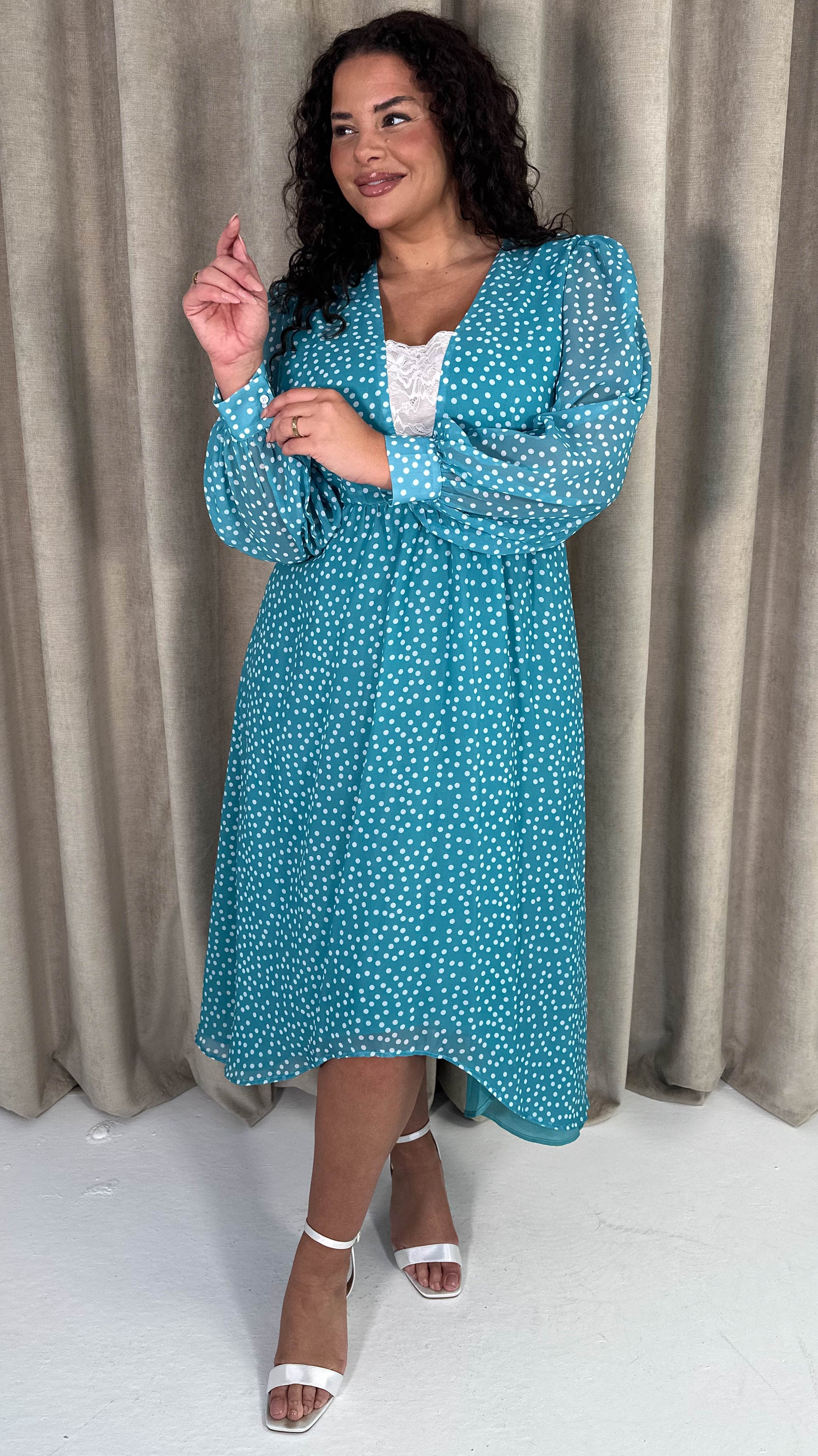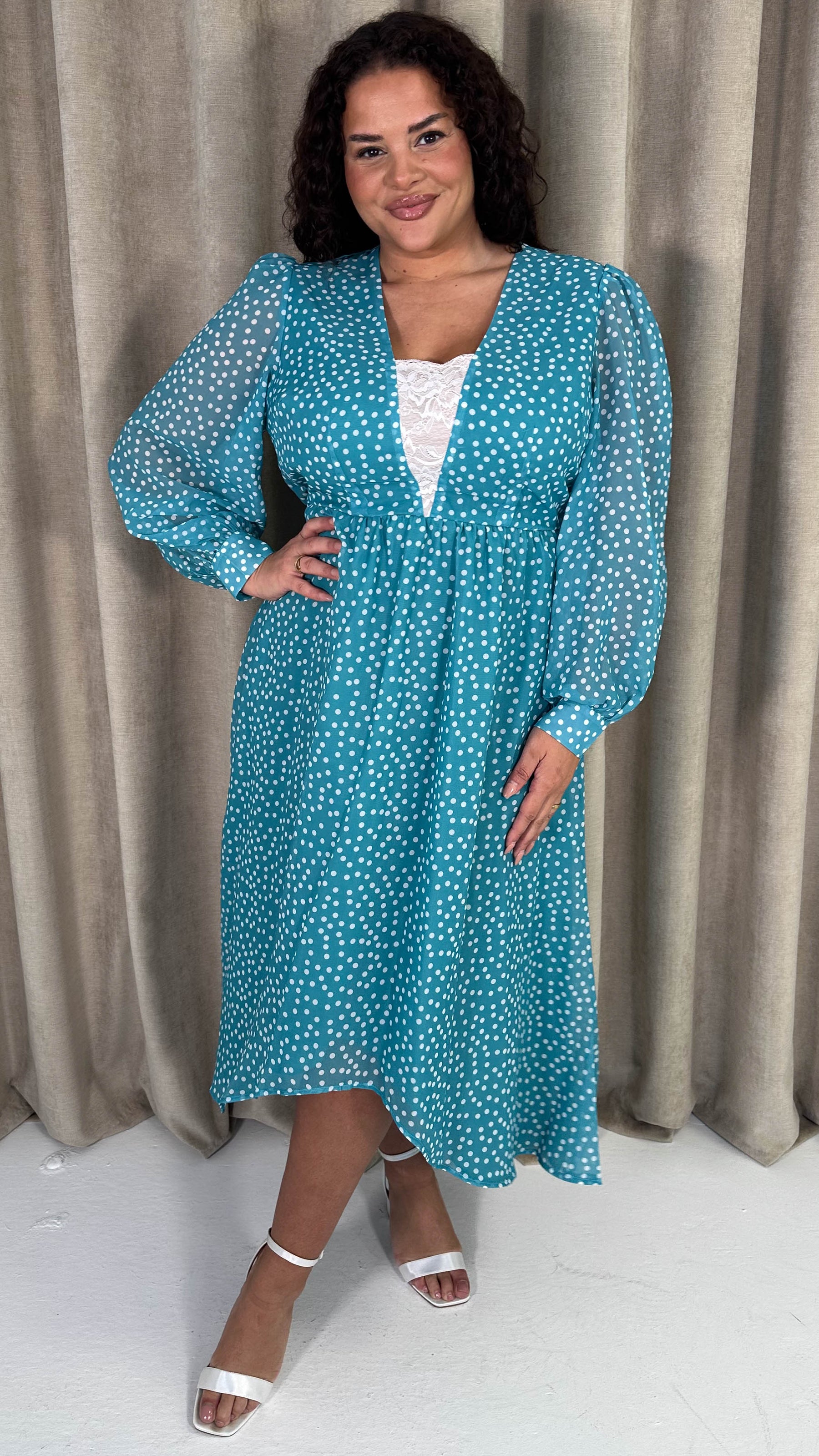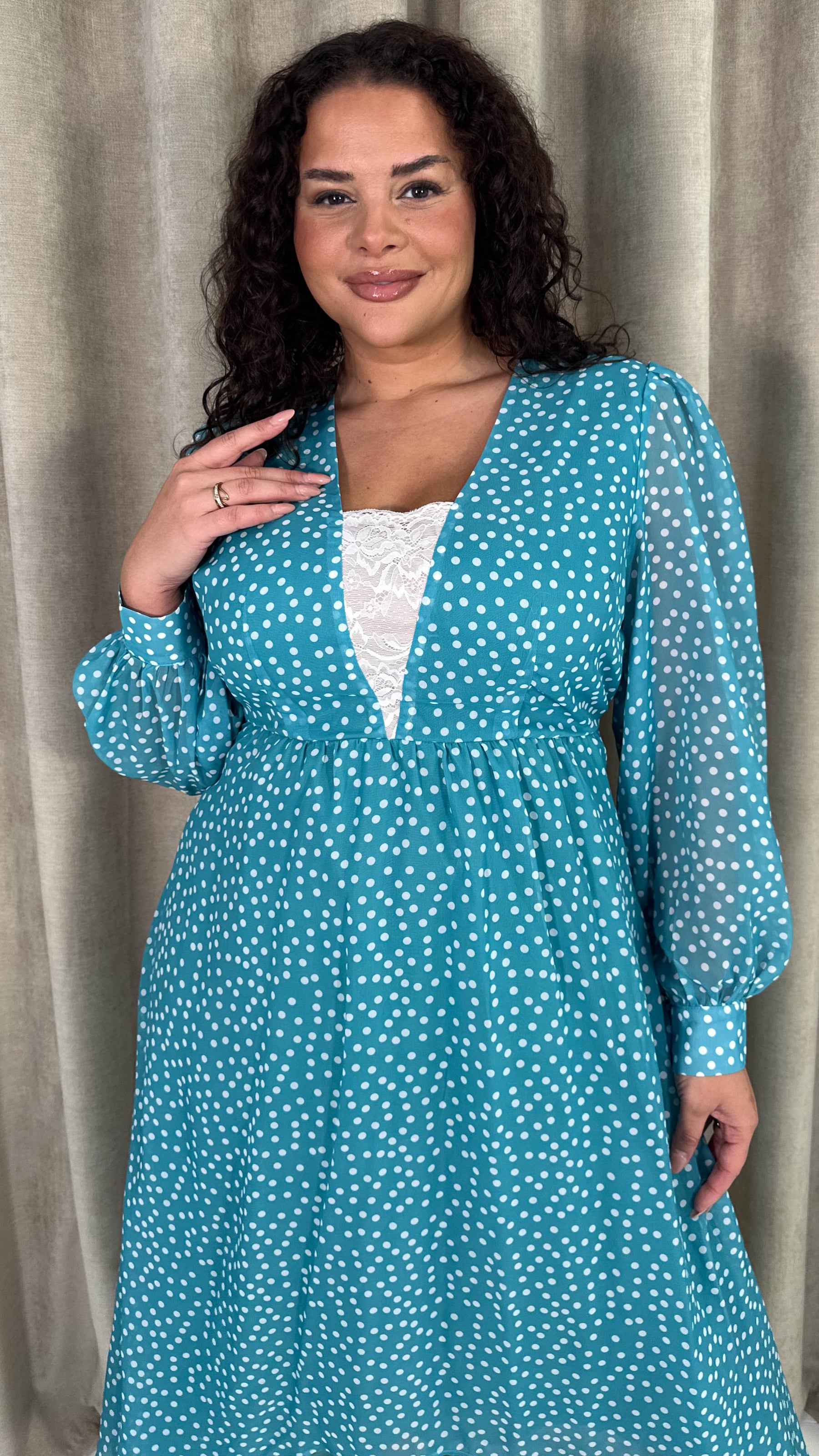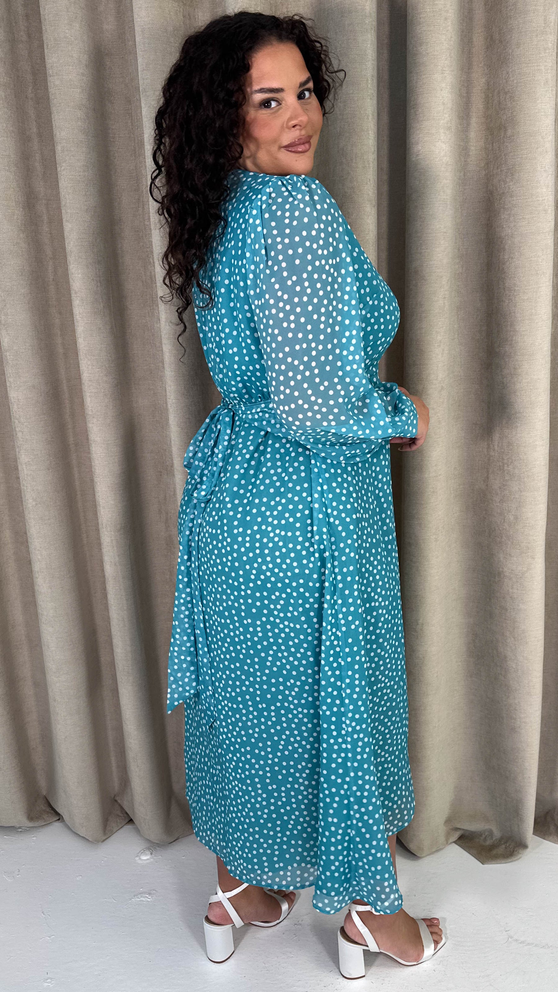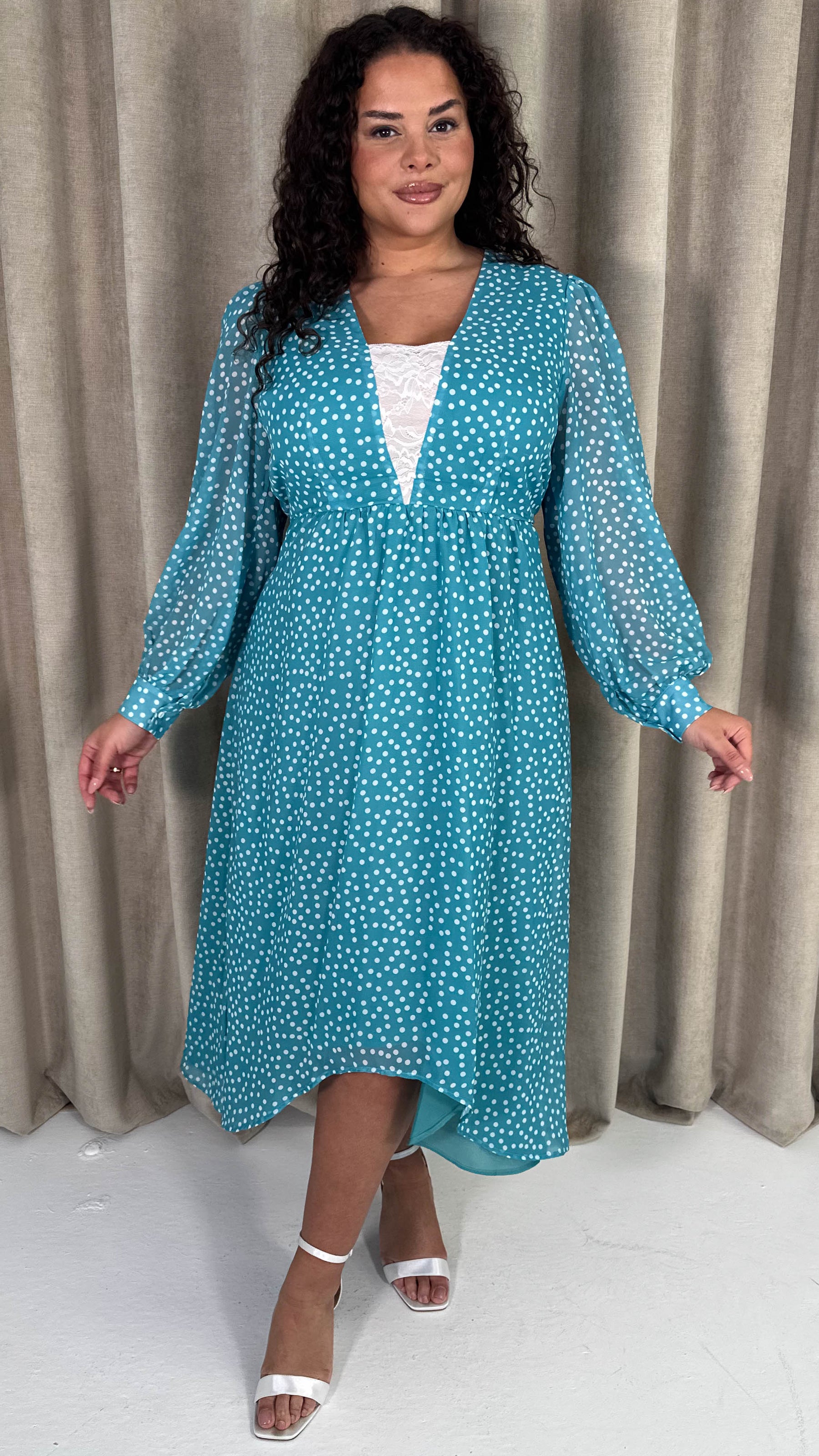 CurveWow Plunge Front Maxi Dress Blue Polka Dot