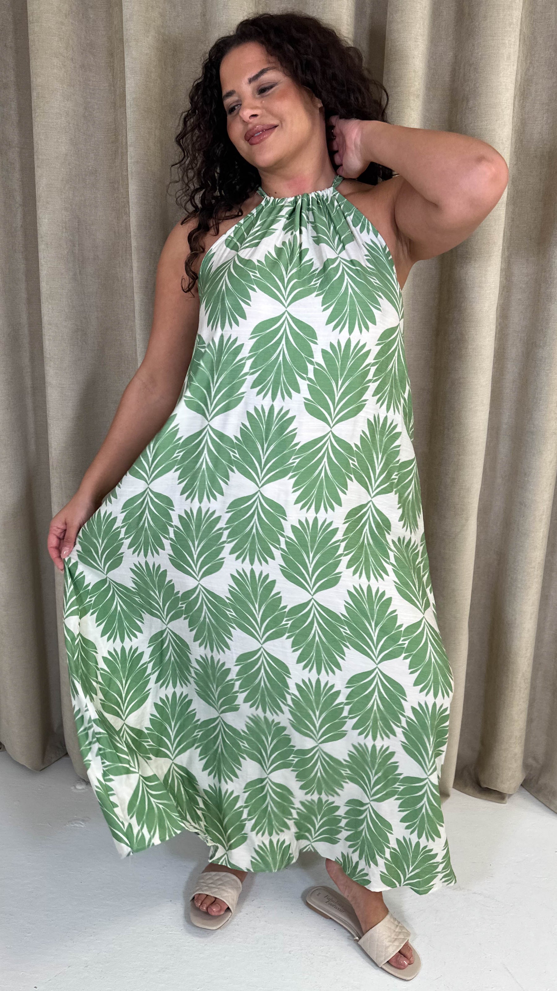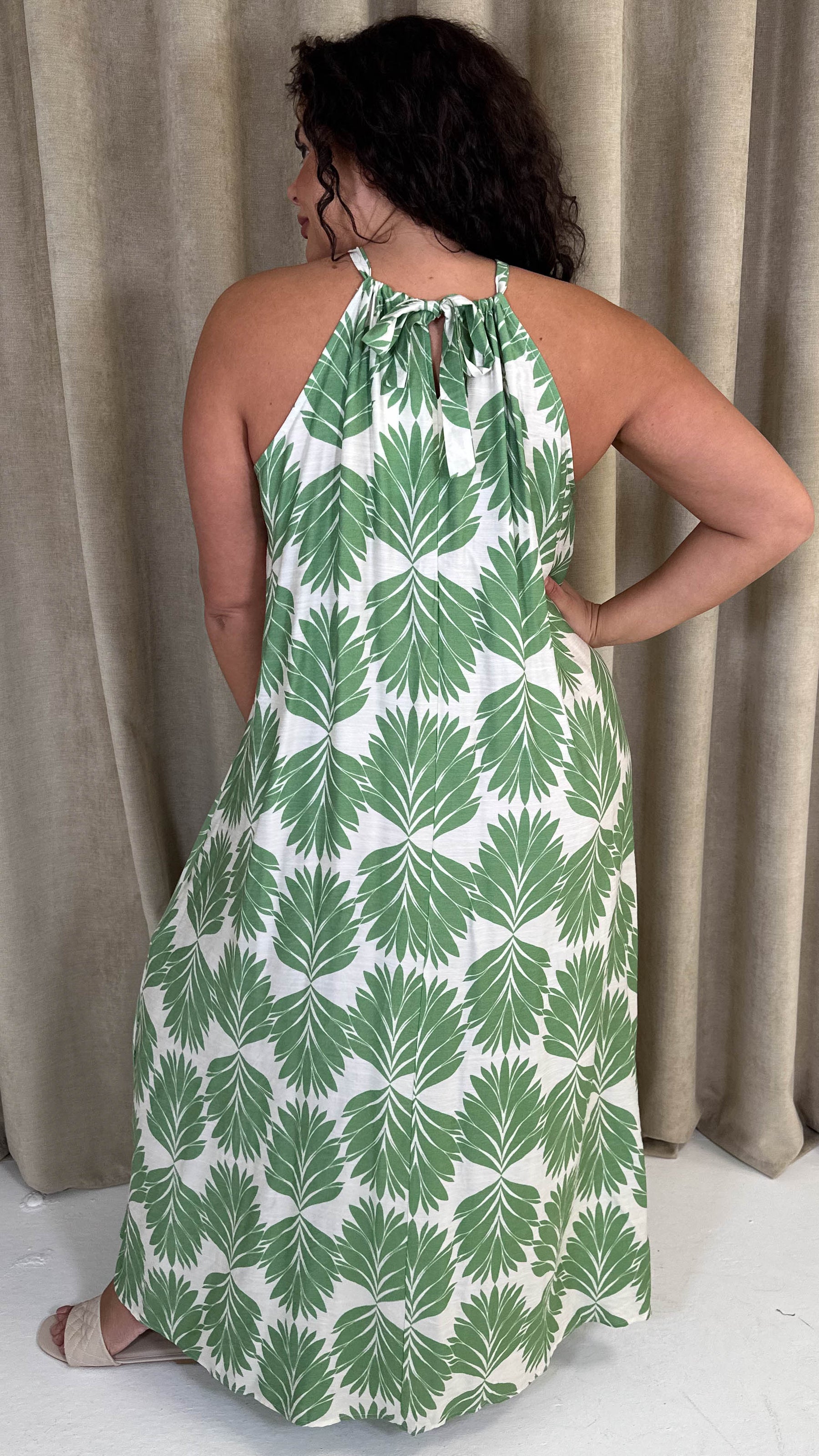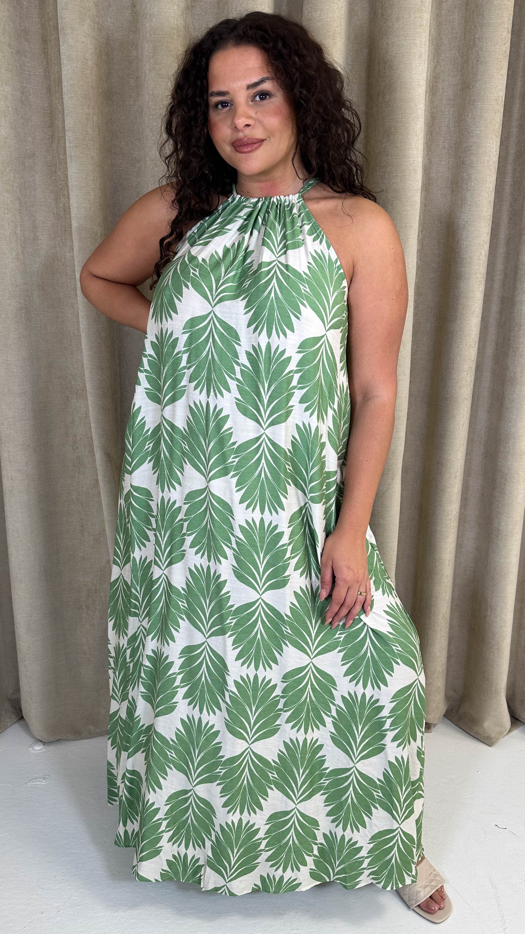 CurveWow Racer Swing Maxi Dress Green Leaf