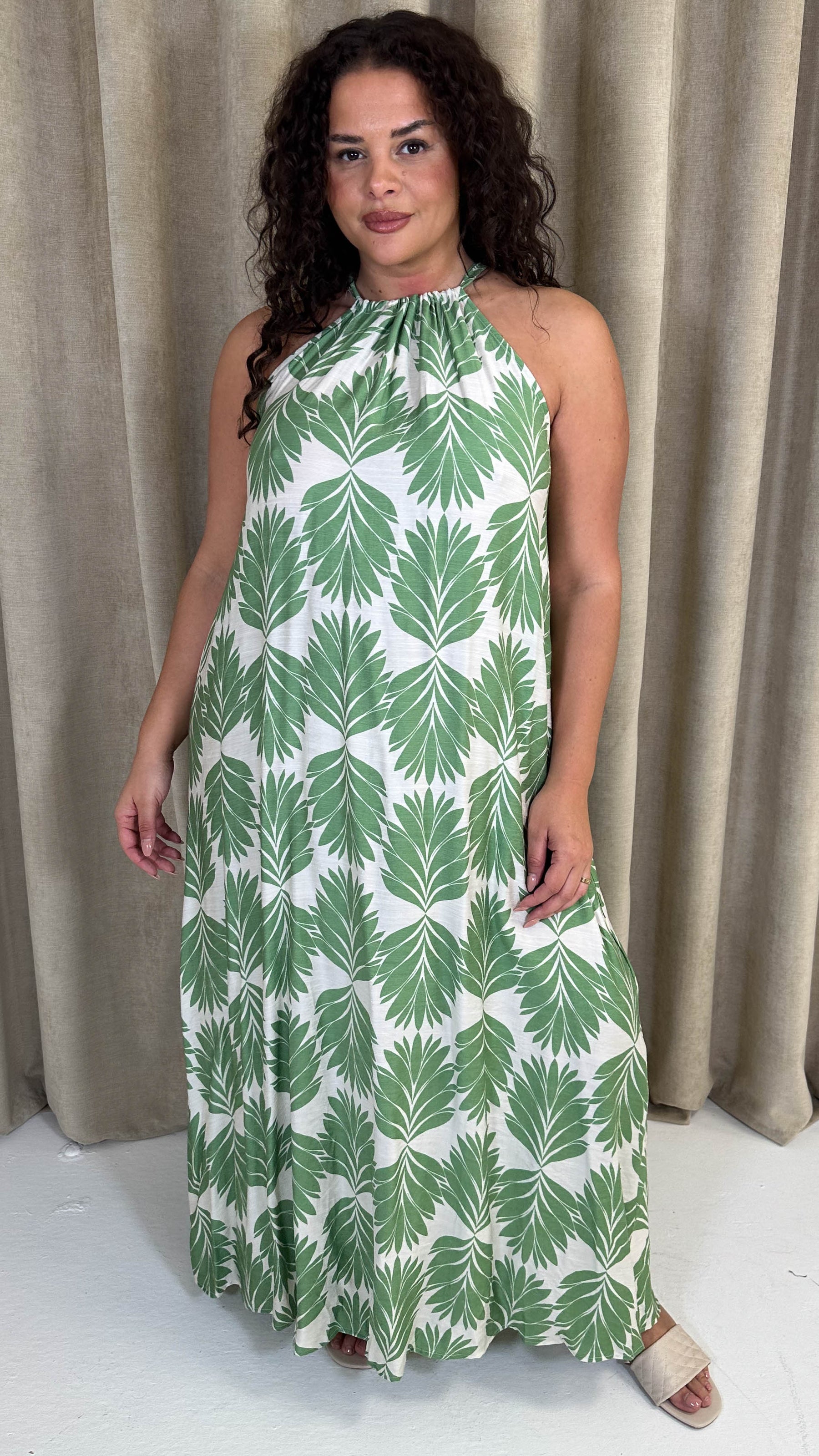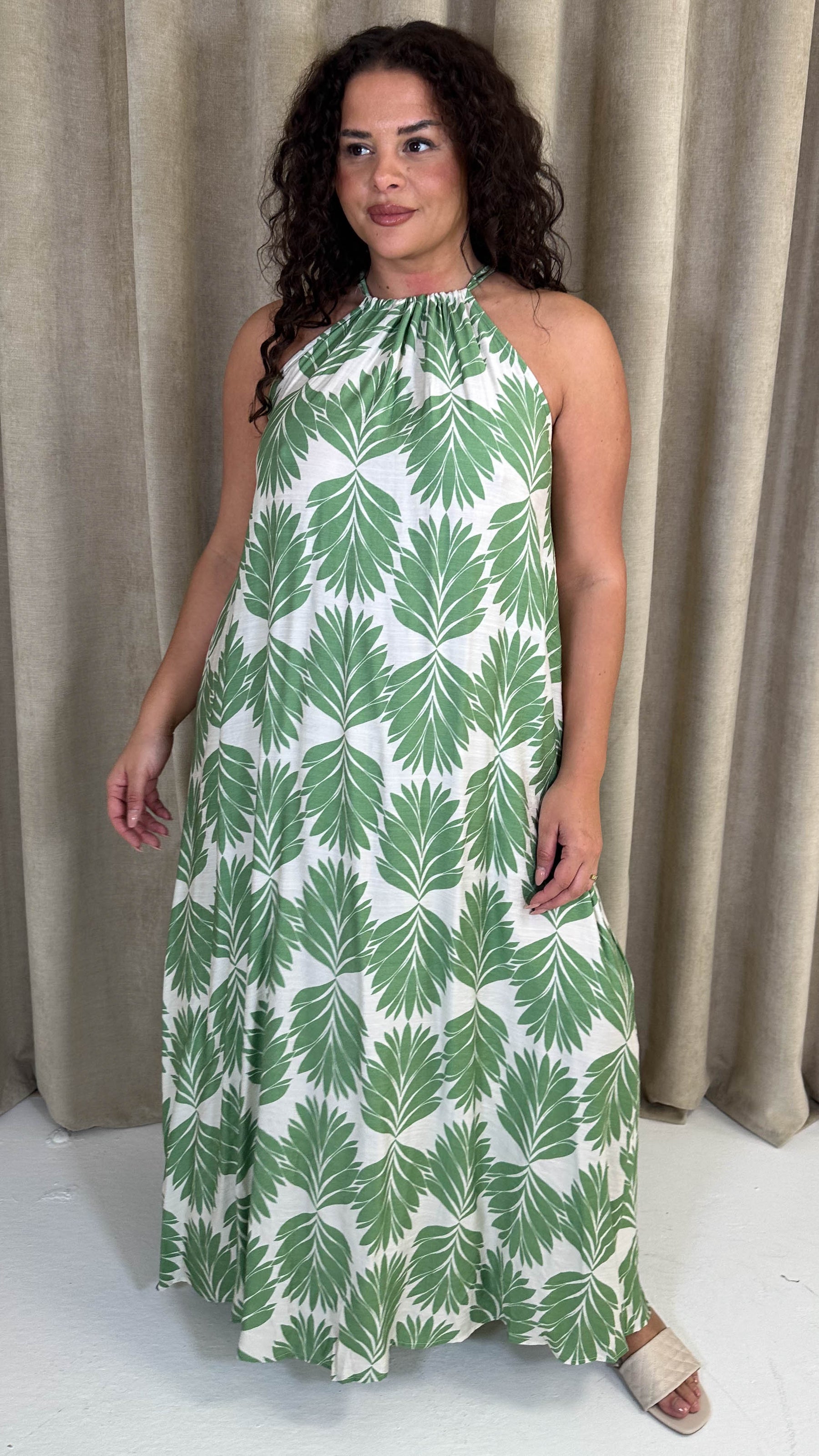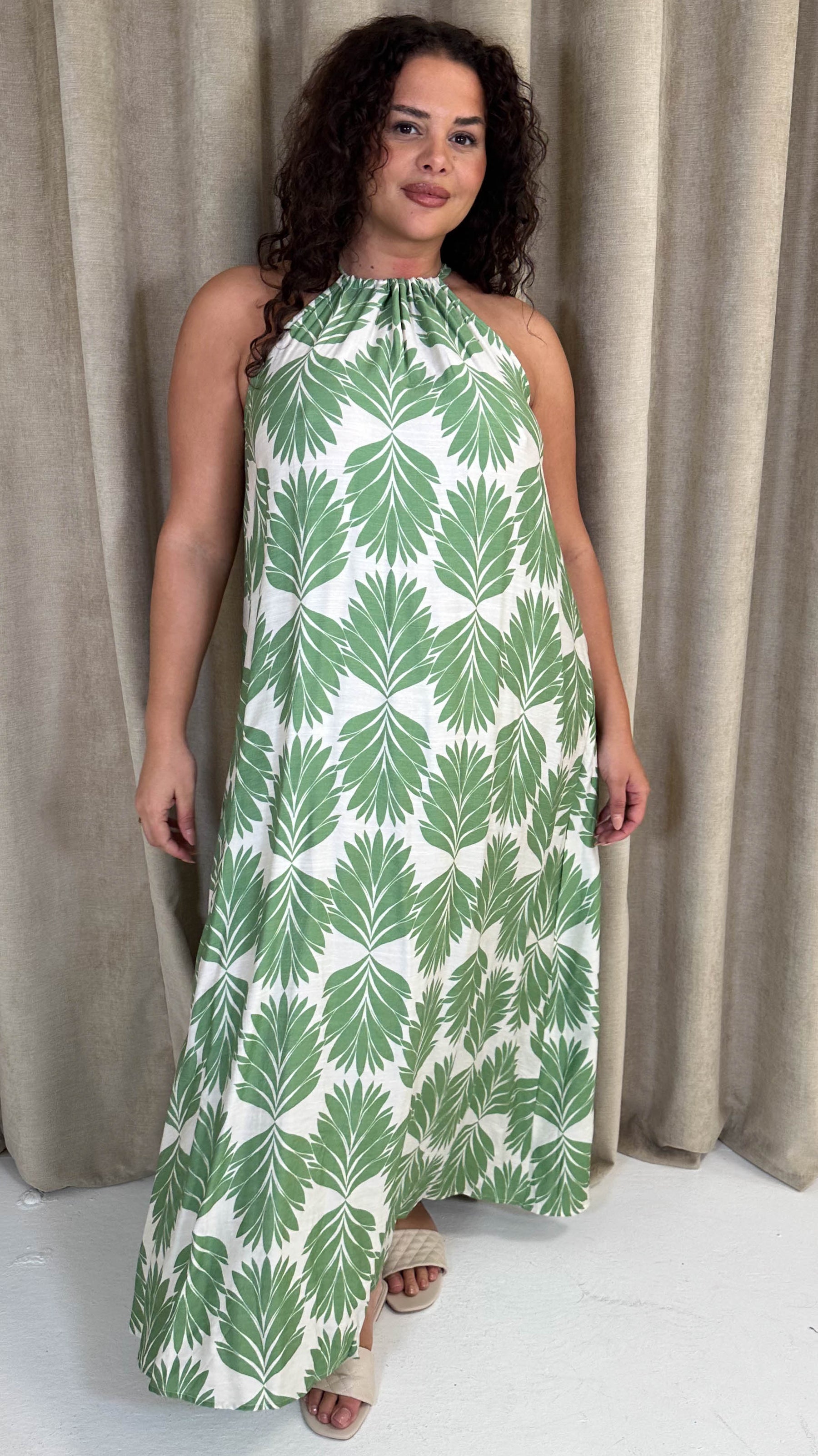 CurveWow Racer Swing Maxi Dress Green Leaf