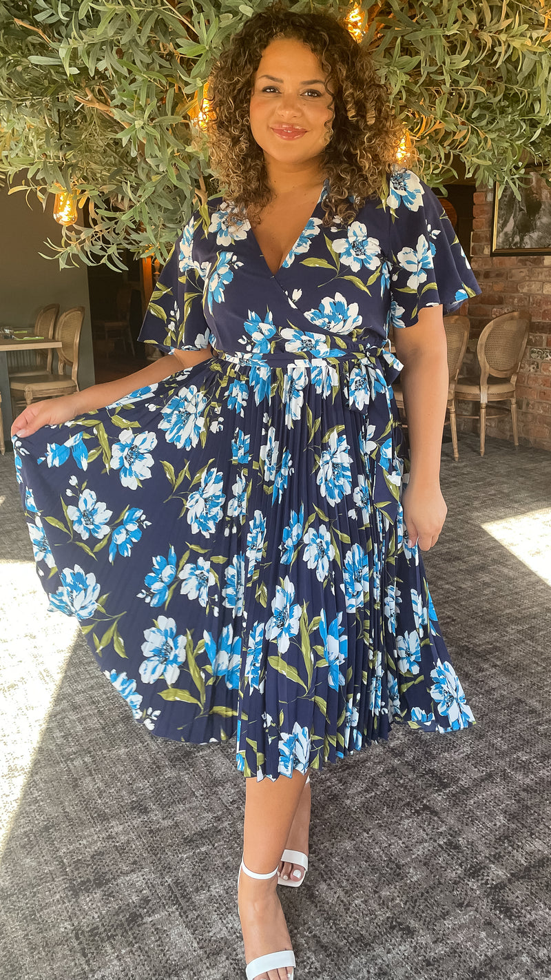 CurveWow Short Sleeve Pleated Wrap Dress Navy Floral