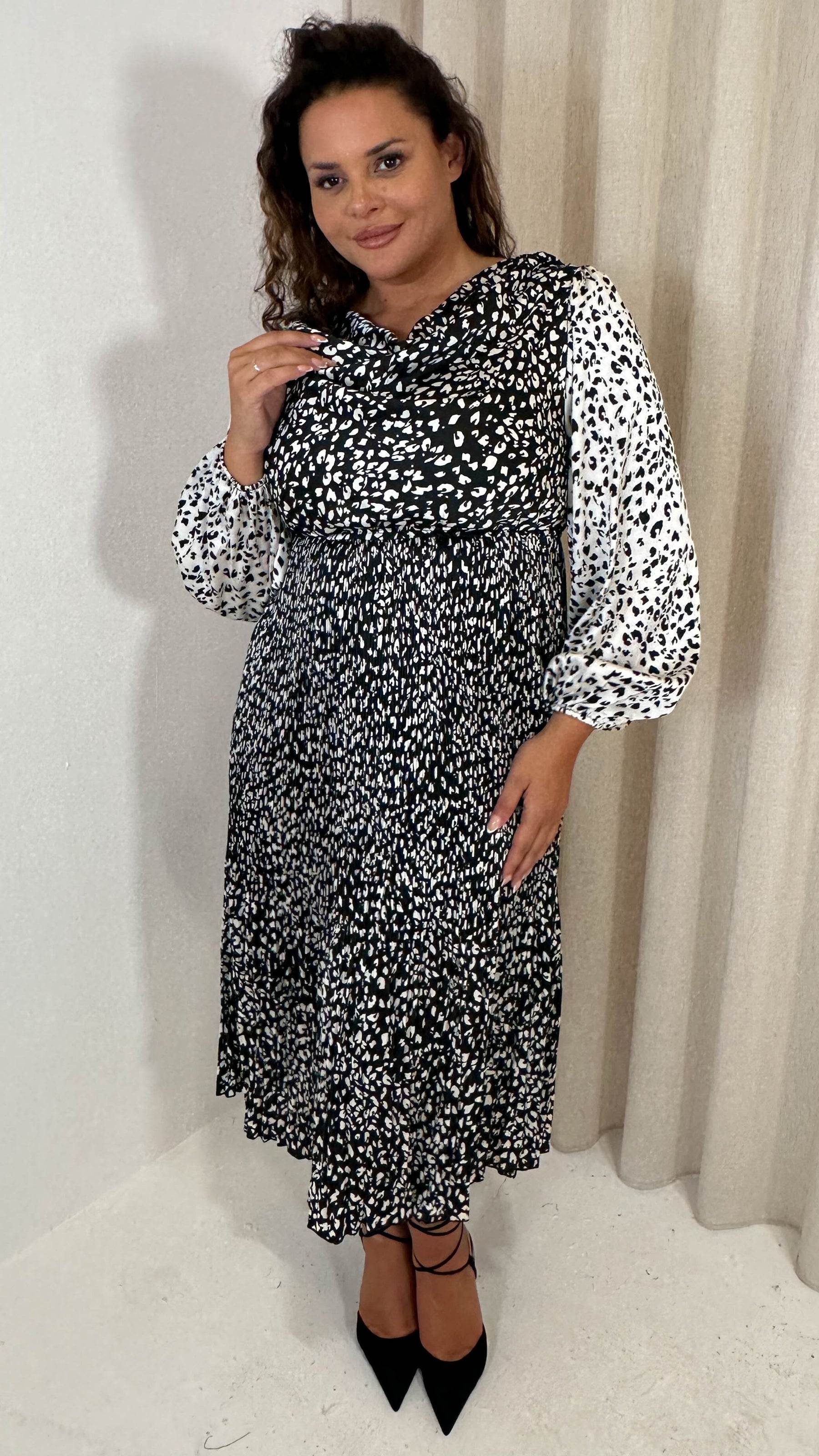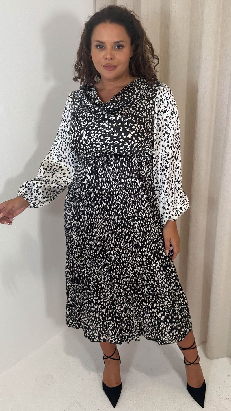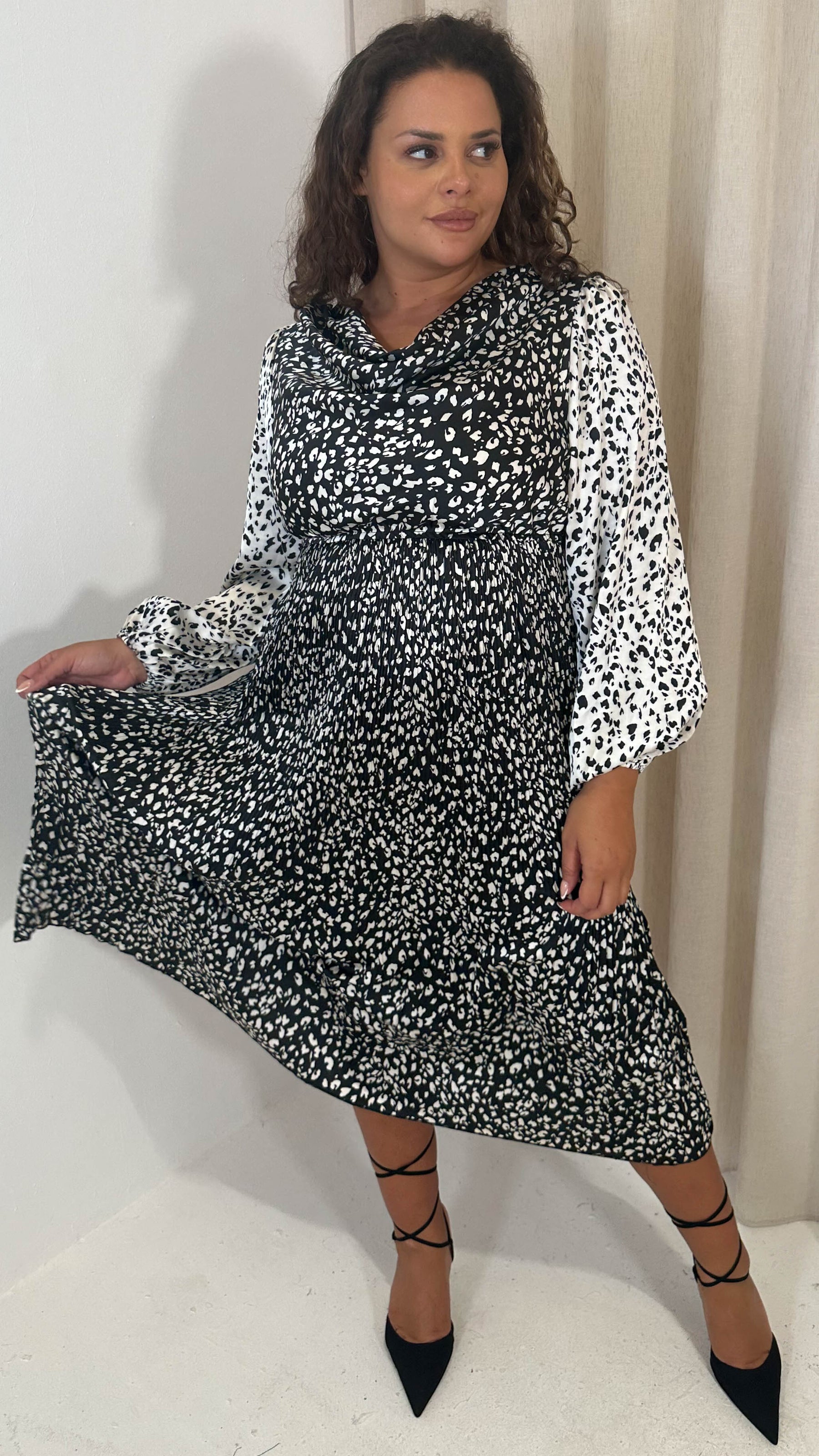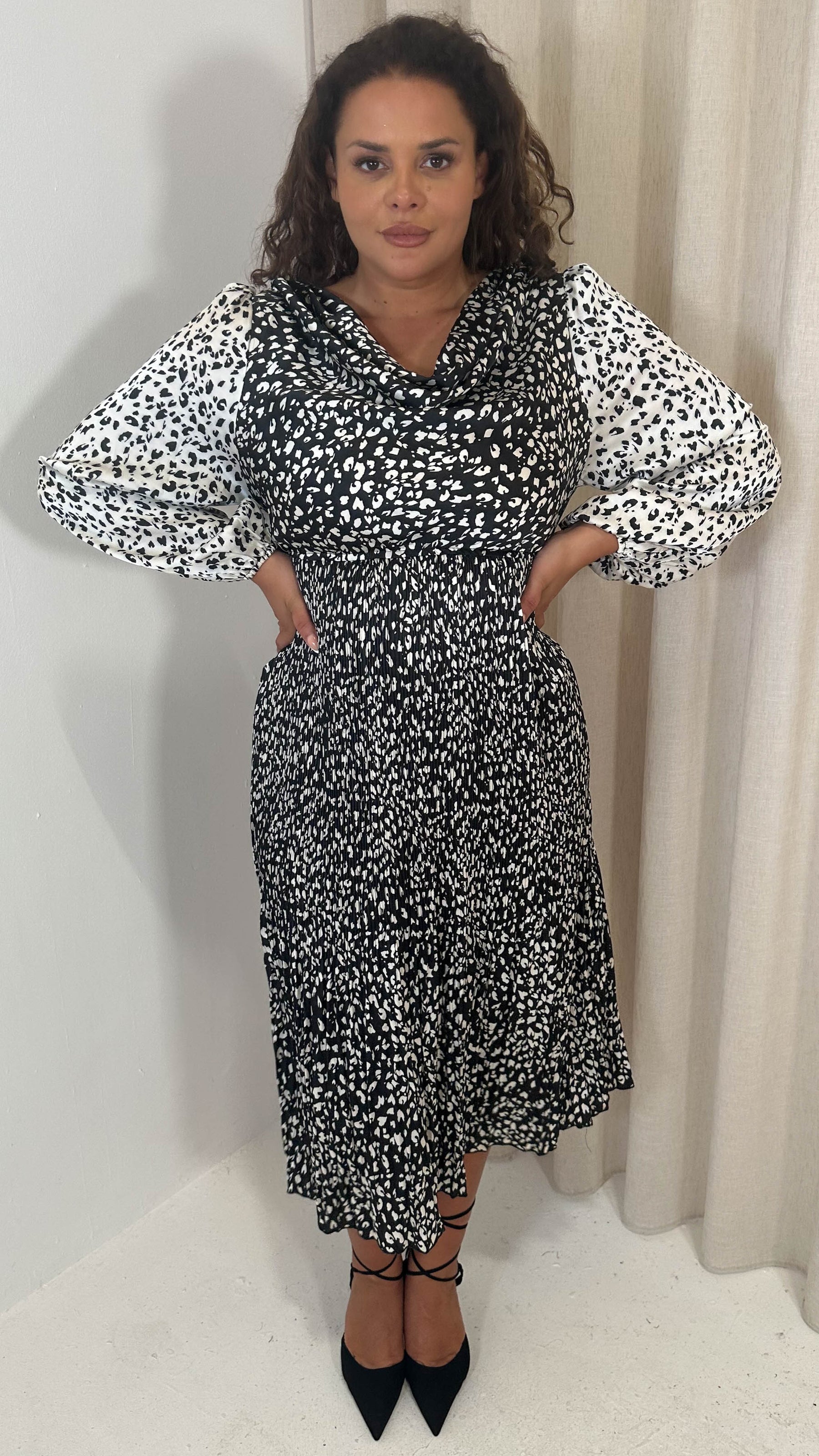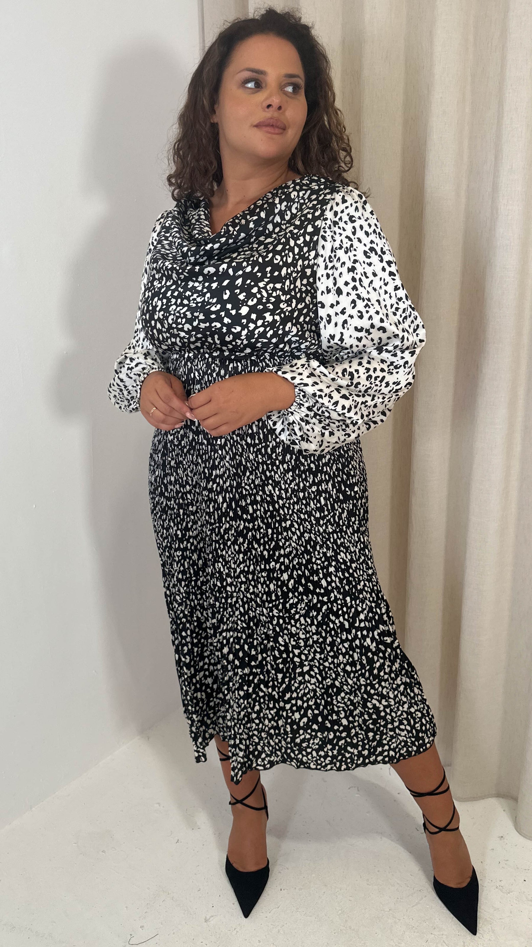 CurveWow Spliced Cowl Neck Pleated Midi Dress Mono Animal