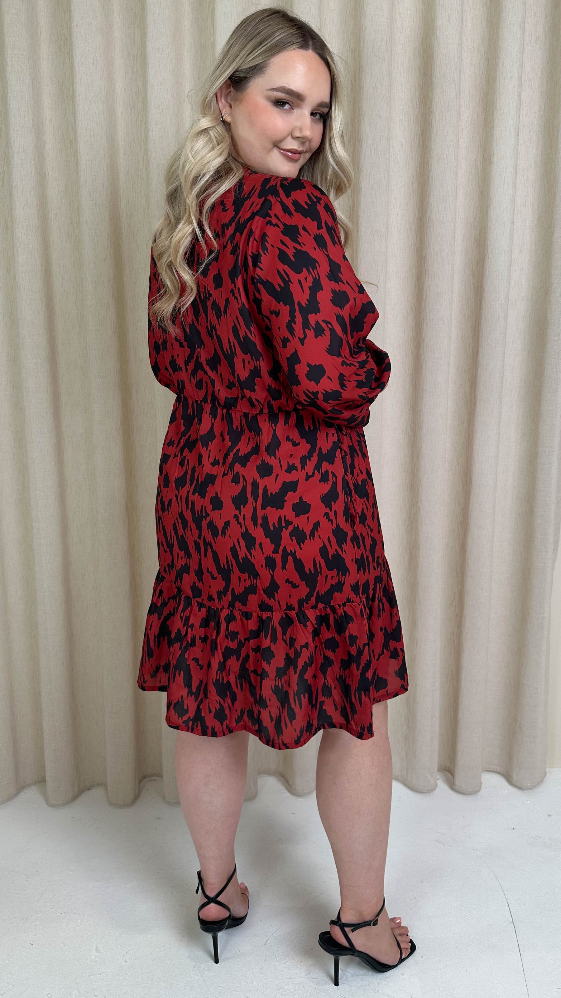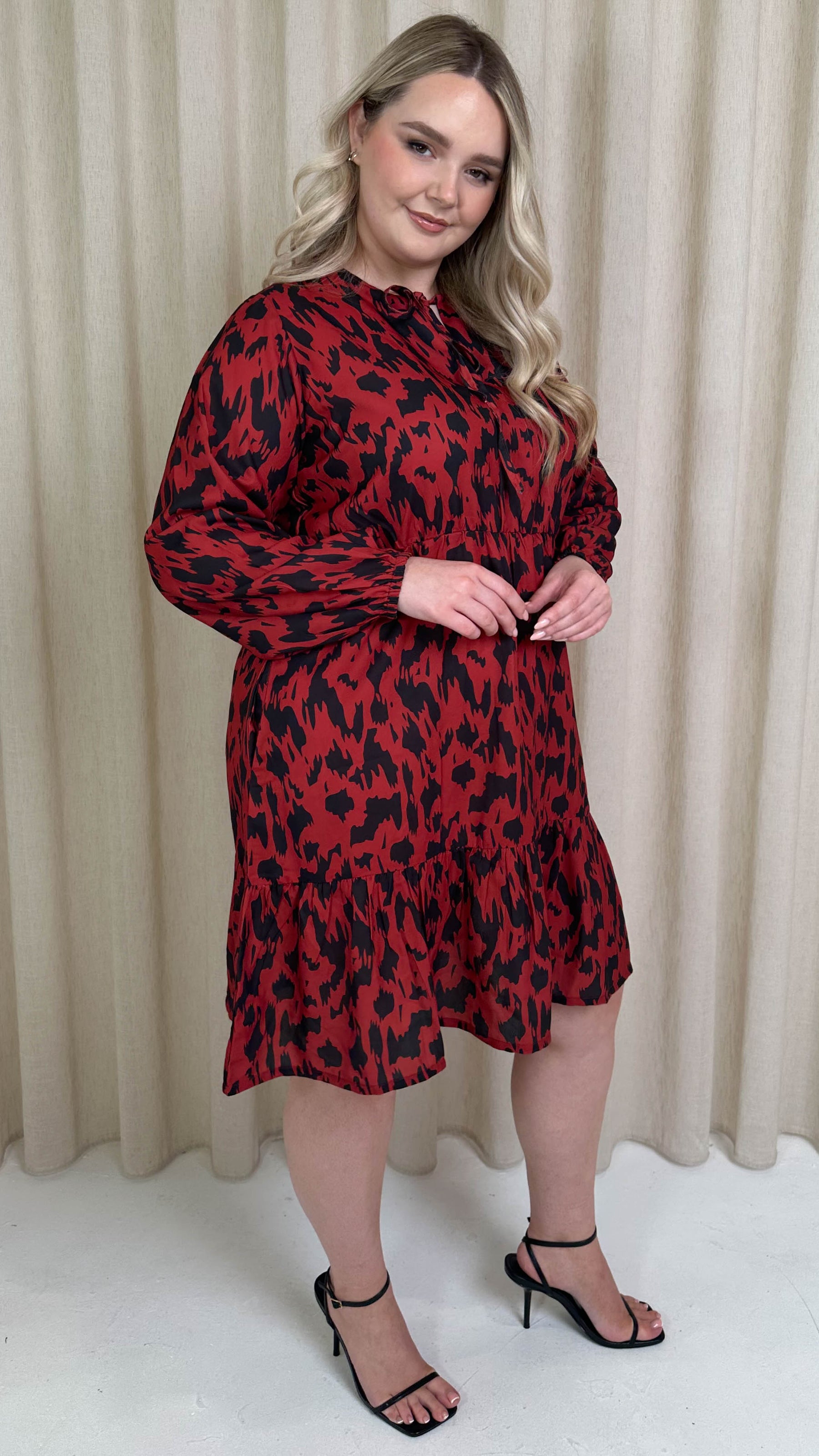 CurveWow Tie Neck Tiered Mini Dress Red Animal