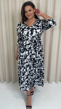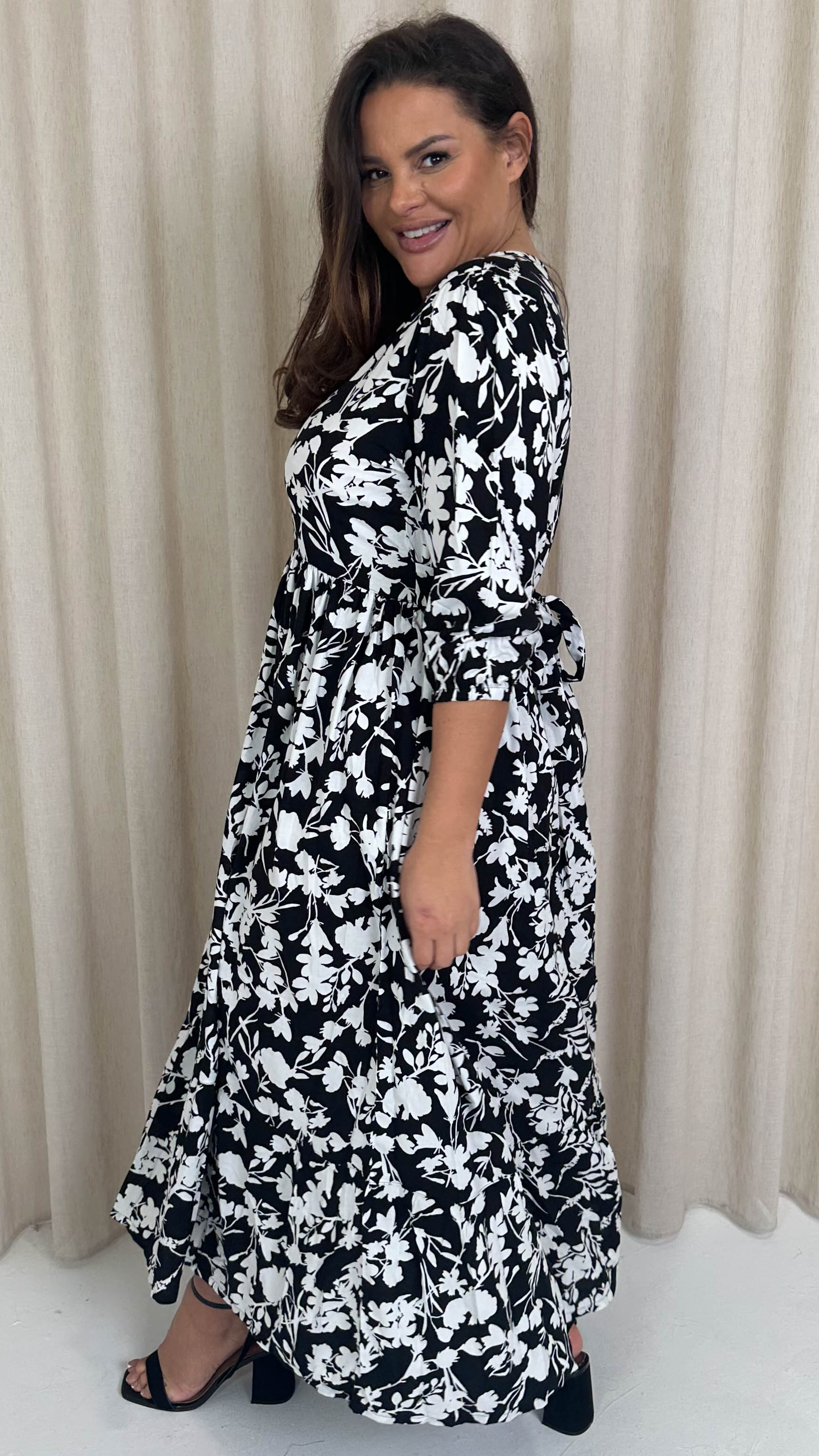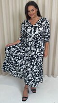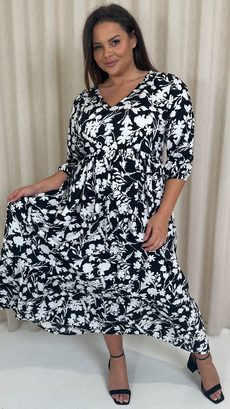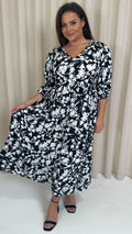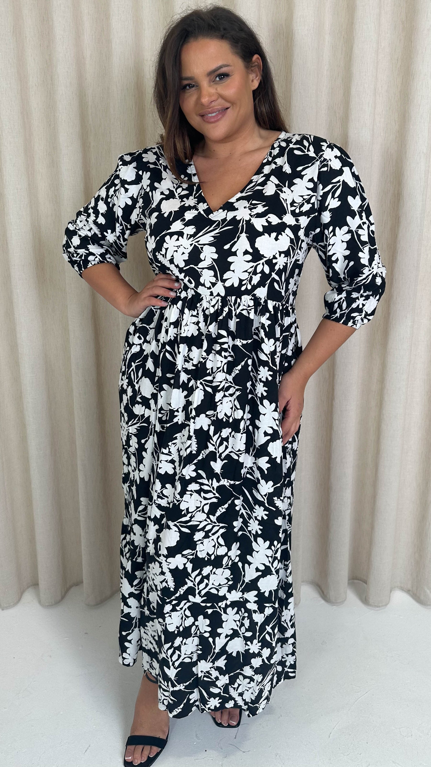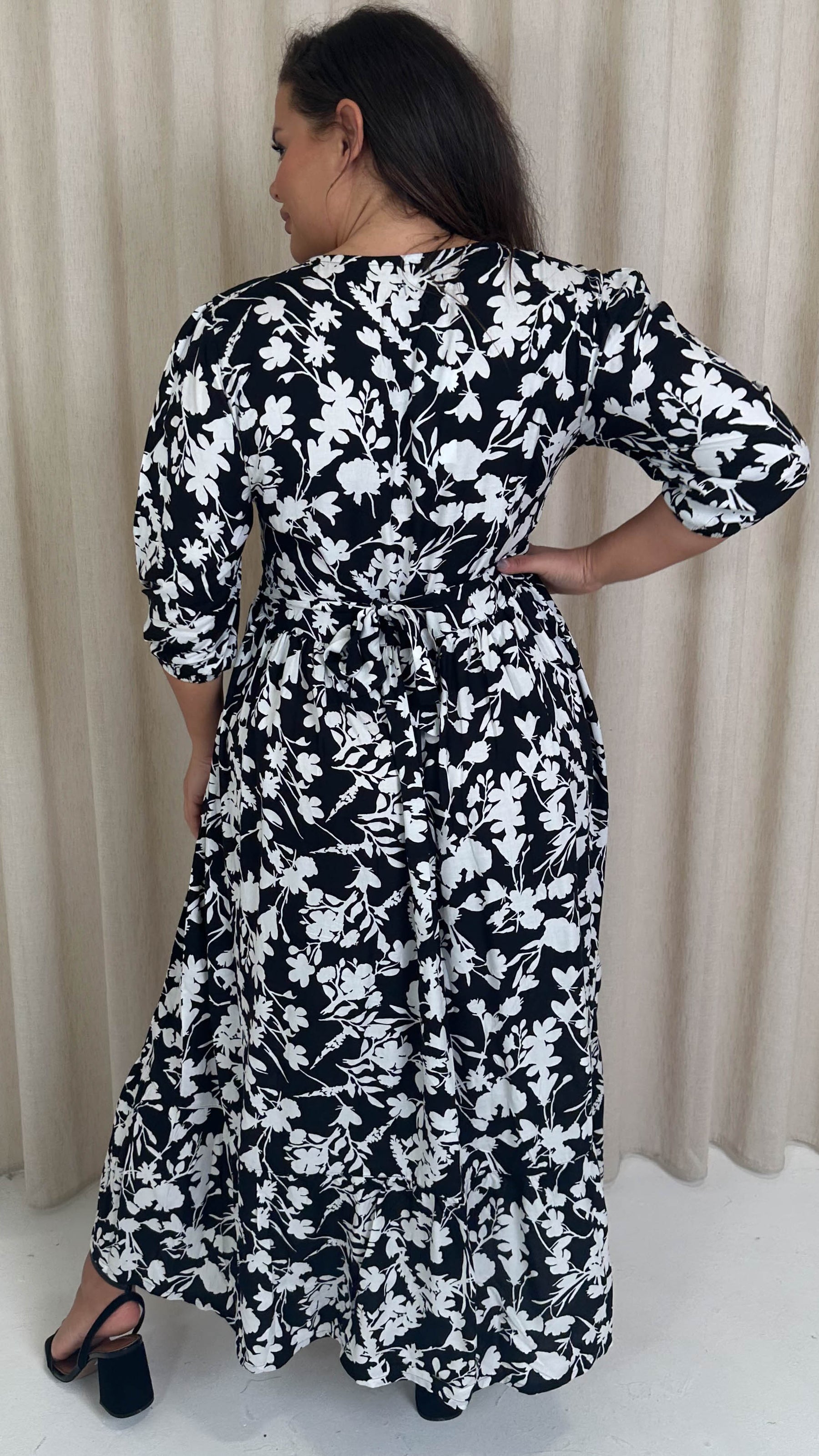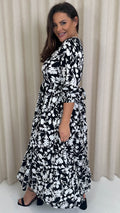 CurveWow Tiered Vneck Balloon Sleeve Maxi Dress Black Floral