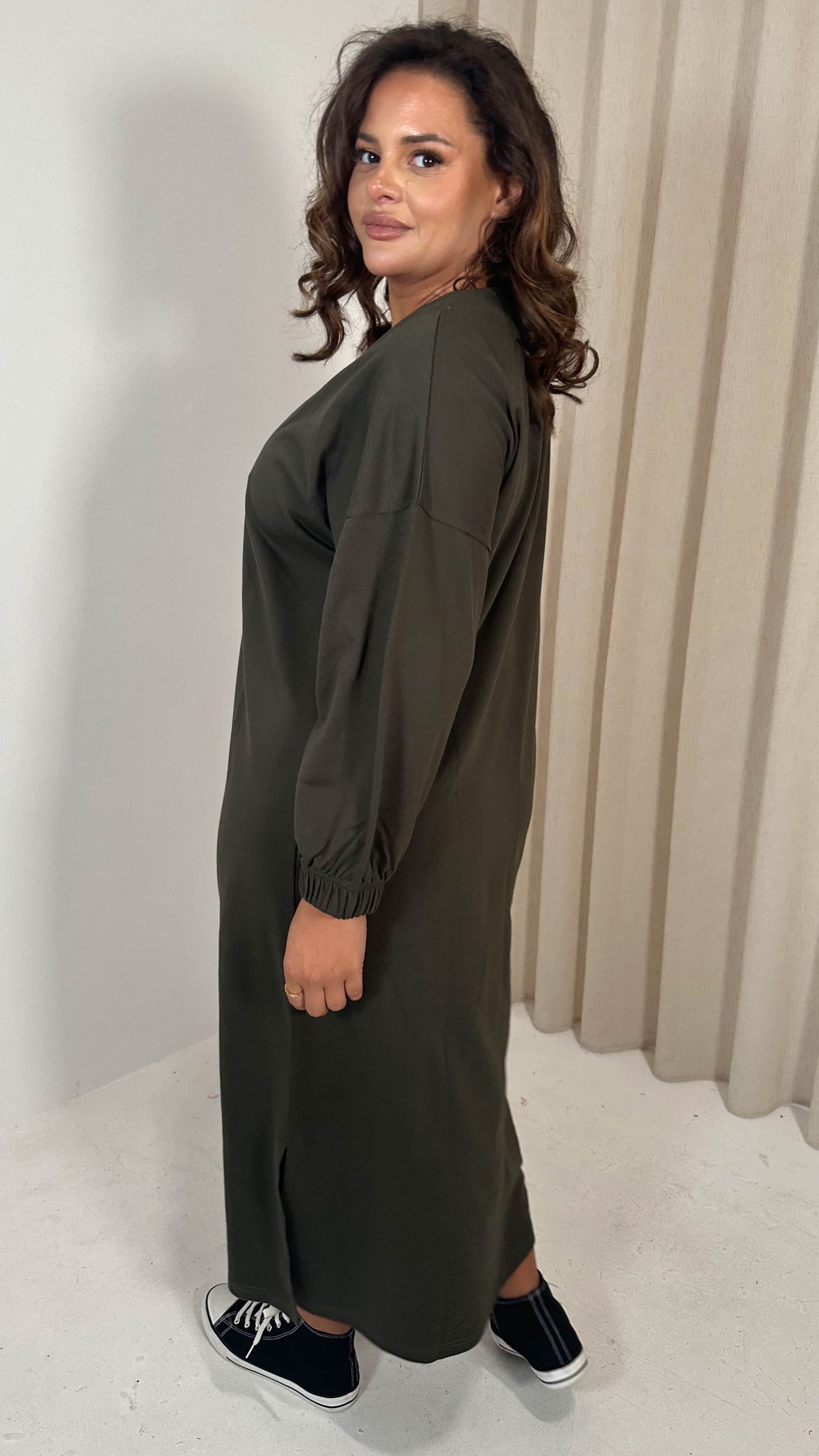 CurveWow V Neck Sweat Maxi Dress Khaki