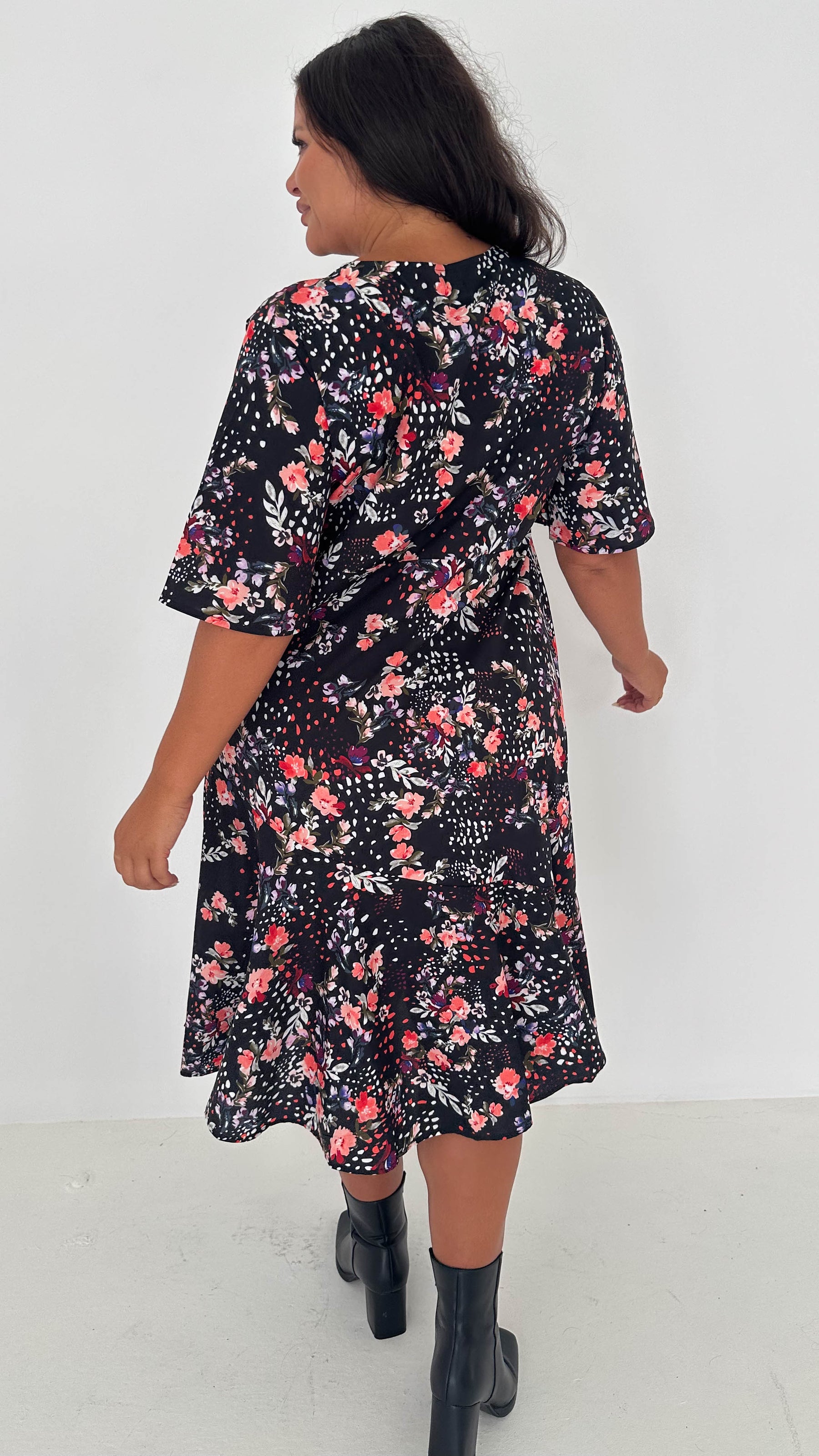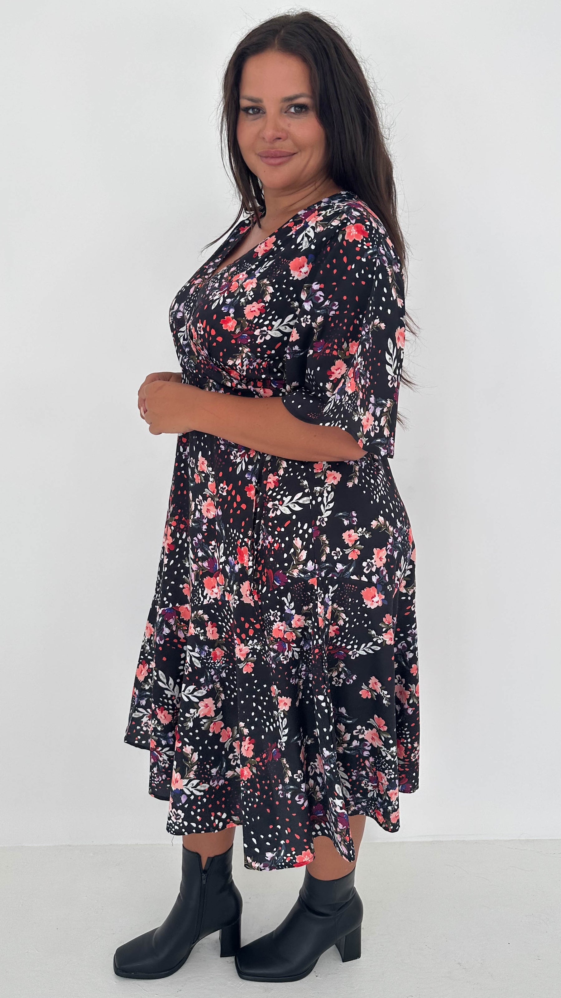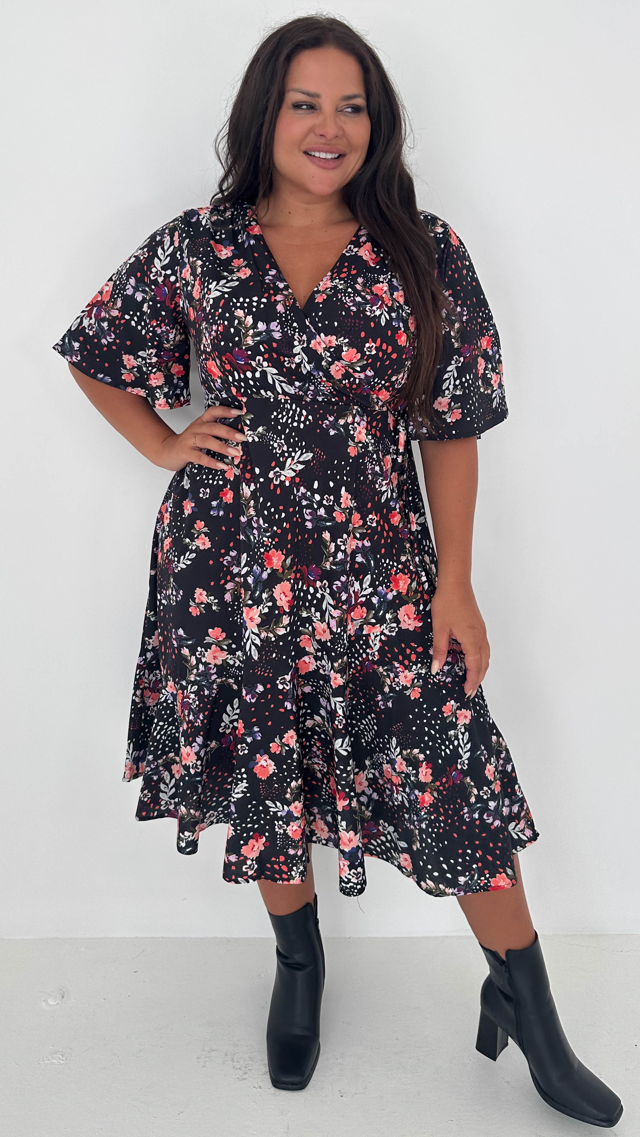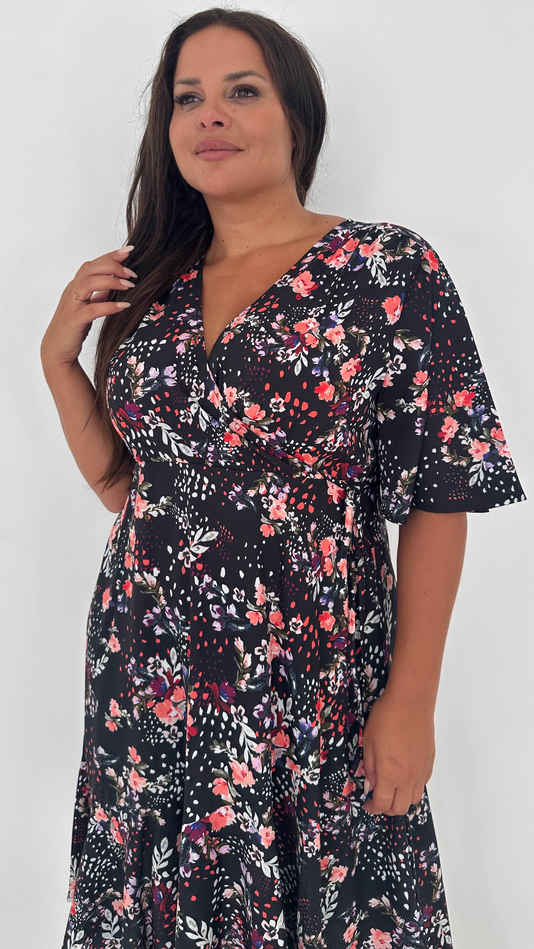 CurveWow Wrap Angel Sleeve Trapeze Midi Dress Floral Spot