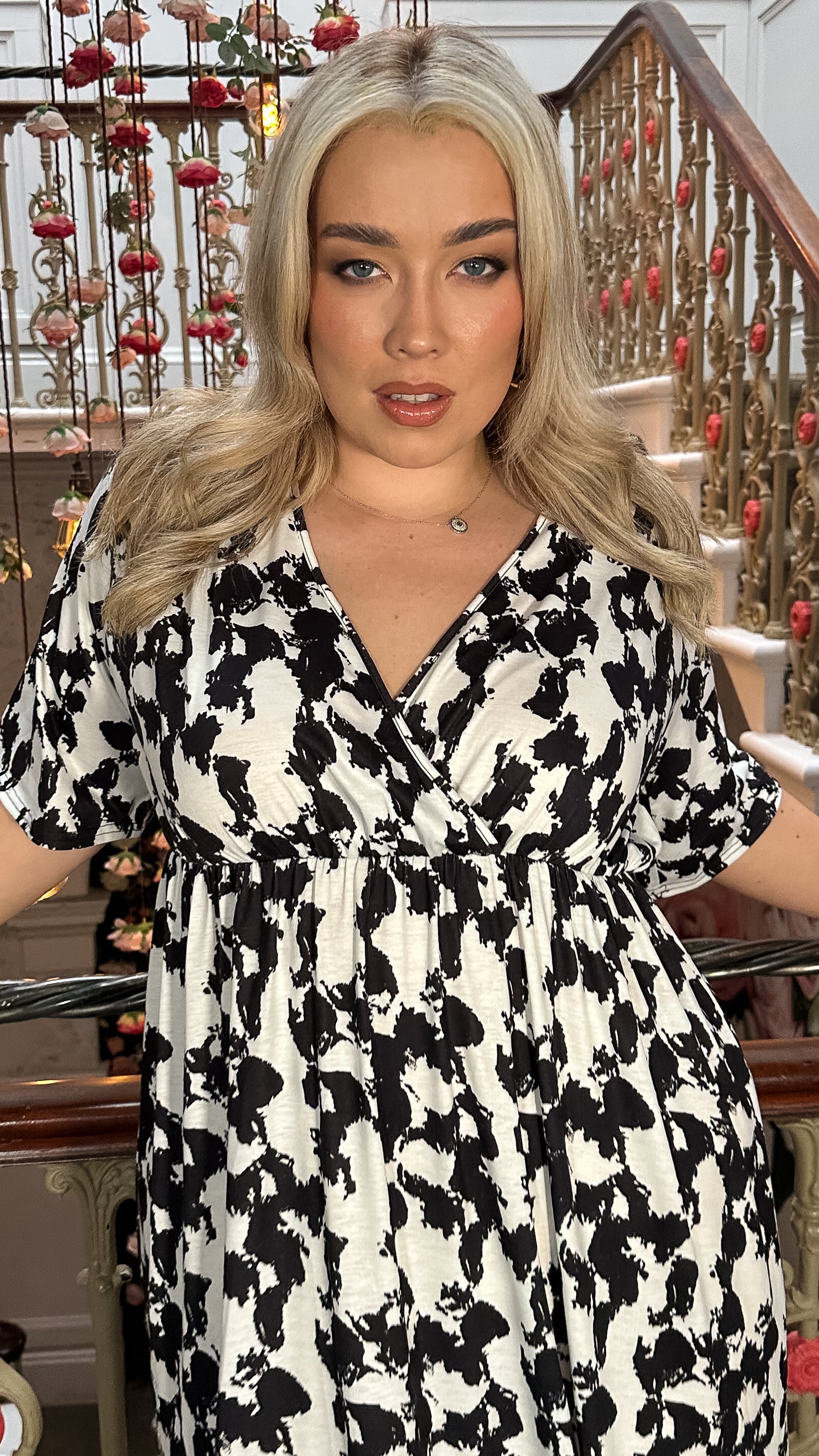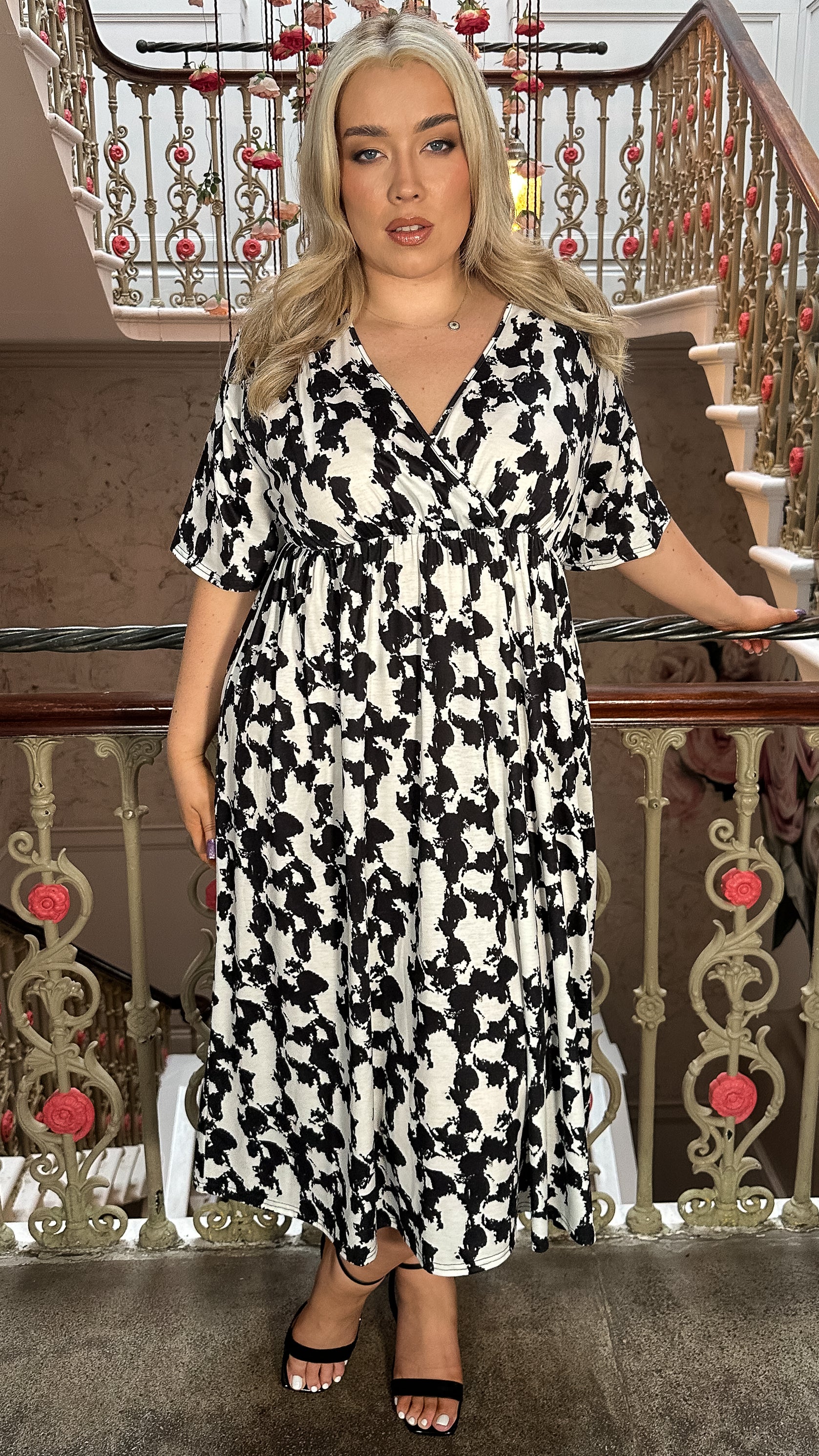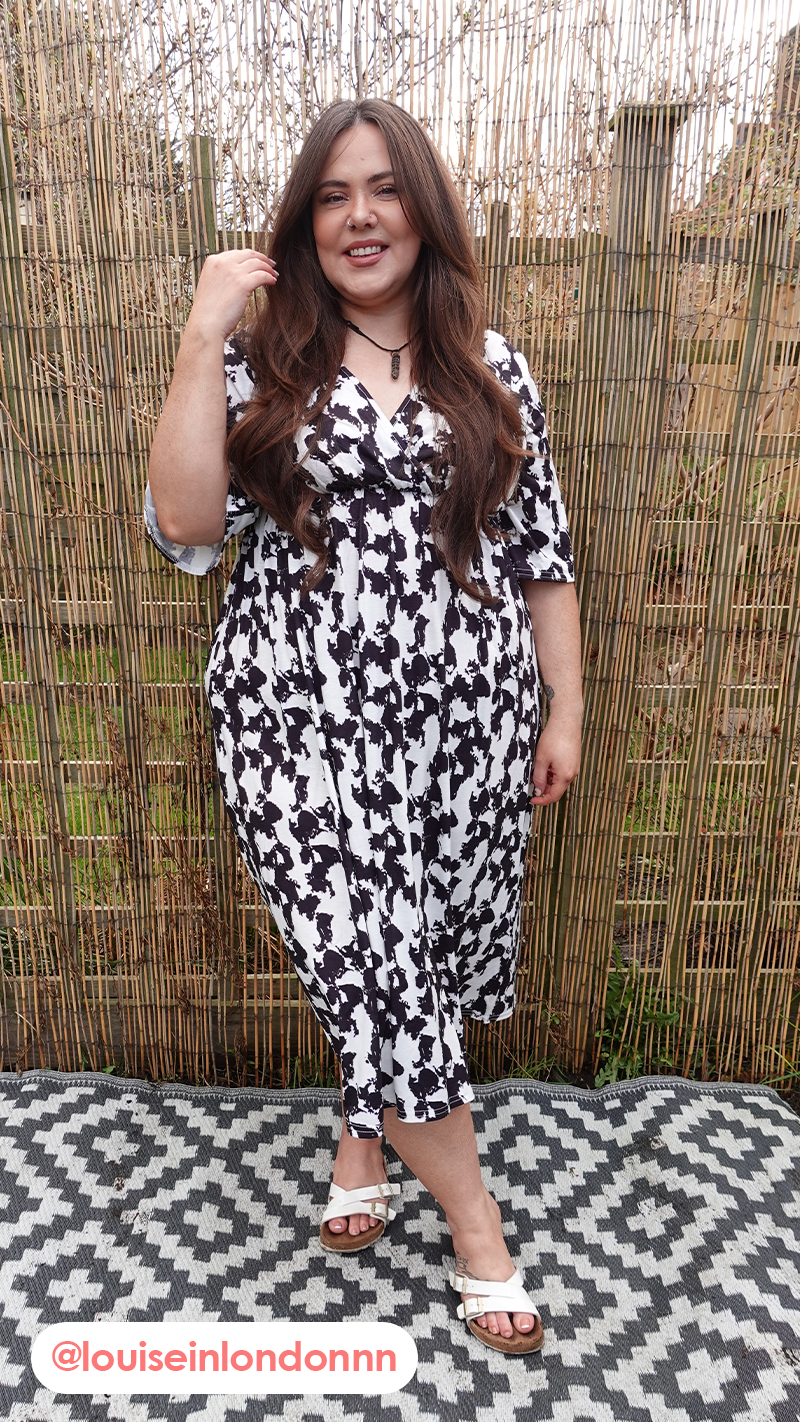 CurveWow Wrap Midi Dress Black White Abstract