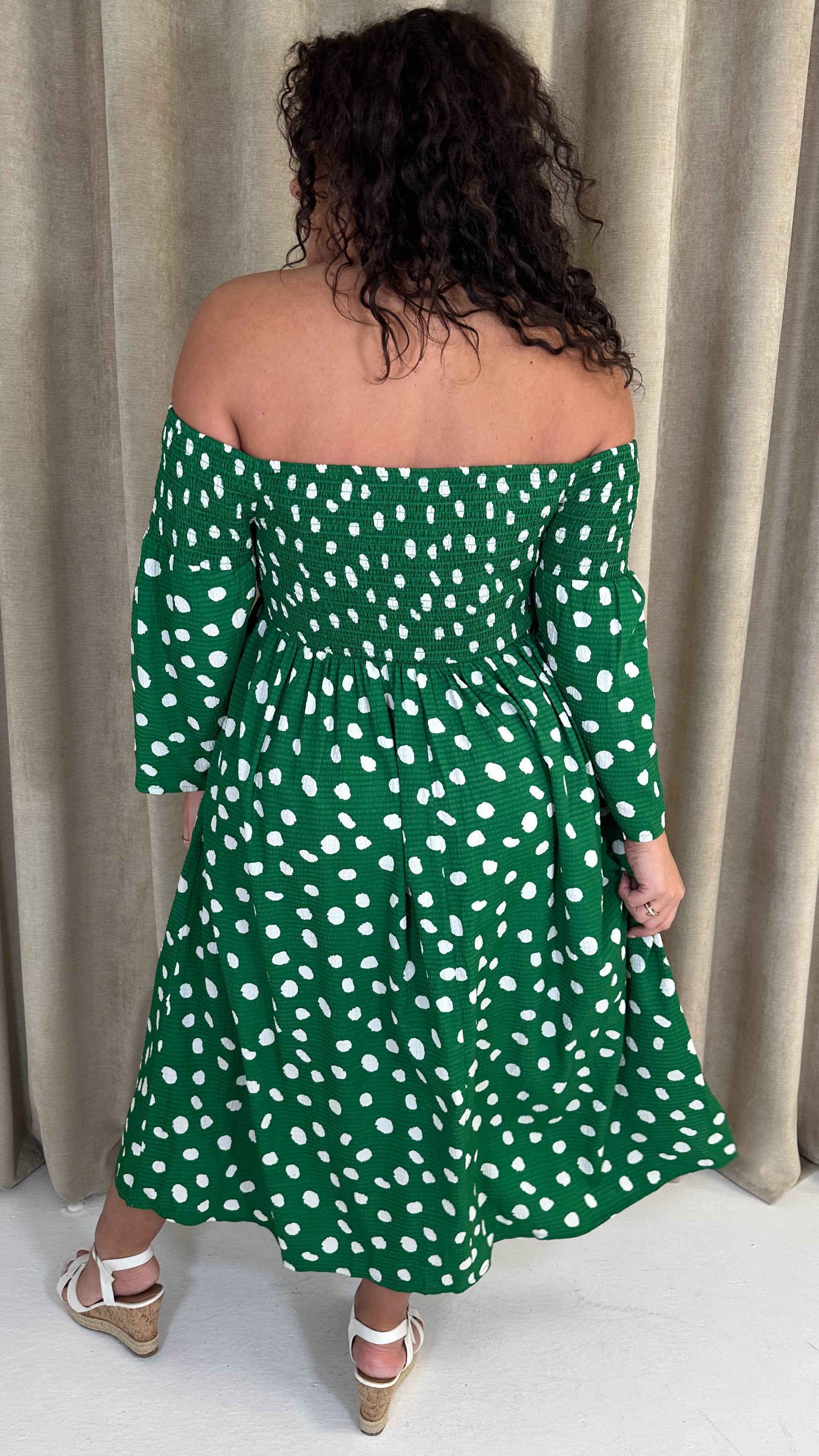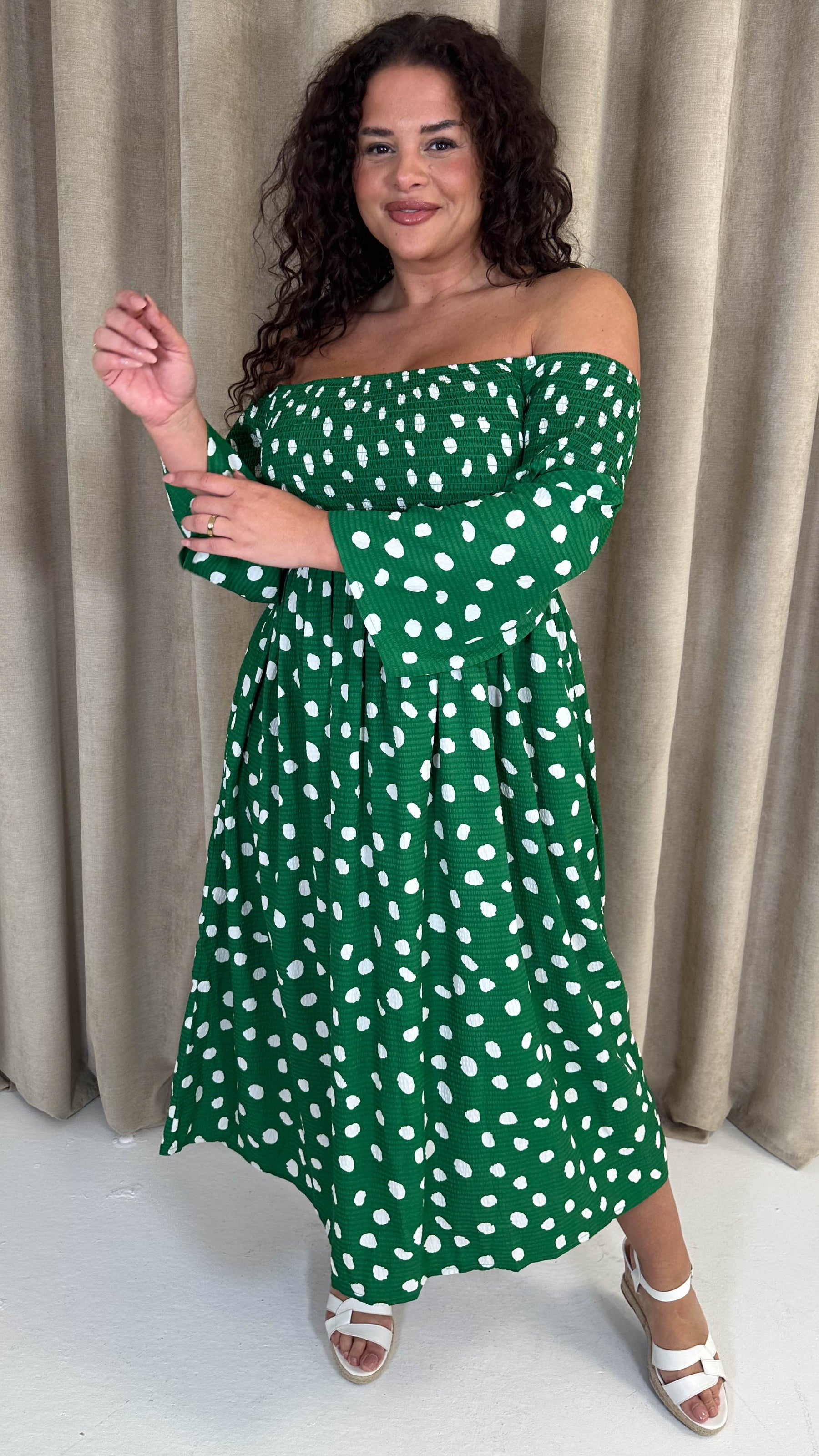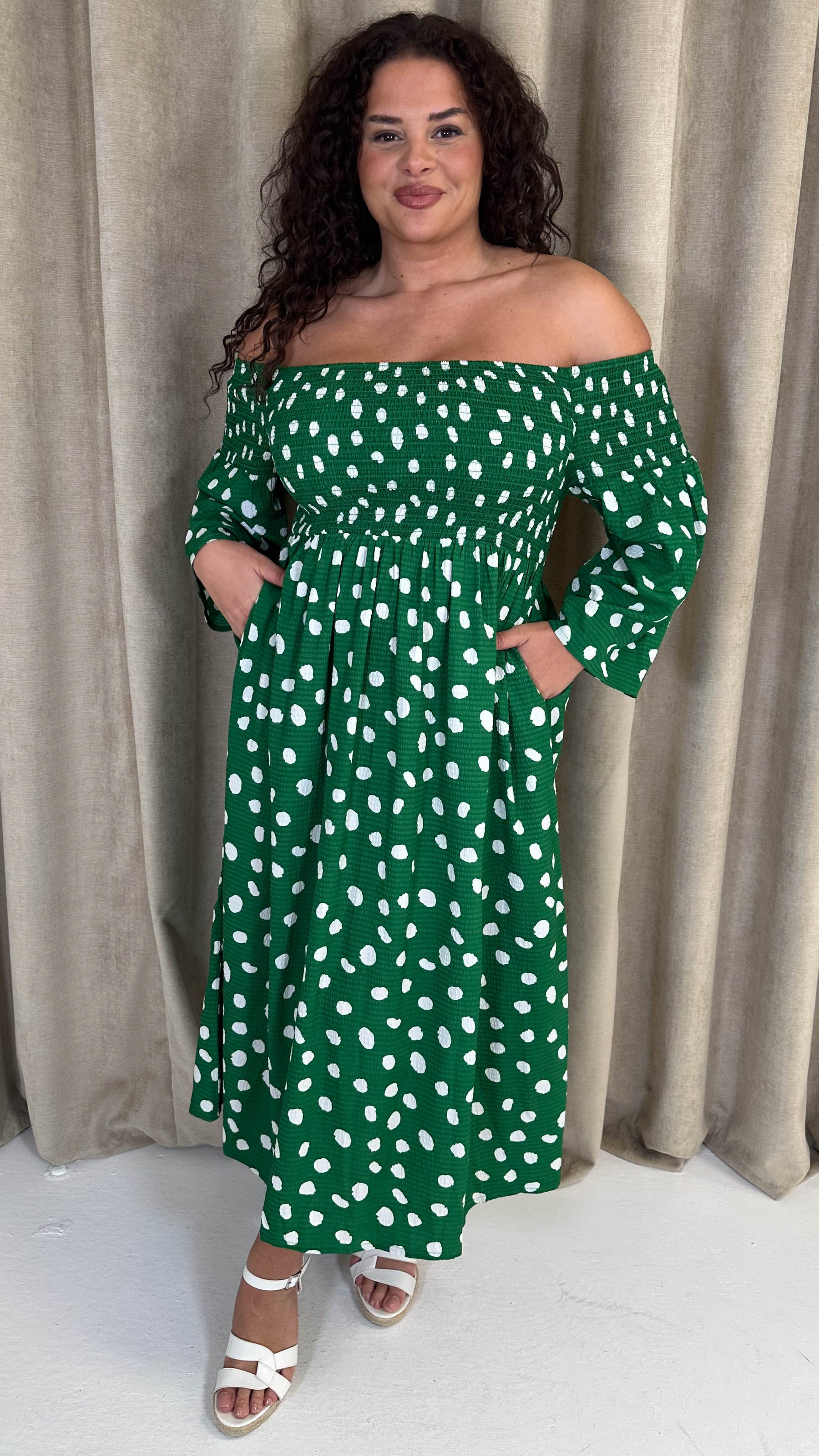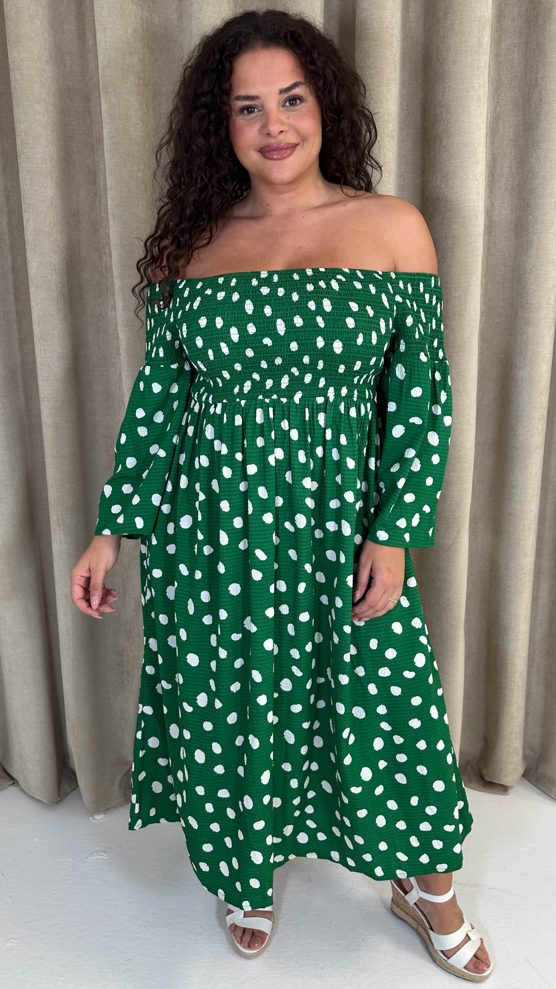 CurveWow Bardot Shirred Midaxi Dress Green Spot