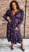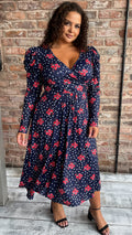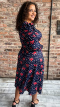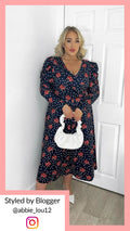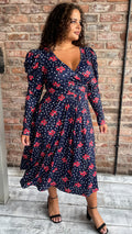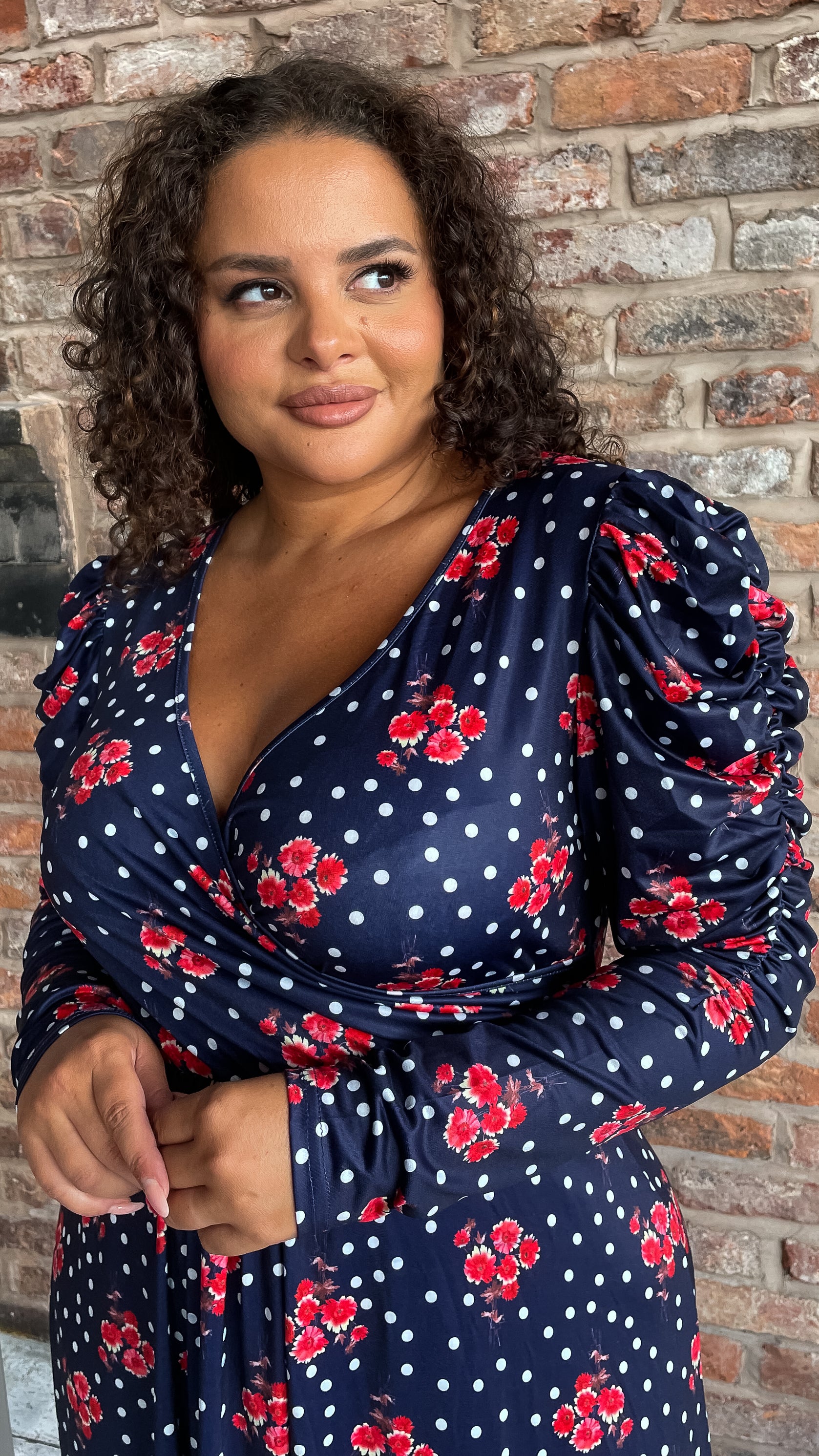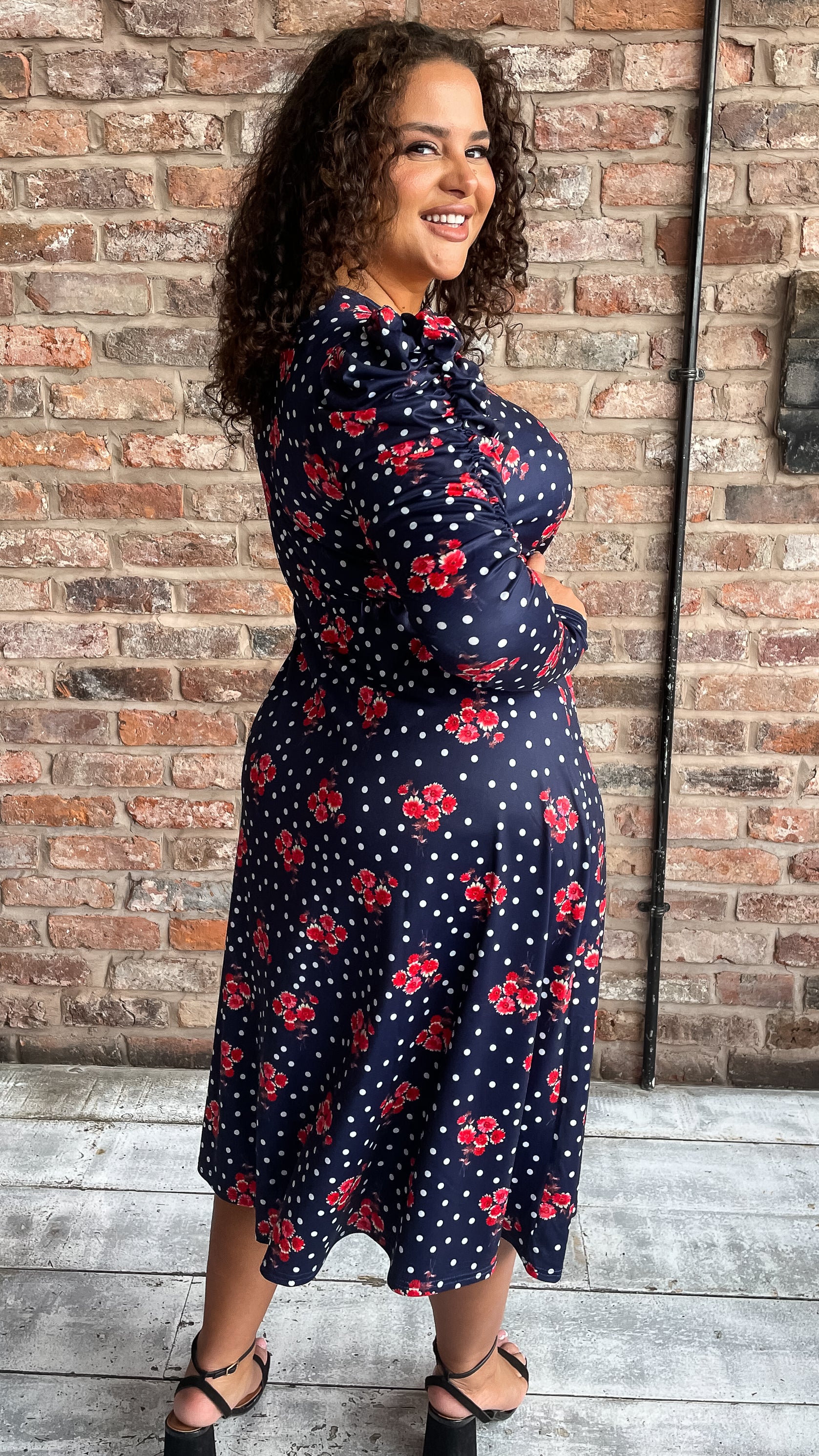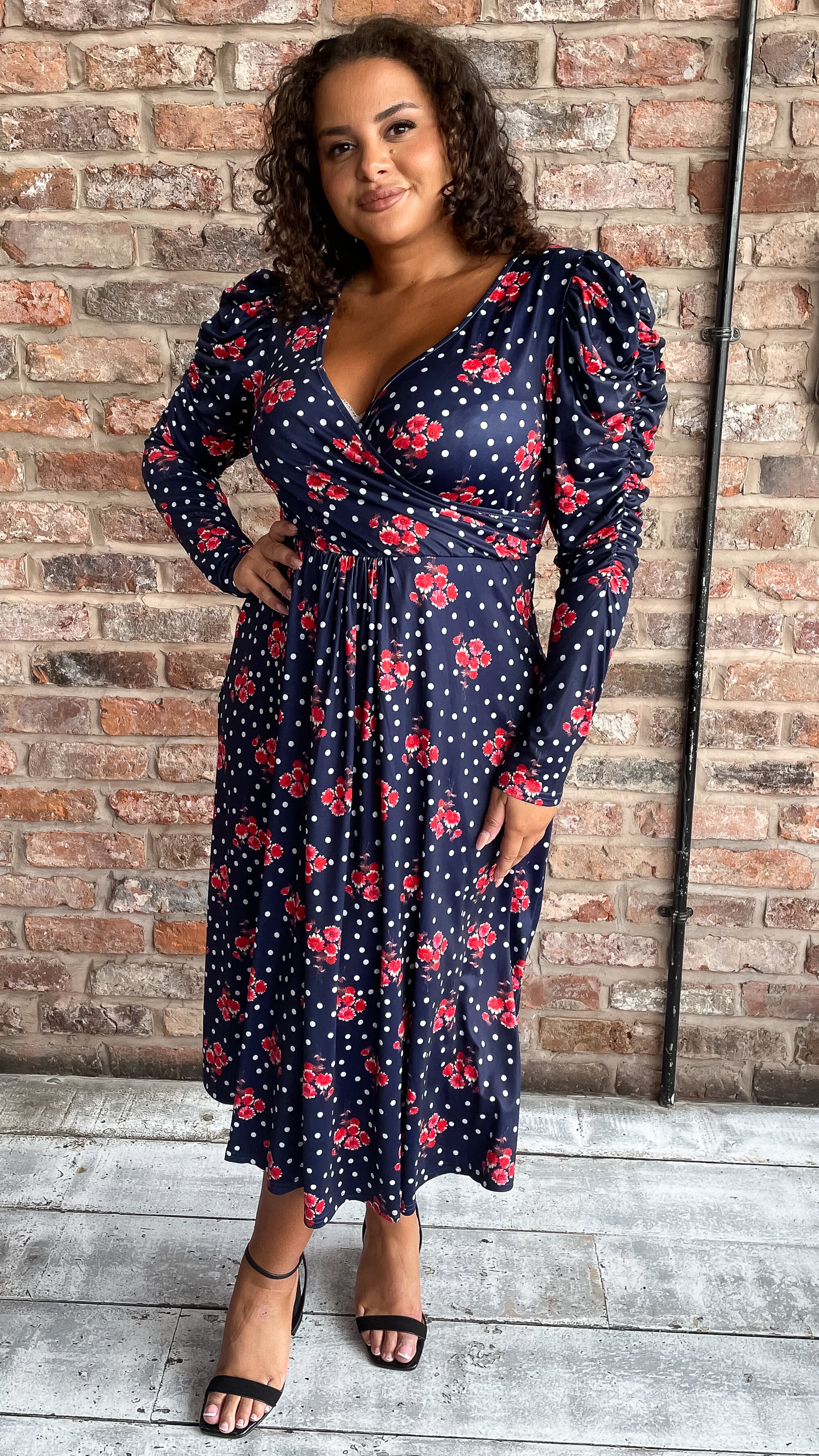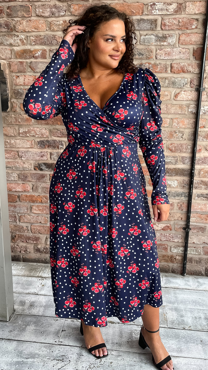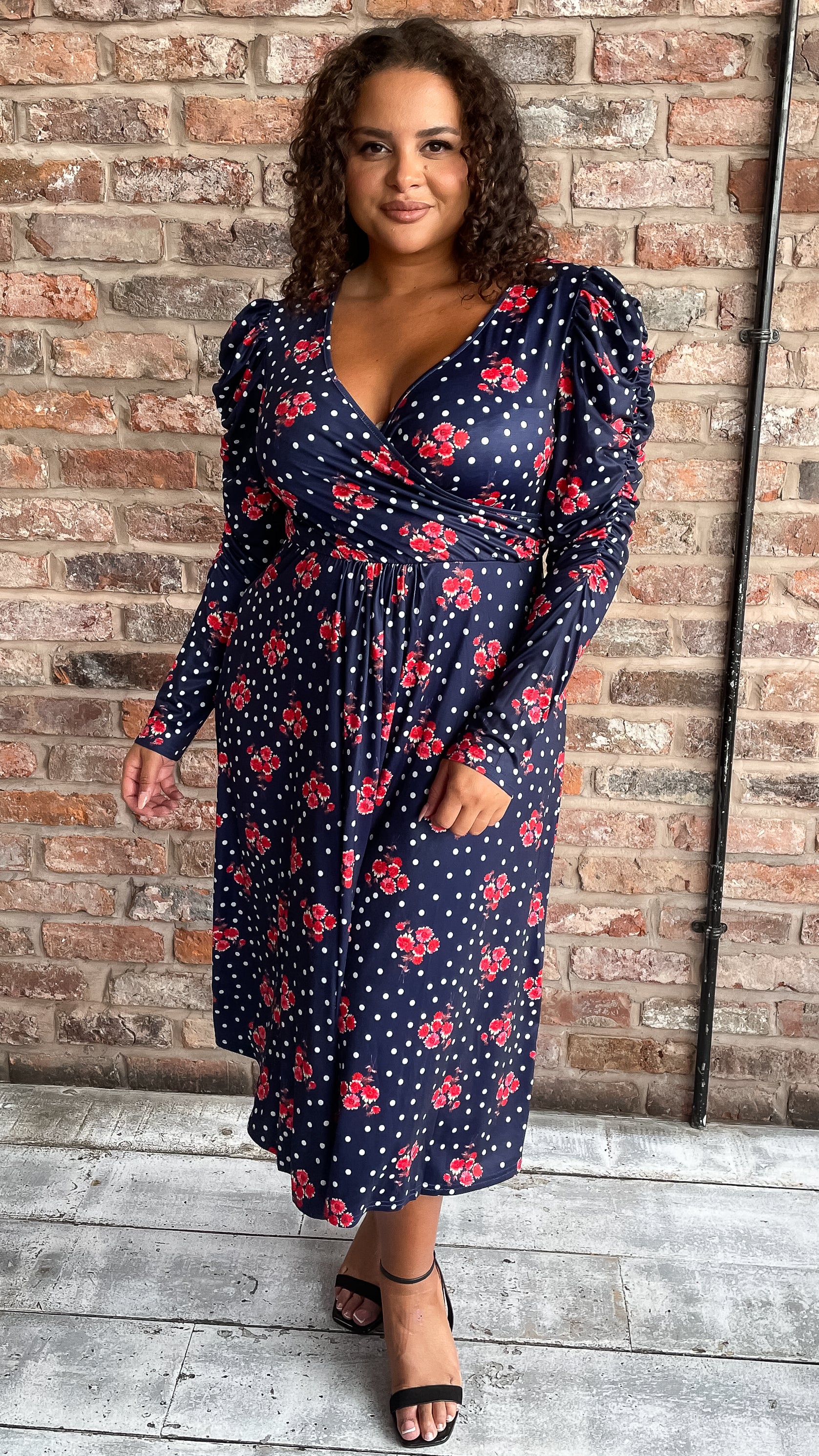 CurveWow Balloon Sleeve Midi Dress Navy Spot Floral