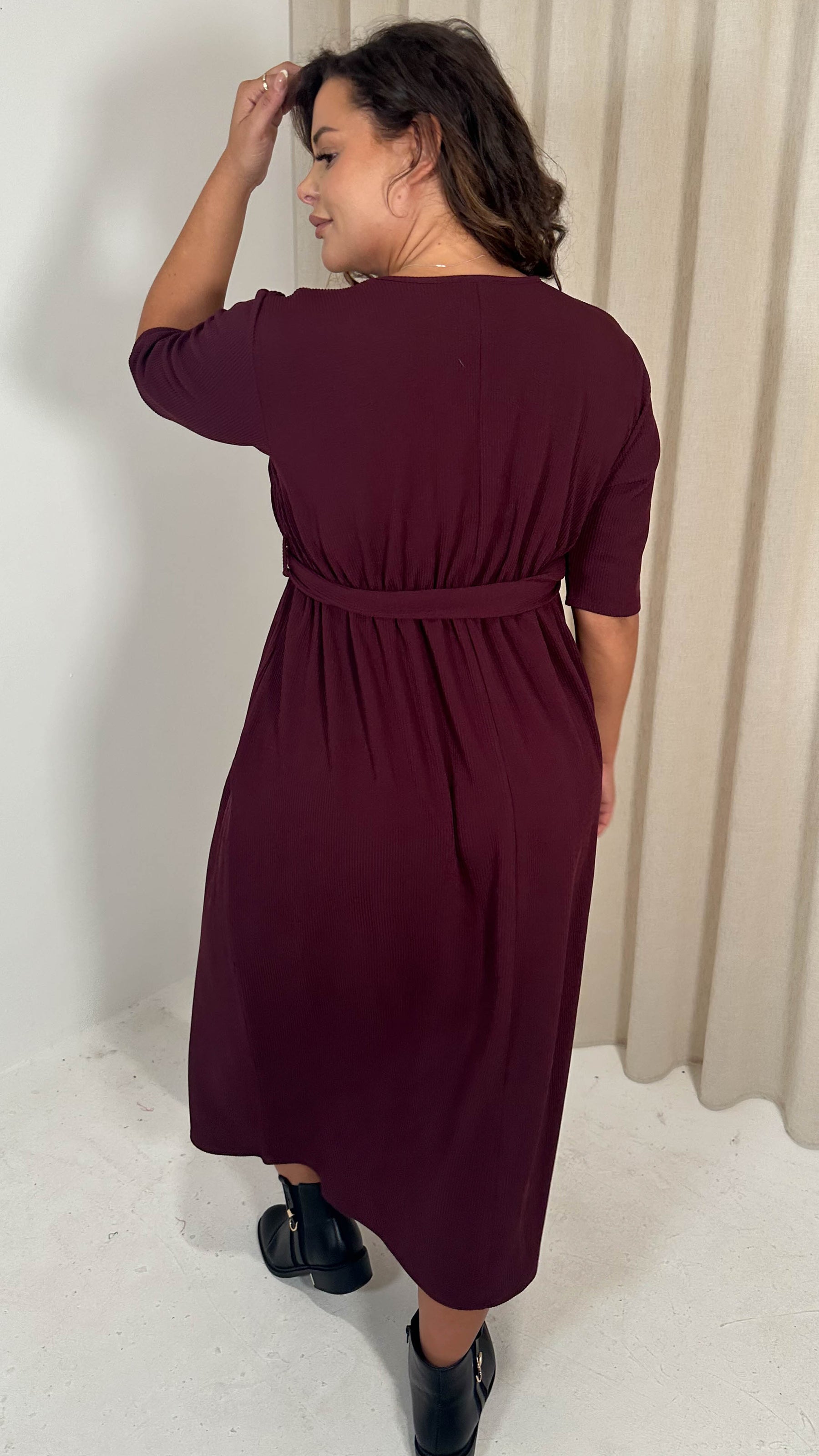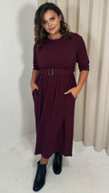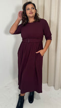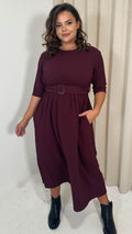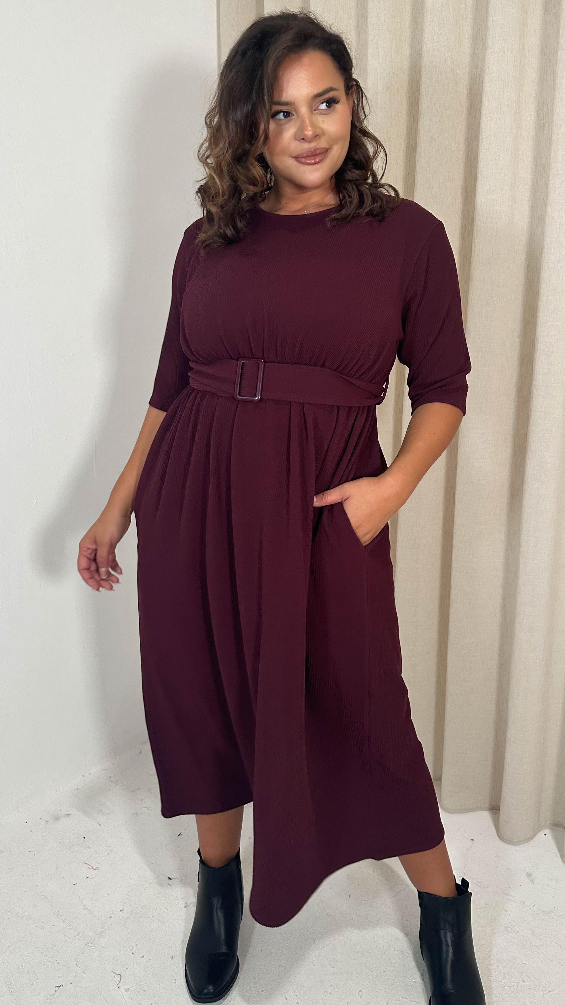 CurveWow Textured Elbow Sleeve Belted Pocket Midi Dress Wine